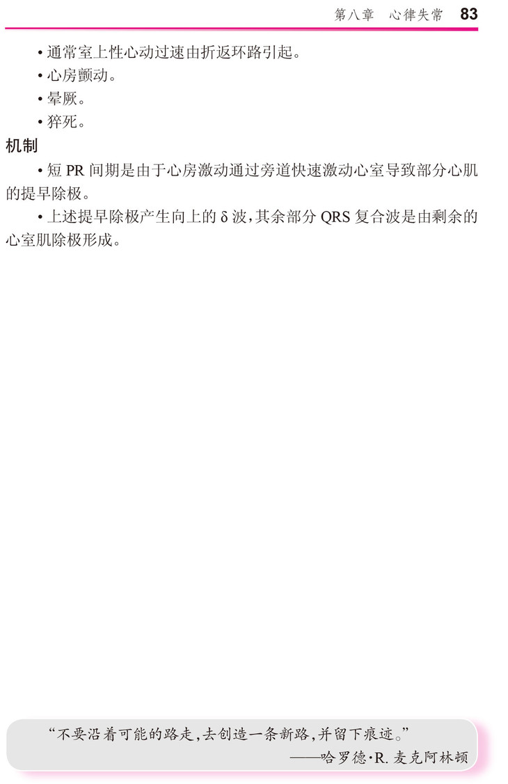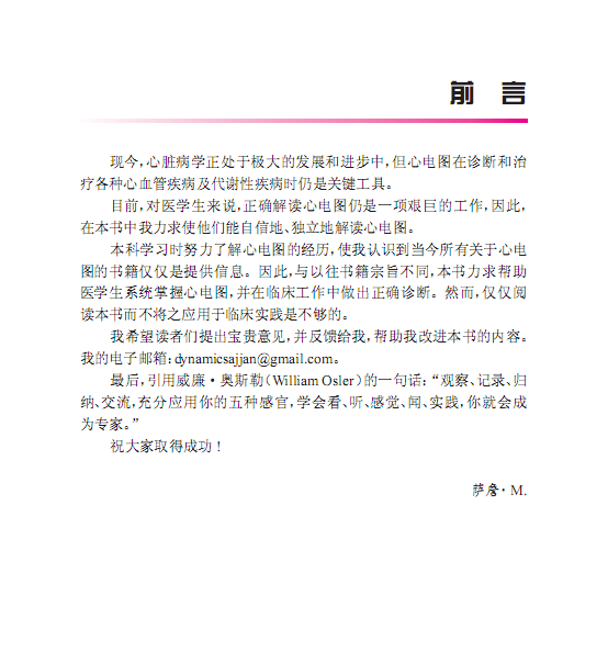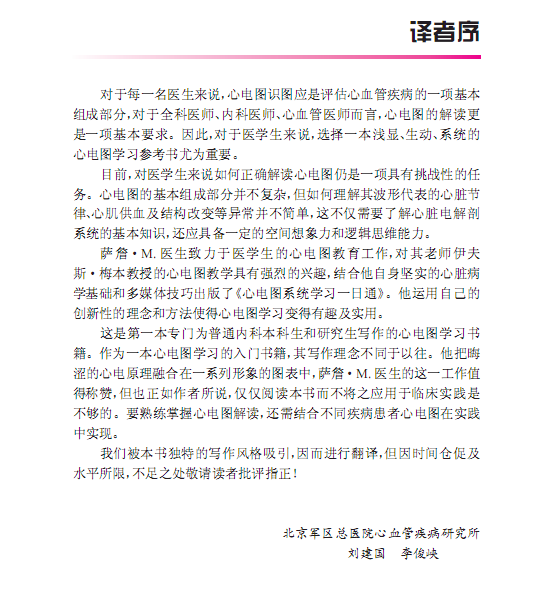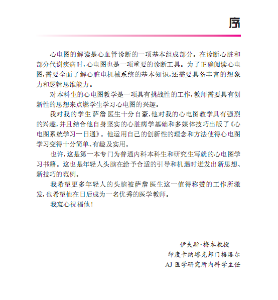 2 心脏病学正取得极大的发展和进步,但心电图在管理各种心血管疾病及代谢性疾病时仍是关键工具。对医学生来说正确解读心电图还是一项艰巨的工作,因此,《心电图系统学习一日通》力求使他们能自信地、独立地解读心电图。