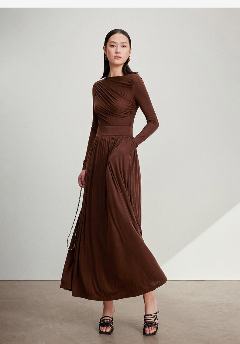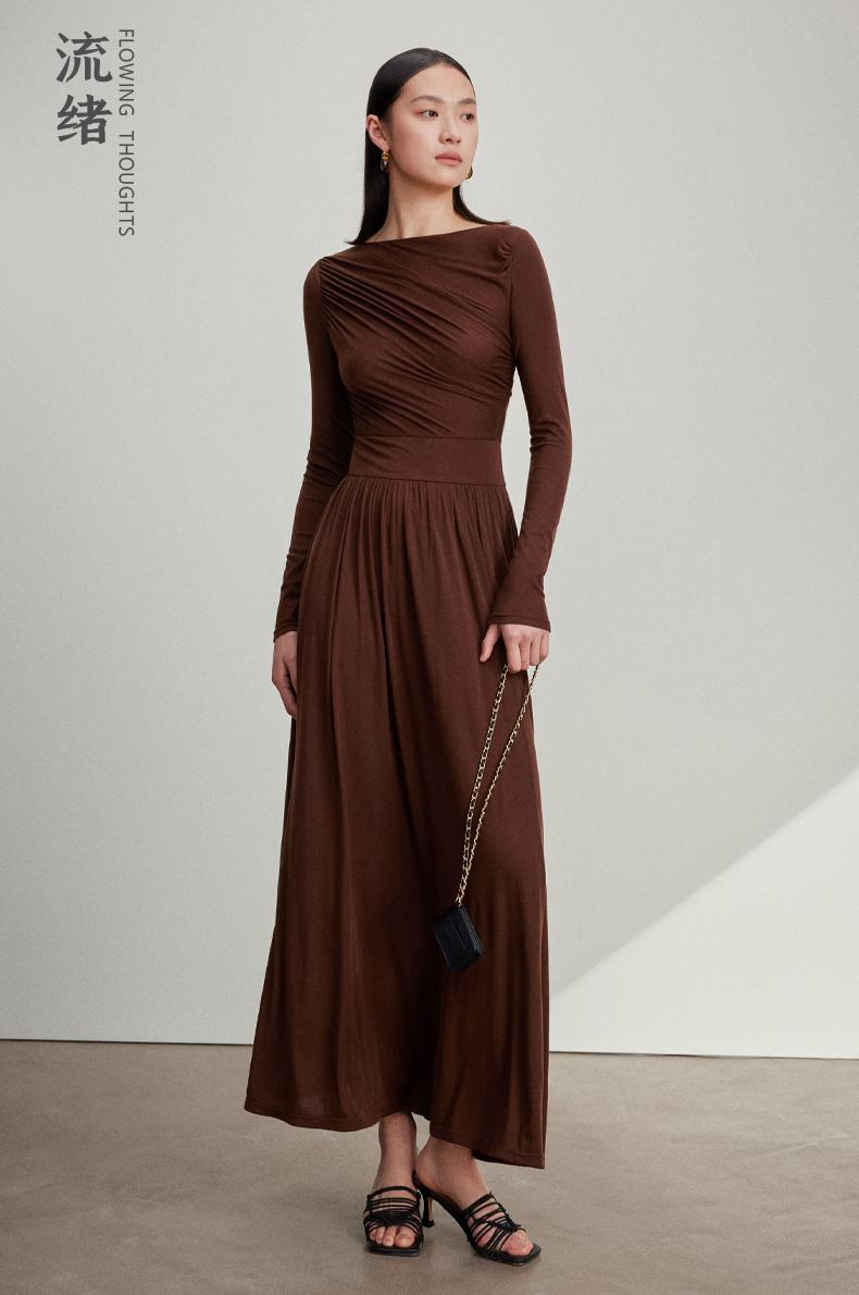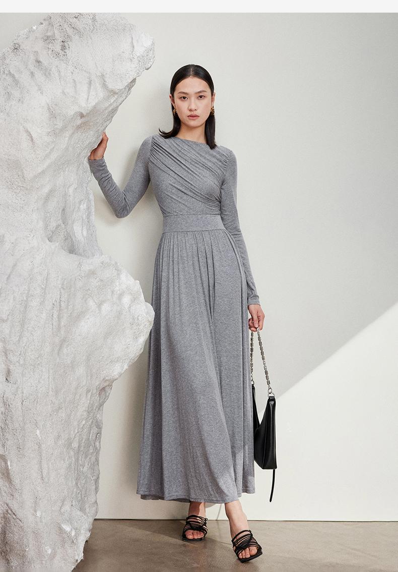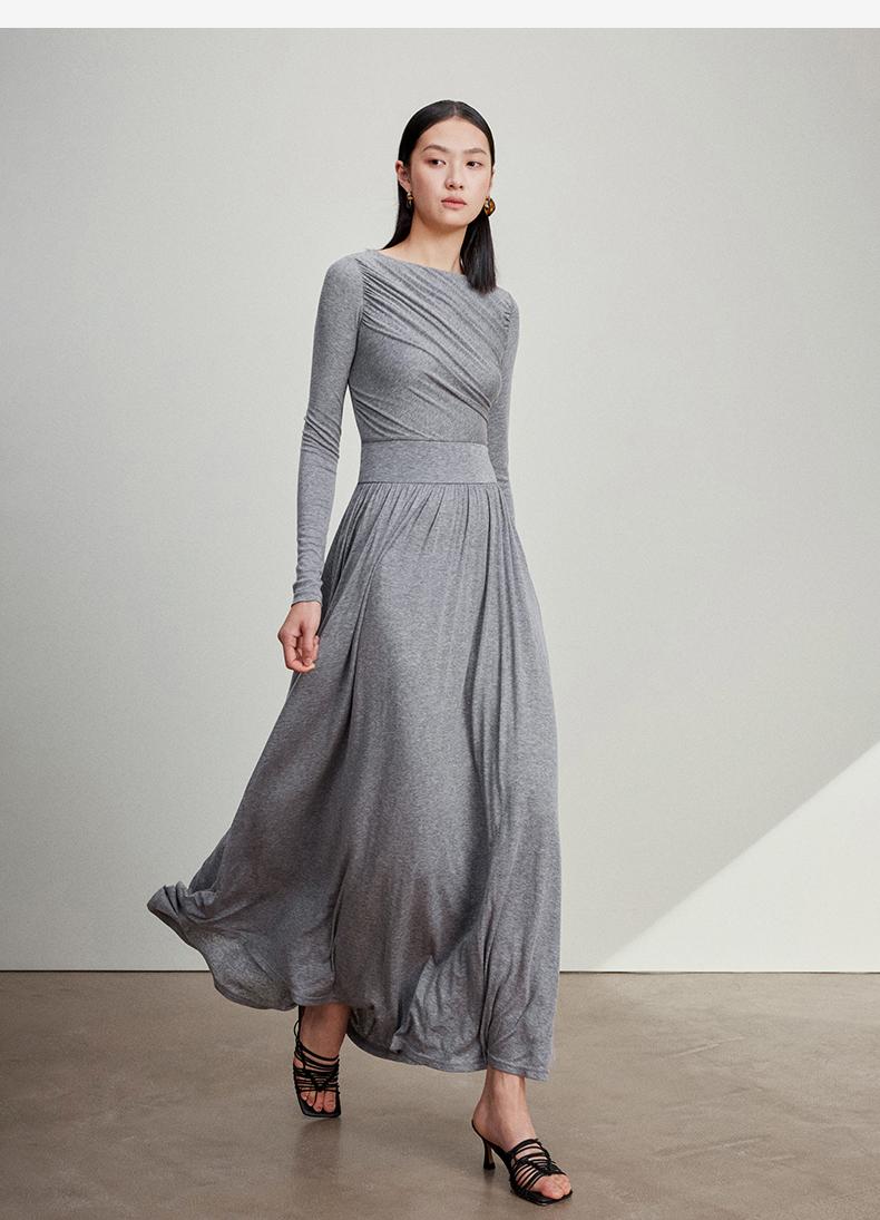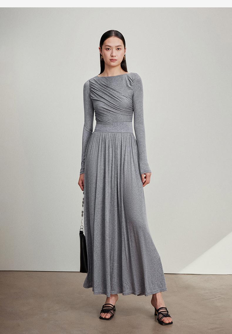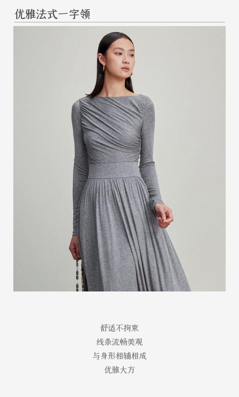 西嘉C+IMPRESS/西嘉抽褶长袖针织连衣裙女士显瘦纸片人天丝一字领LYQ2401081