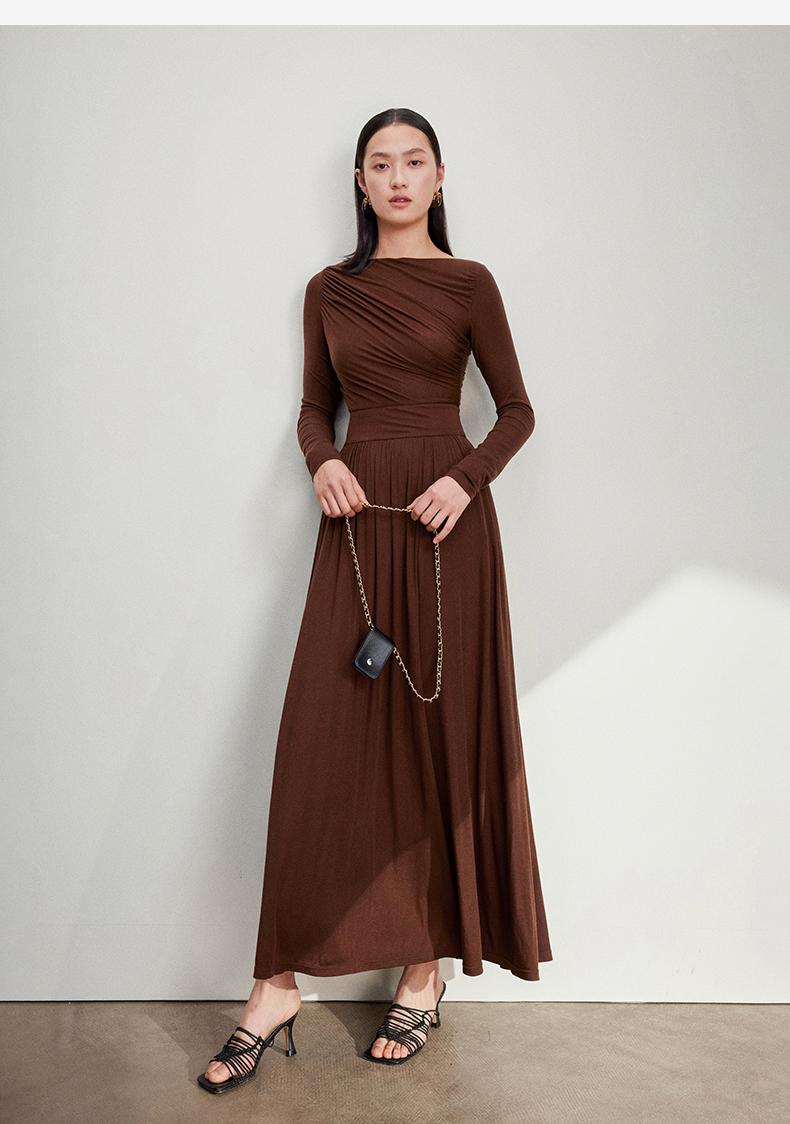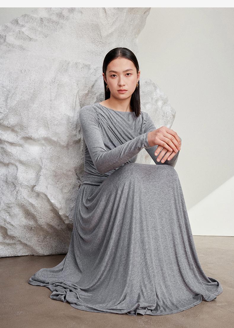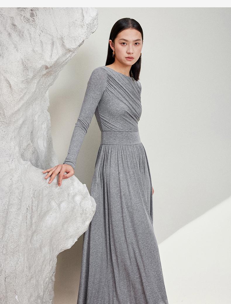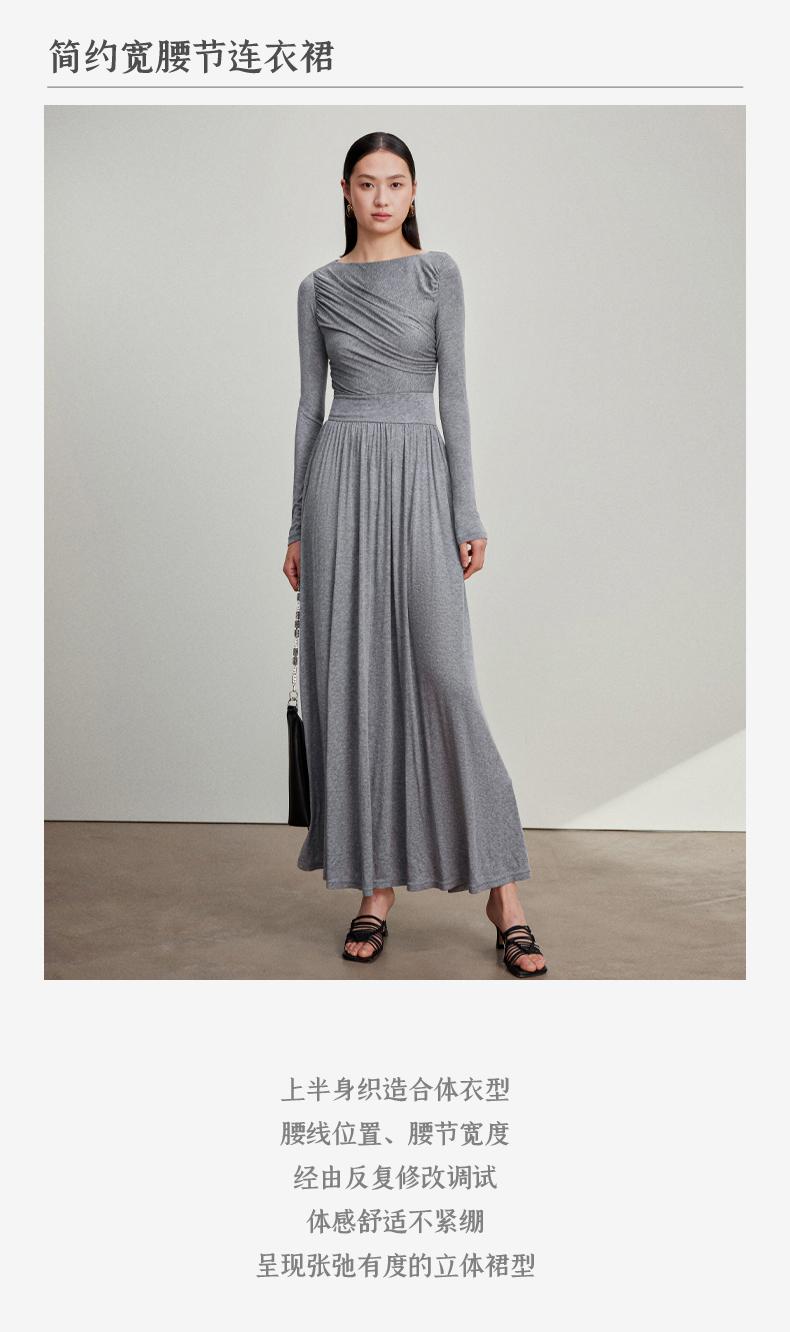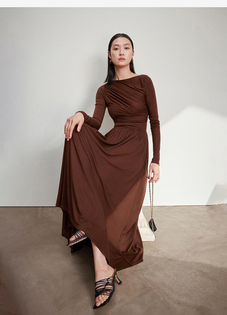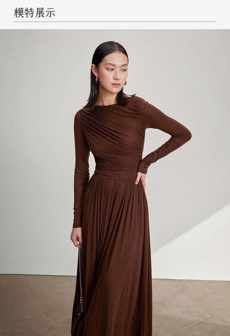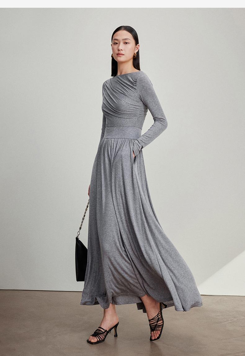 西嘉C+IMPRESS/西嘉抽褶长袖针织连衣裙女士显瘦纸片人天丝一字领LYQ2401081