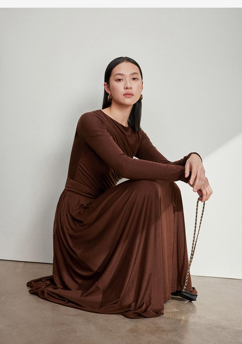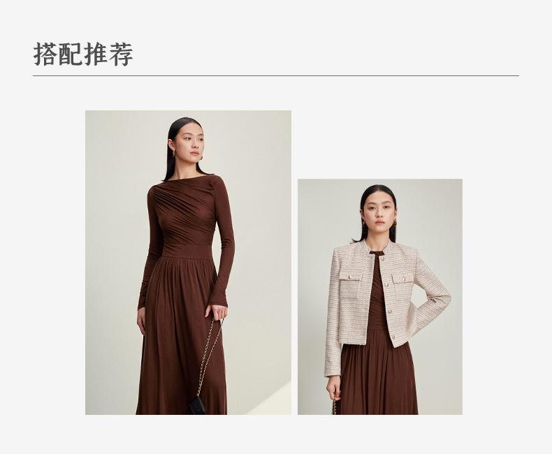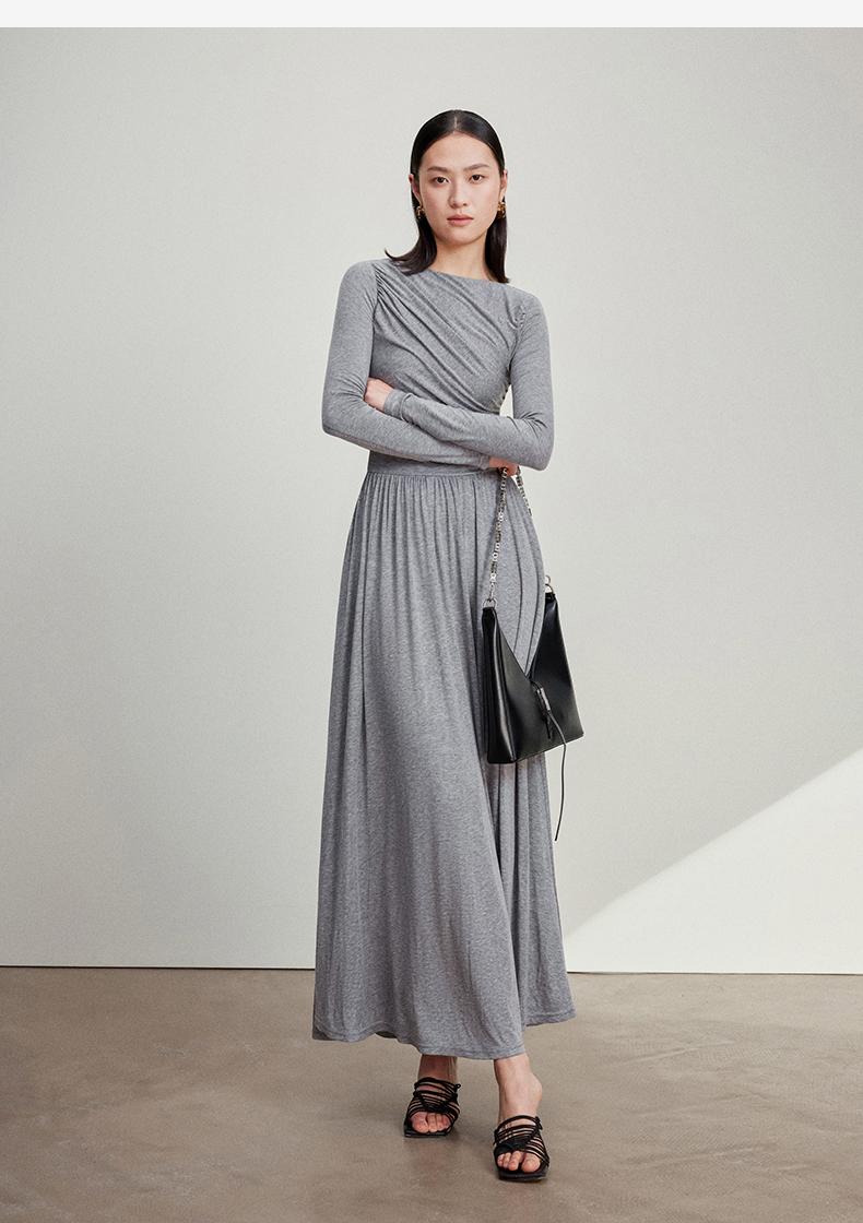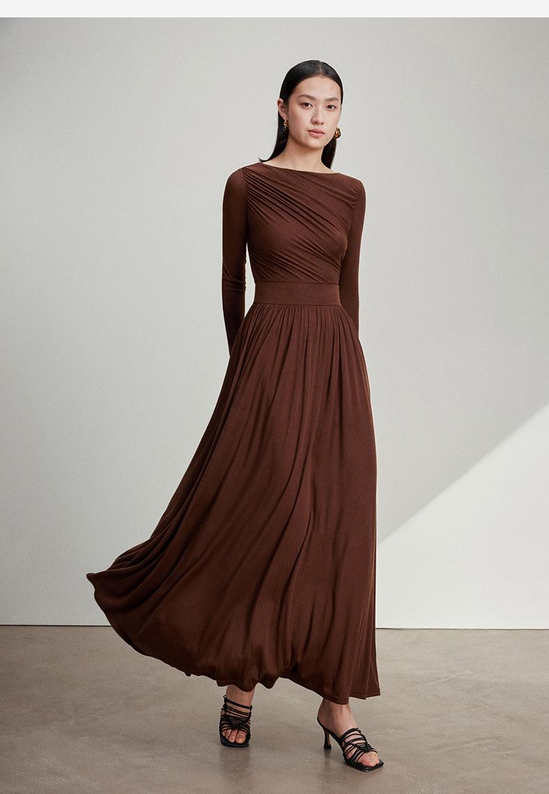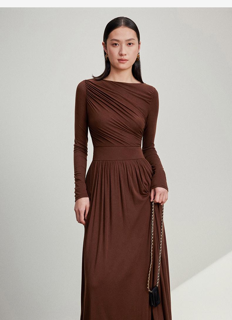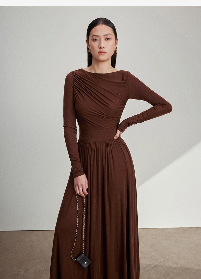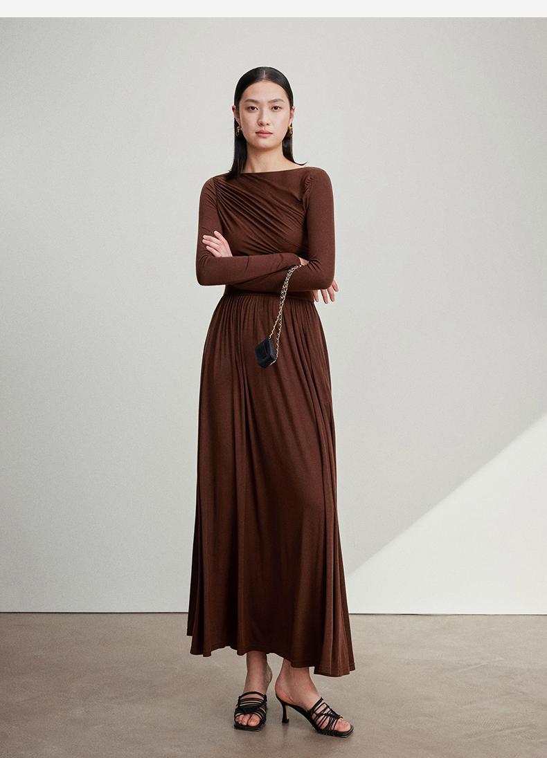 西嘉C+IMPRESS/西嘉抽褶长袖针织连衣裙女士显瘦纸片人天丝一字领LYQ2401081