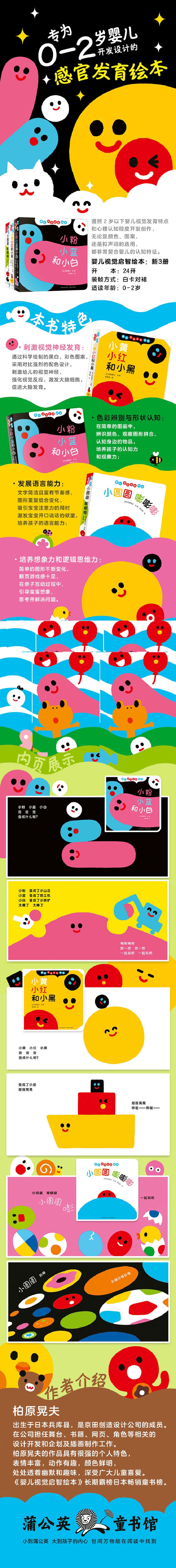 针对0-2岁婴幼儿视觉发育特点、心理认知程度开发设计的先进婴儿读物;通过科学绘制的黑白、彩色图案,结合好玩有趣的认知游戏,刺激婴儿视觉神经发展,让宝宝更清楚的辨识图形、发展颜色分辨力、强化视觉反应,促进大脑发育。书中画面可爱,色彩饱满,文字简洁且富有节奏感,不仅可以刺激宝宝的视觉发育,而且能吸引宝宝注意力,激发宝宝开口说话的欲望。