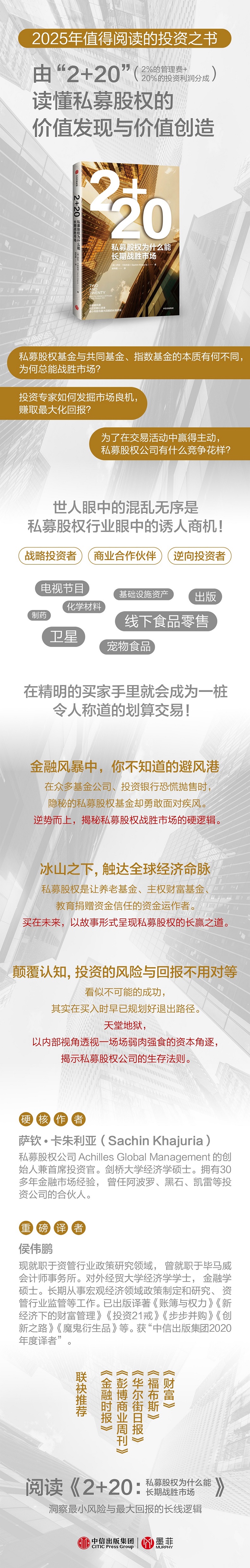 萨钦·卡朱利亚认为私募股权值得解读……交易草图提供了有关私募股权基金结构的有用信息。卡朱利亚以故事形式展示了私募股权目前运作的广泛行业和交易……他认为私募股权太大,已经深入人们的生活,无法阻止。这可能是《2+20:私募股权为什么能长期战胜市场》有说服力的观点。——《华尔街日报》