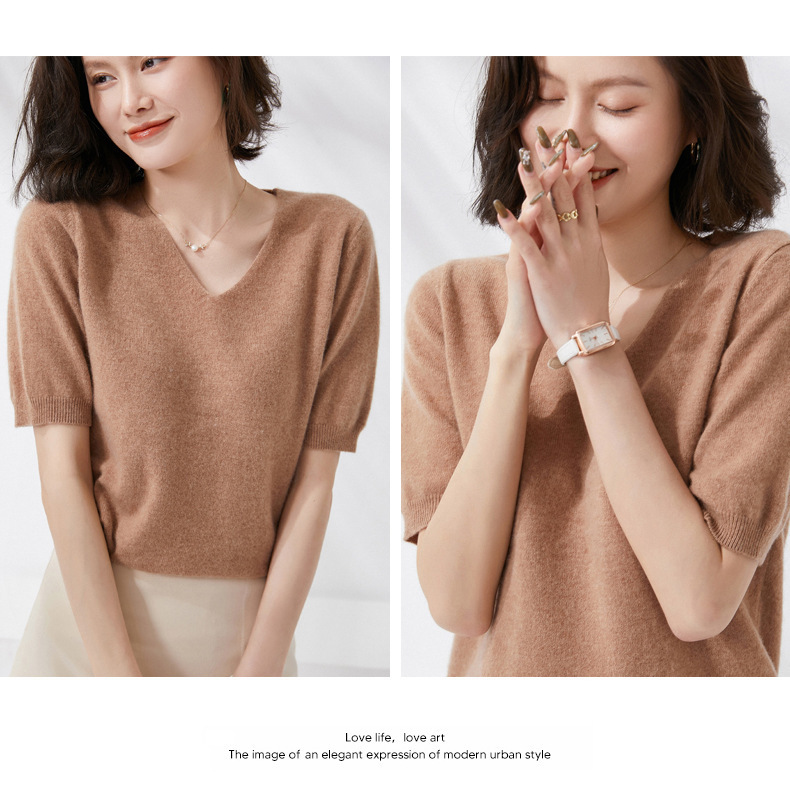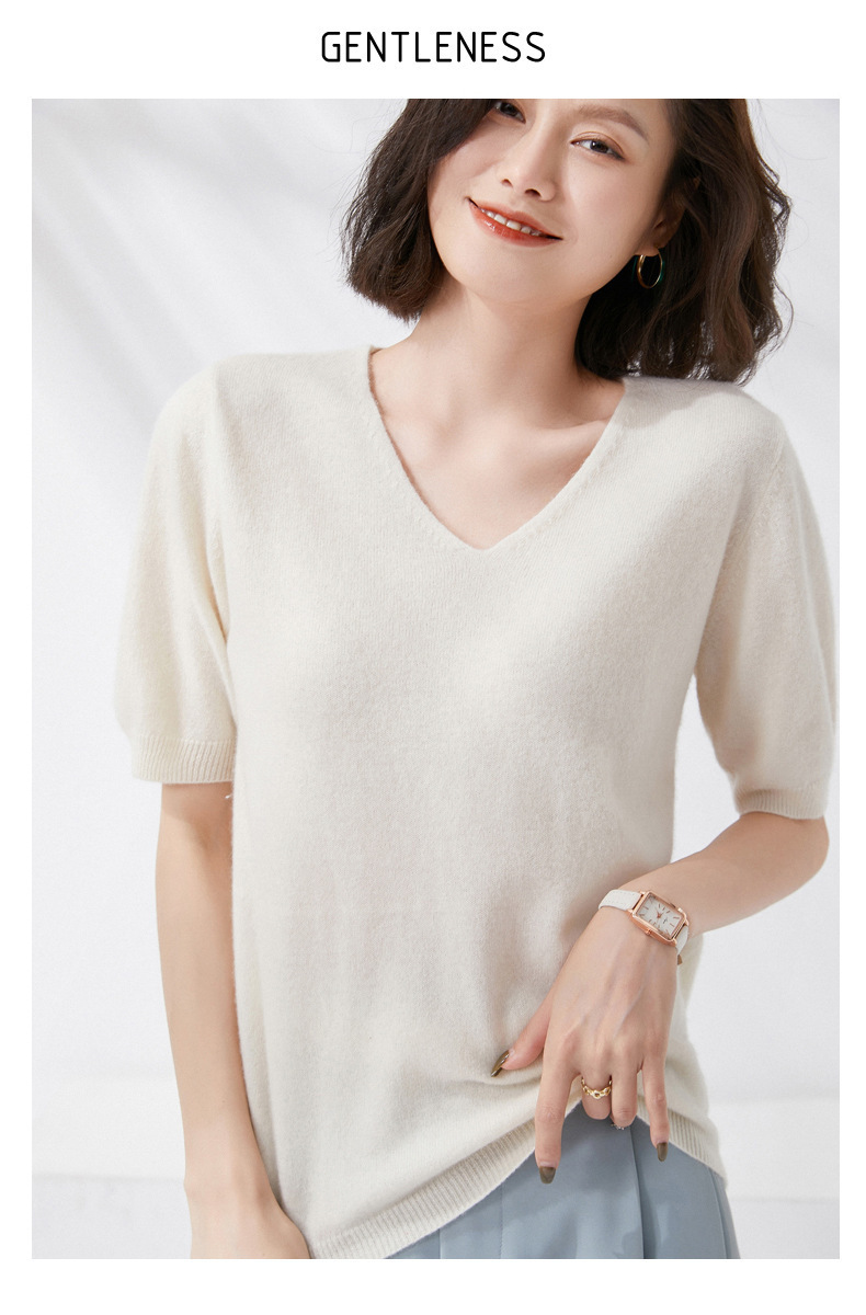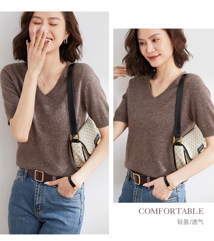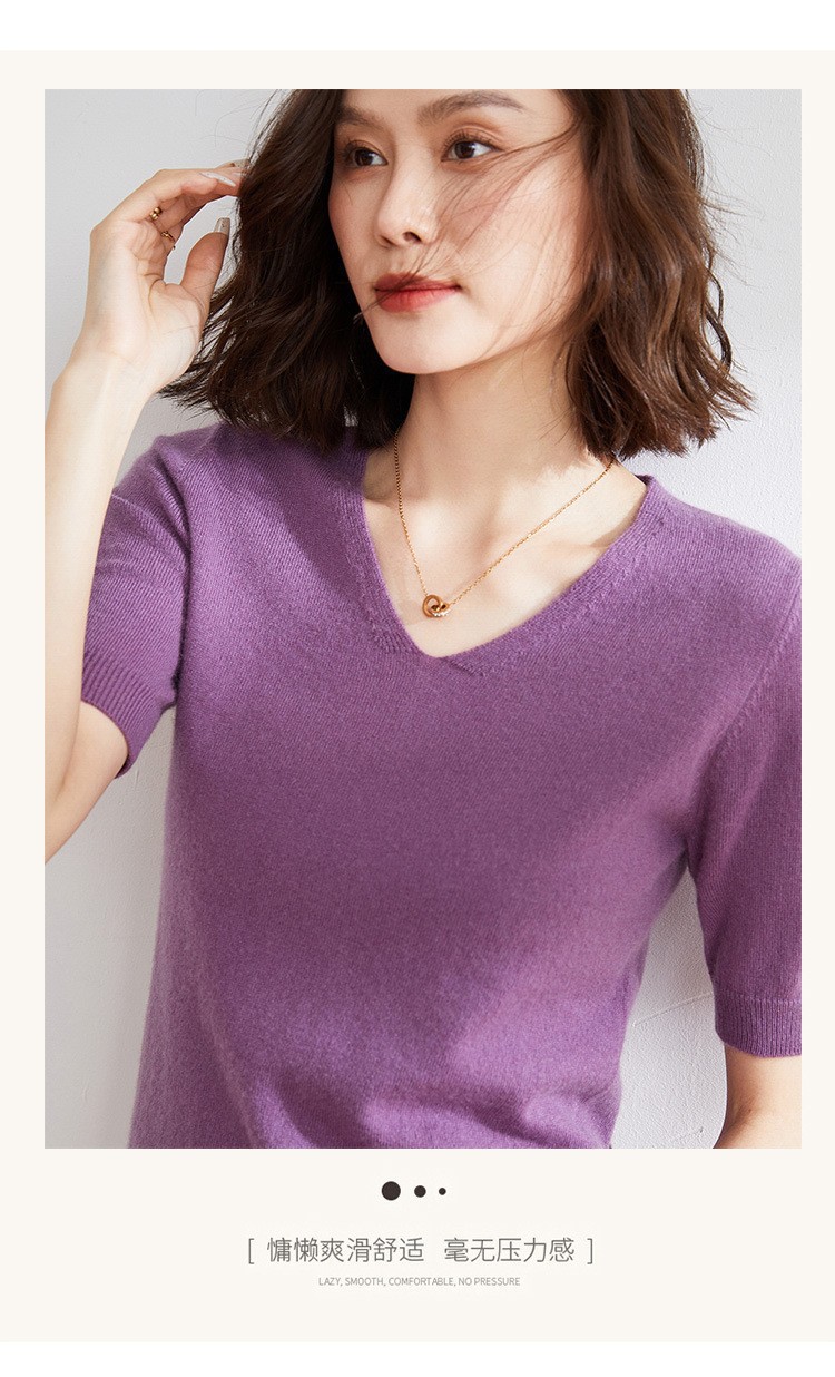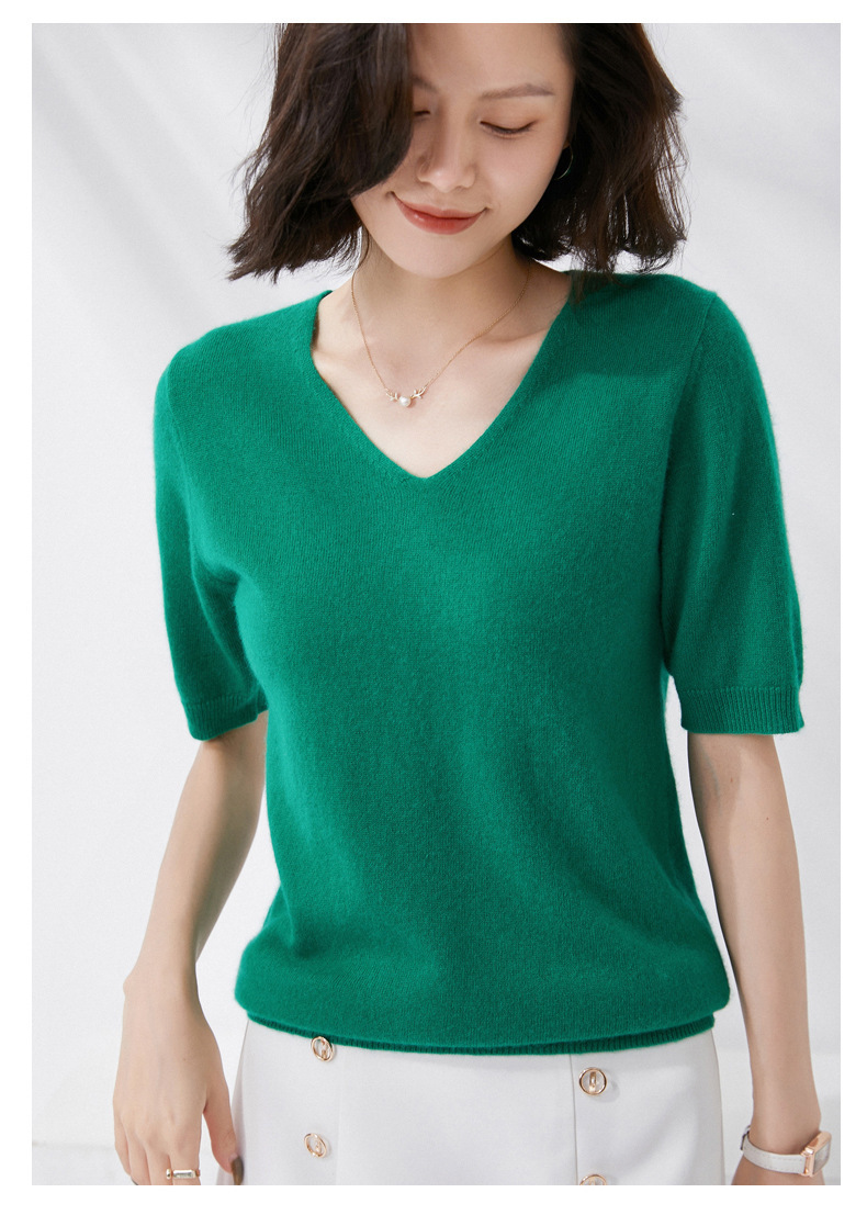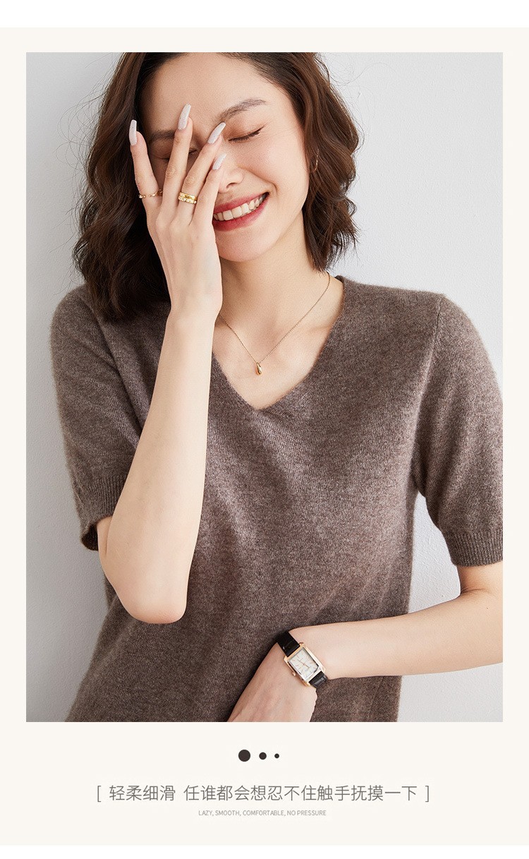 夏季新款韩版V领简约短袖100%纯羊毛衫女针织打底衫羊毛休闲毛衣