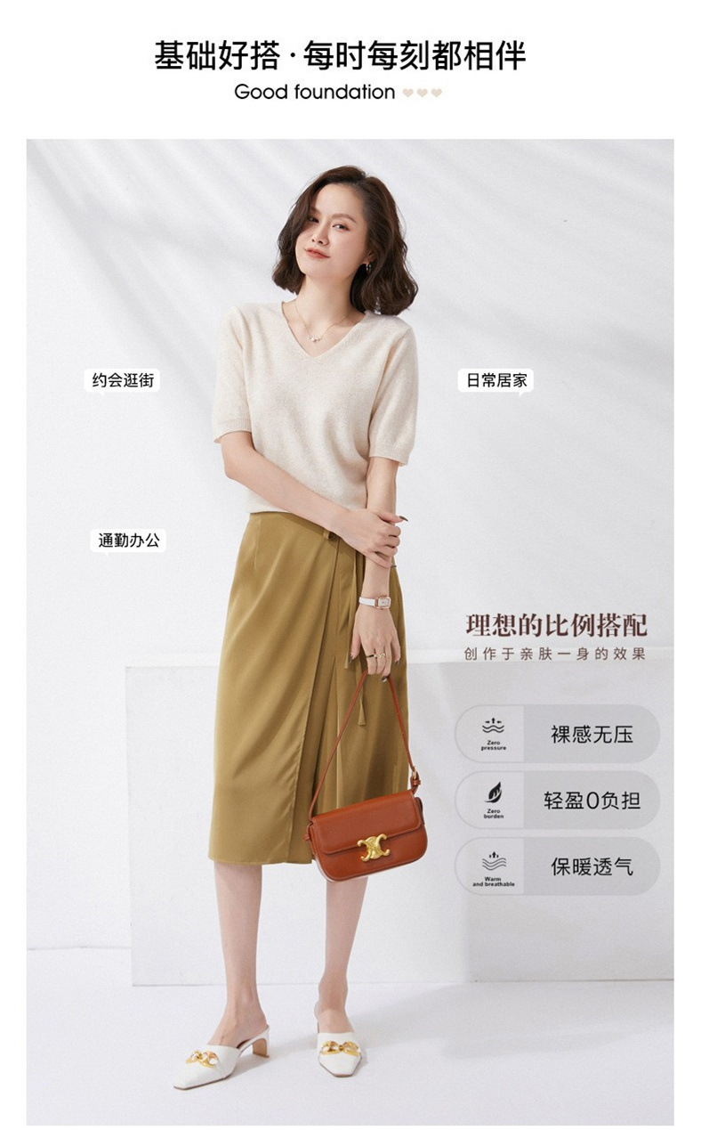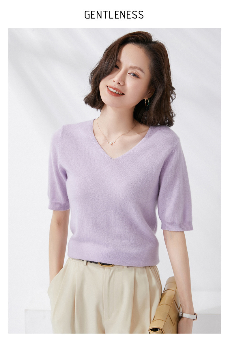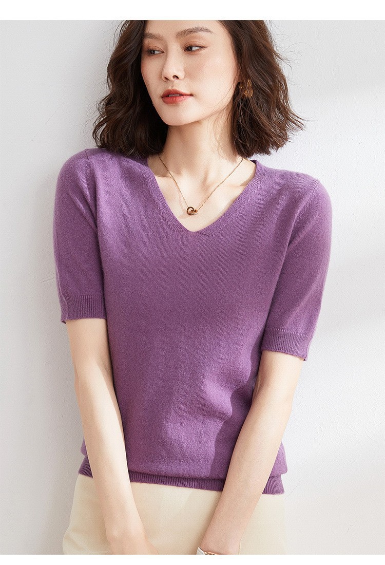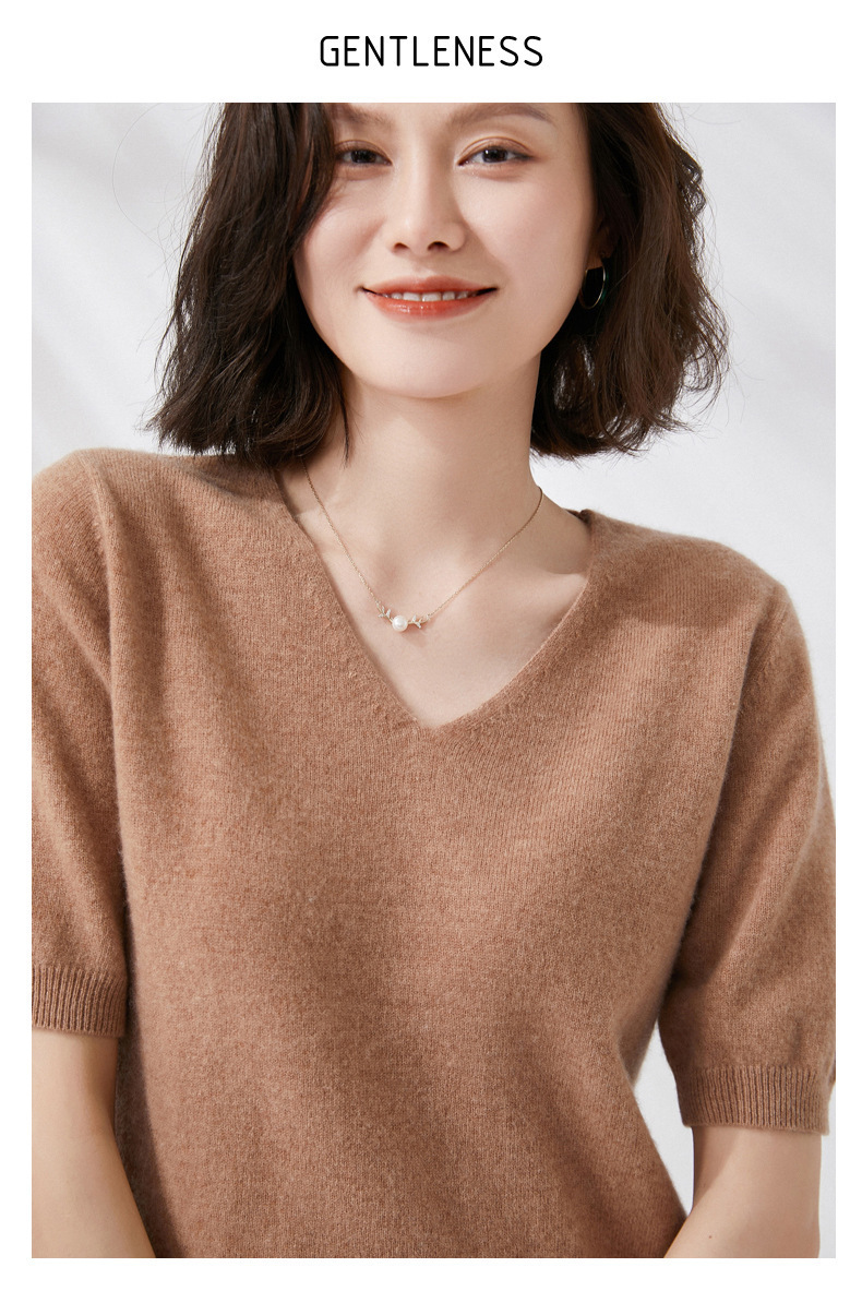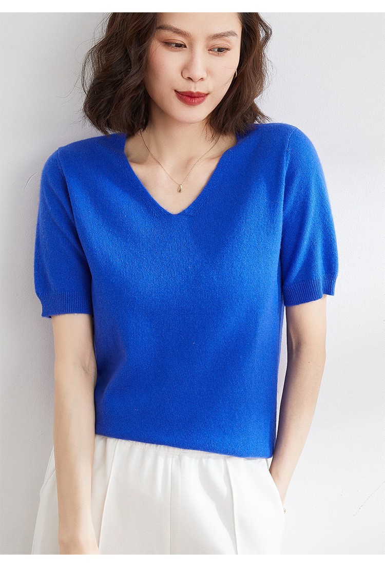 夏季新款韩版V领简约短袖100%纯羊毛衫女针织打底衫羊毛休闲毛衣