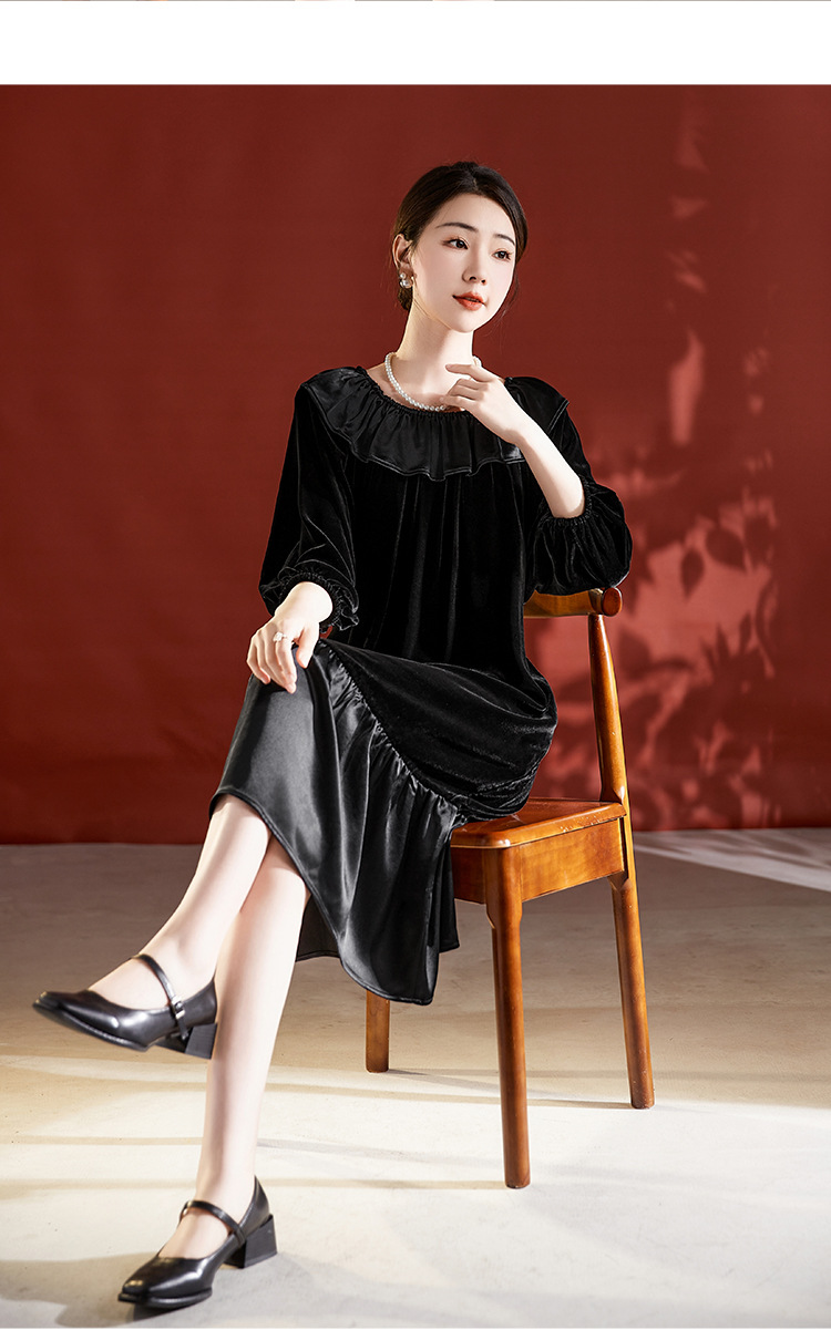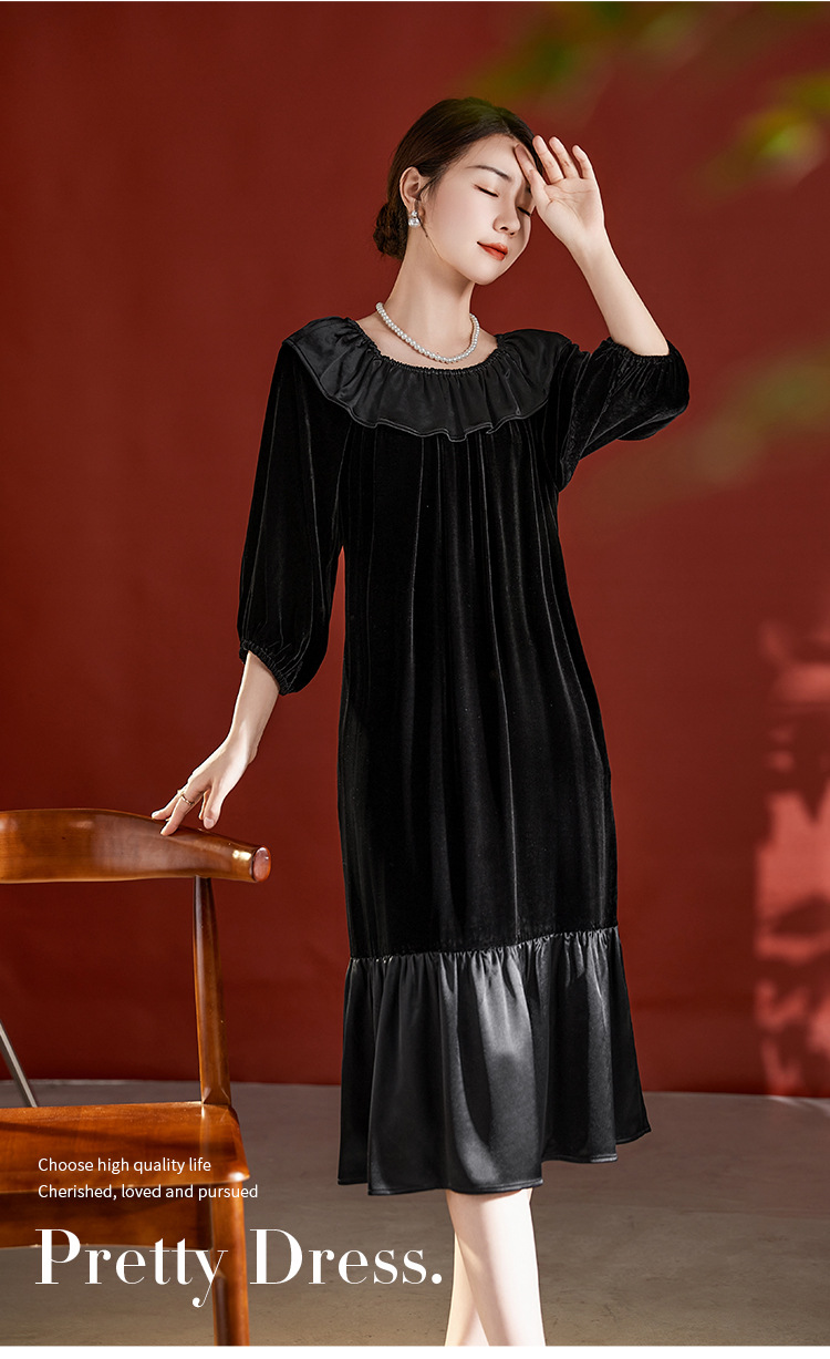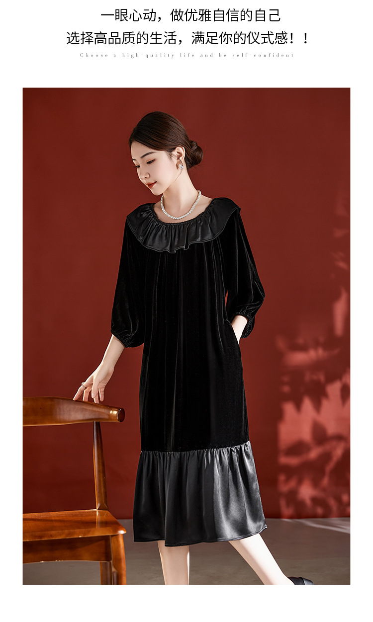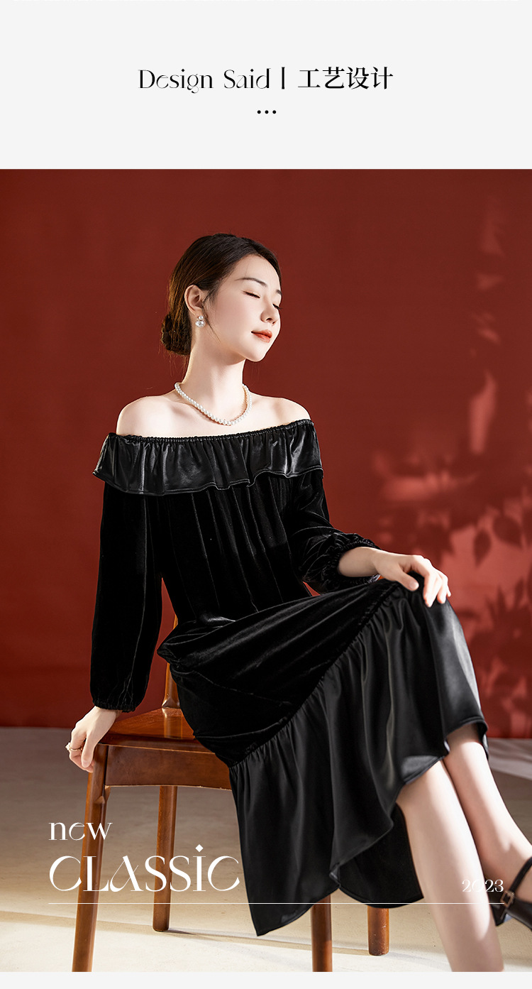 QS-82395996真丝丝绒连衣裙女2023秋冬季新款设计感荷叶边一字肩桑蚕丝裙