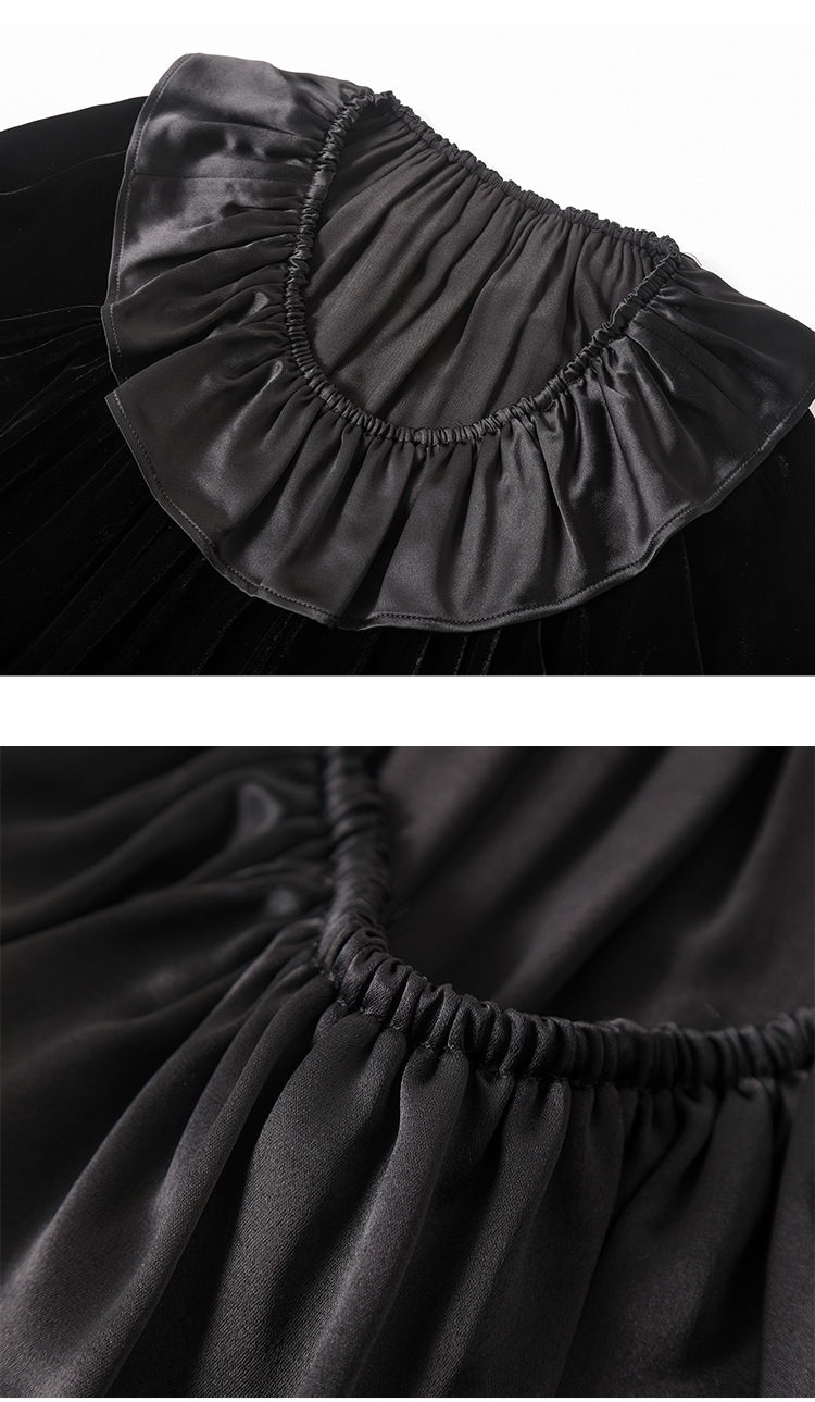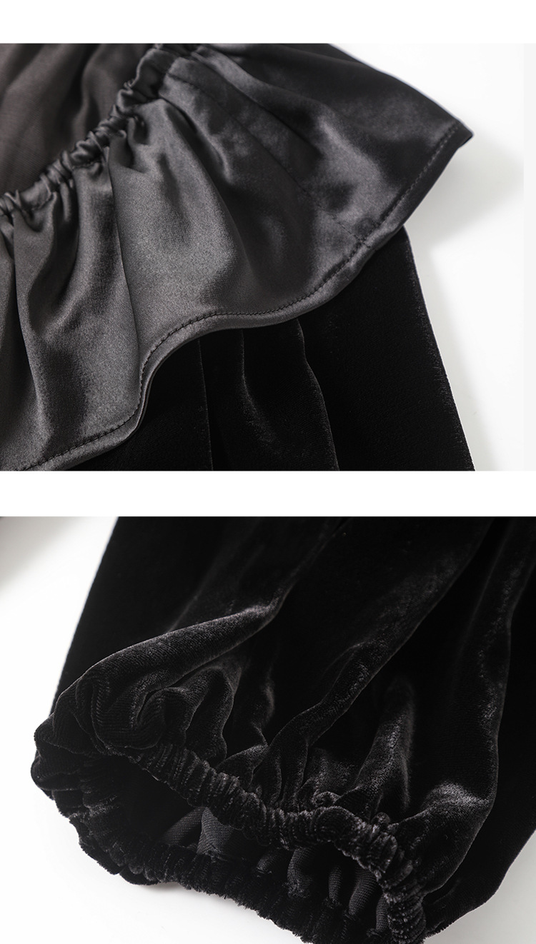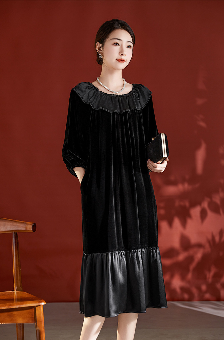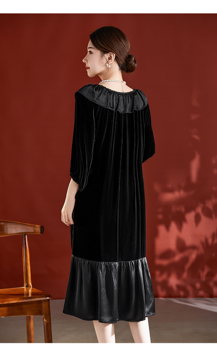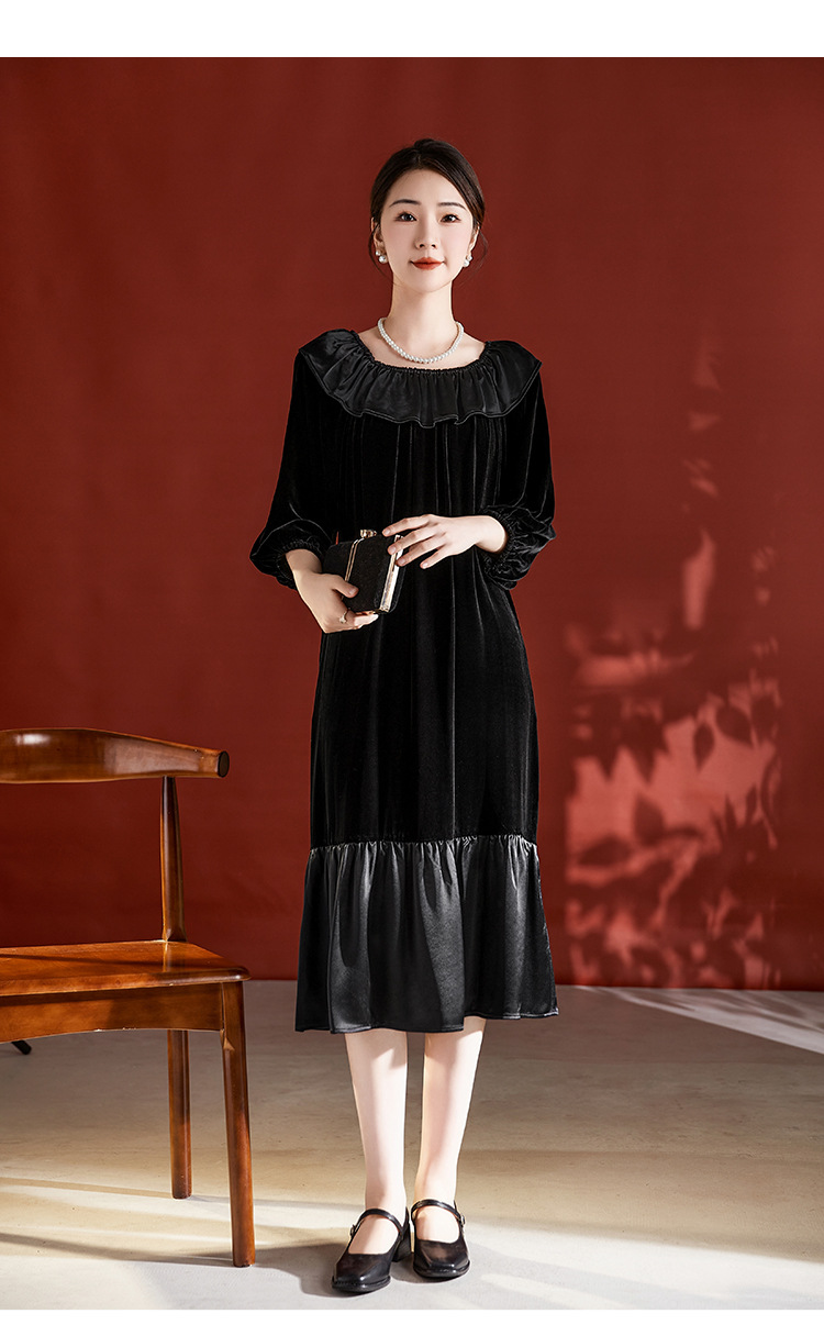 QS-82395996真丝丝绒连衣裙女2023秋冬季新款设计感荷叶边一字肩桑蚕丝裙