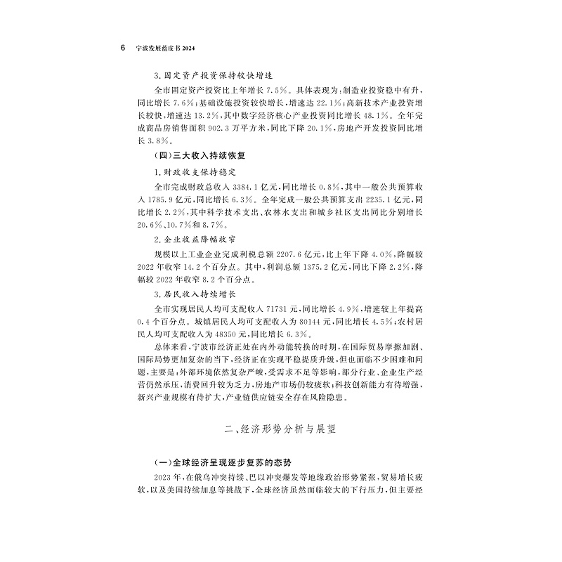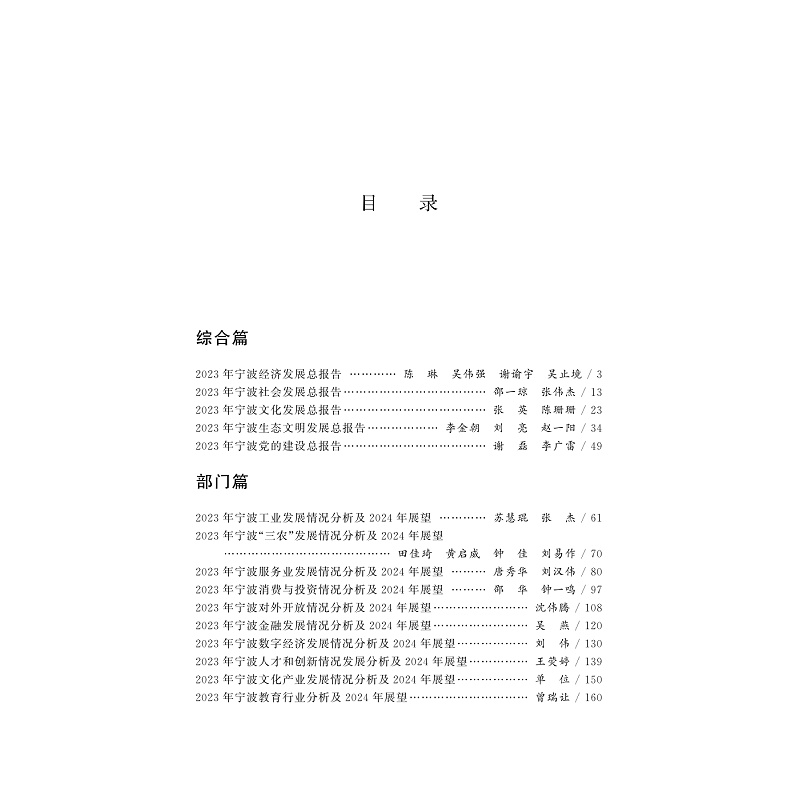 本书是宁波市社会科学院(宁波市社会科学界联合会)深入贯彻习近平新时代中国特色社会主义思想,强化并推进学科体系、学术观点和研究方法创新,集中组织各区县(市)、全市高校、研究机构、各行业(产业)等部门的优秀专家学者编写的一部服务于宁波经济社会发展的年度研究报告。全书通过对2023年宁波市经济、社会、文化、生态、党建等基本情况进行总结和评估,对2023年的发展趋势进行研判和预测,为各级党委政府科学决策提供理论支持,为社会组织和公众提供有价值的信息,既具有全局性、战略性和理论性,又具有前瞻性、专业性和务实性。