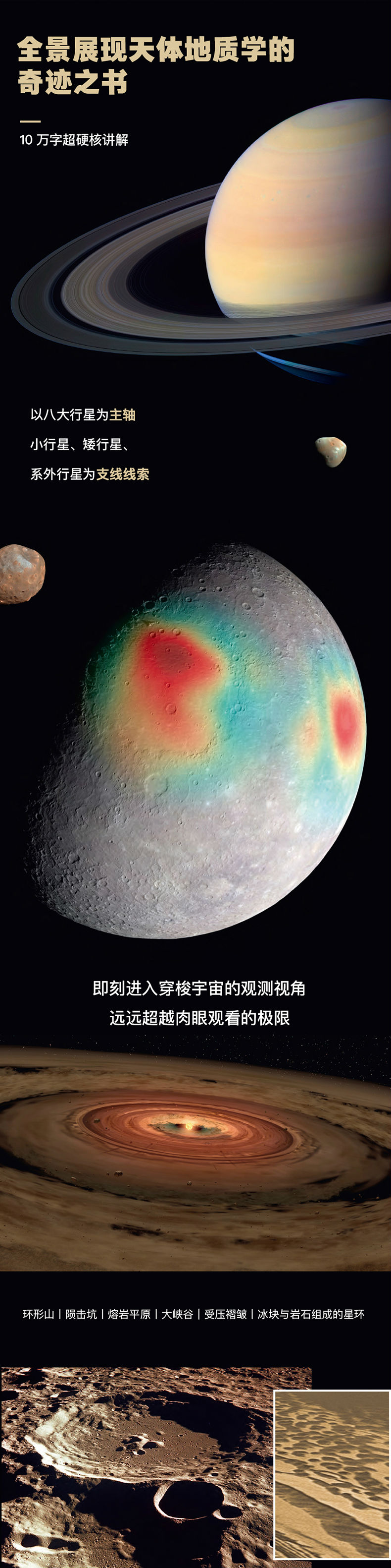 2. 全景展现天体地质学的奇迹,环形山、陨击坑、熔岩平原、大峡谷、纵横交错的受压褶皱以及冰块与岩石组成的星环,以八大行星为主轴,小行星、矮行星、系外行星为支线线索,看遍太阳系的壮美河山。