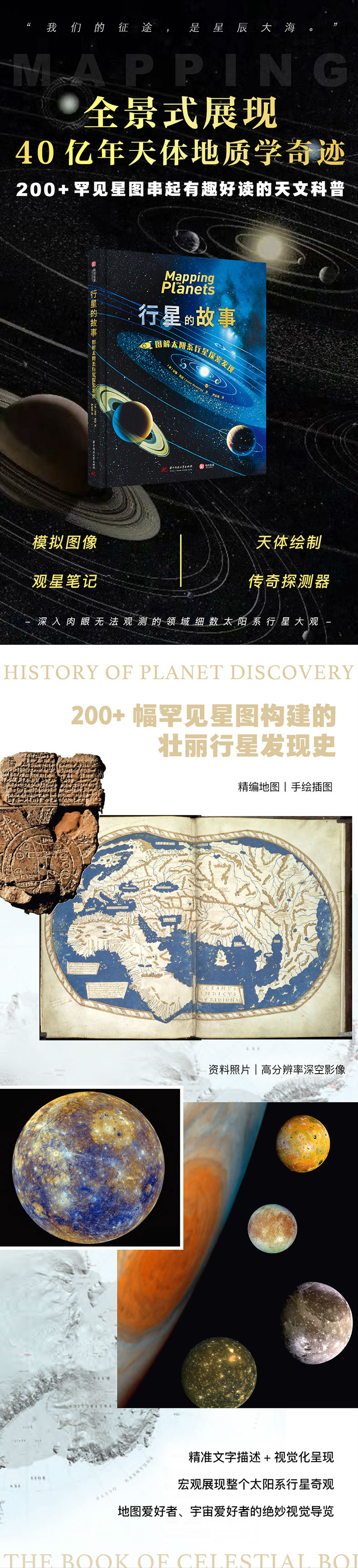 全书透过令人叹为观止的高清插图,展示了一部由各类星图构建的壮丽行星发现史,对太阳系中的行星以及探测技术进行了引人入胜的描述和视觉化呈现,为地图爱好者和宇宙爱好者提供了很好的视觉导览。如今,我们对太阳系天体的探测与绘制已经成了宇宙探索发现的核心技术之一。