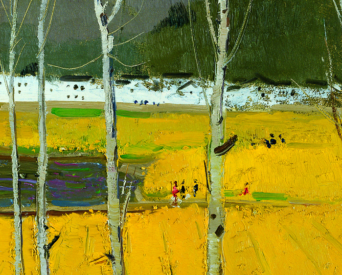 前景的围栏在暖棕黄色的油彩上以调色刀尖刮画而成,最最上方的枝丫相呼应,错落有致的线条富有节奏感,变现了生命勃发的力量。