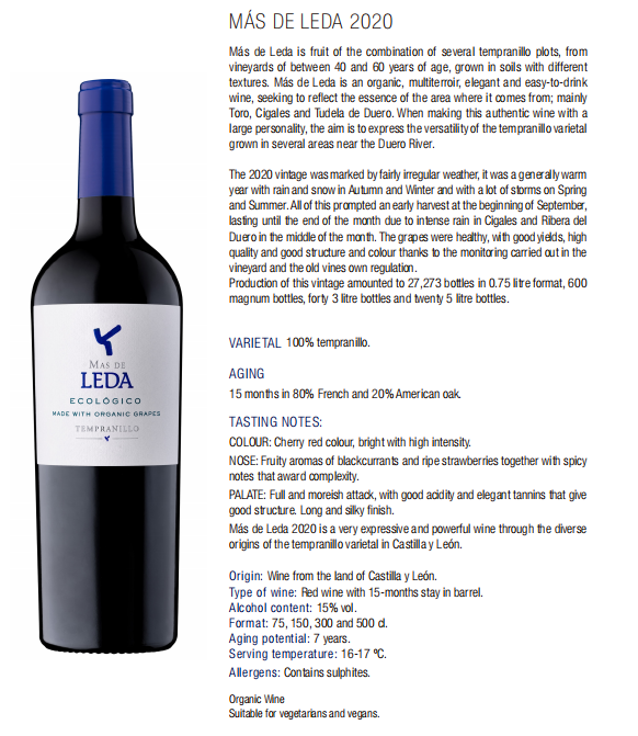 酒庄共有20公顷老藤葡萄园,分布在杜埃罗和托罗,锡格拉斯(Cigales)个三个产区,全部实行有机种植。生产Leda Vinas Viejas,Mas de Leda, Guarda de Leda三款葡萄酒,全年产量约6万瓶。