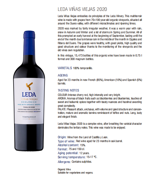 乐达老藤(Leda Vinas Viejas)是酒庄最核心的产品,年均产量1.5万瓶左右。精选来自杜罗河边不同微气候土壤环境中70-100年树龄的老藤丹魄,经23个月橡木桶陈酿(85%法国橡木桶+10%美国橡木桶+5%西班牙橡木桶),成就的乐达老藤如同一个正值风华正茂年富力强的男子,他有强壮有力的骨架,复杂多变的质地,外表俊朗,灵魂有趣,生命力无限。