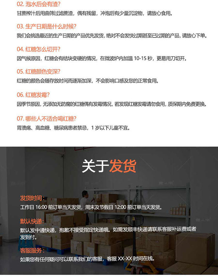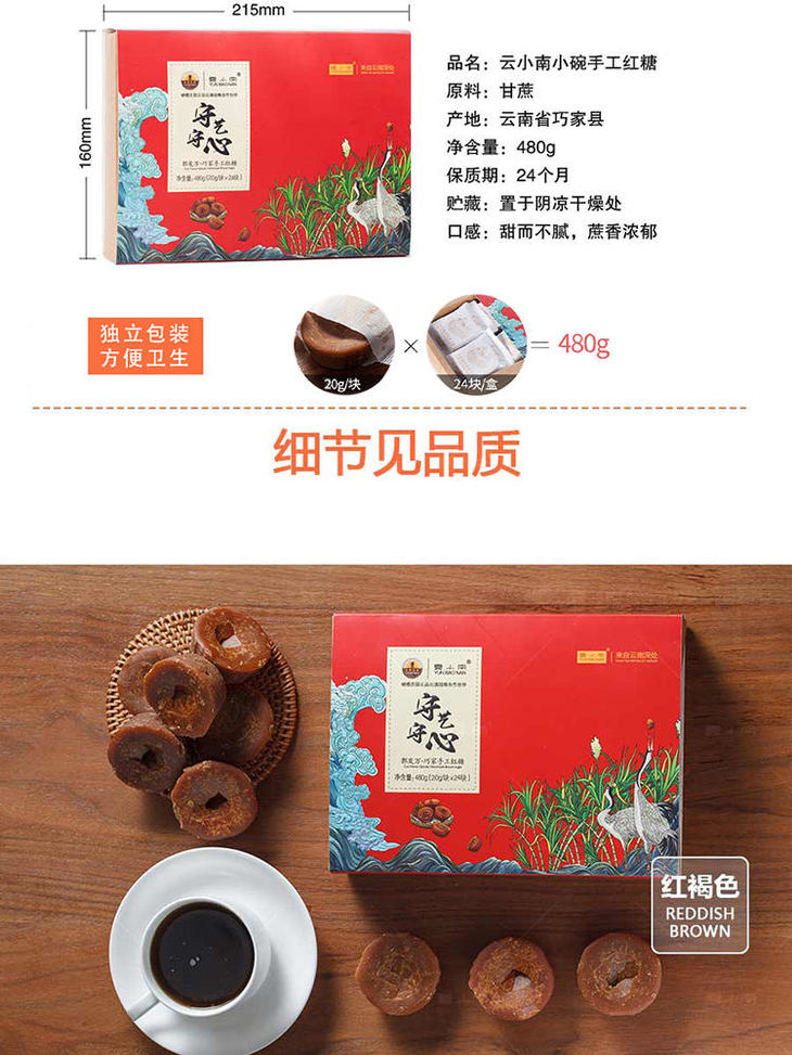 品名:巧家小碗红糖 规格1:约24碗块(独立小袋)480g/礼盒*1盒(约24~28枚/盒) 规格2:约24碗块(独立小袋)480g/礼盒*2盒(约24~28枚/盒)数量仅供参考,以实际重量为准;拍几份发几个包裹,不一定能同时到达,请耐心等待; 发货地/产地:云南昆明 包装方式:袋装+纸箱 物流信息:默认中通/韵达快递,不支持指定快递 不发货区域:新疆、西藏、内蒙、宁夏不发; 物流详情:周六、周日及节假日除外,正常48小时内发货,到货时间约为2~5天,请耐心等待 售后说明:收到货后有质量问题,在24小时内都可以拍照(坏品+快递单面箱子一起拍)上传,申请按坏品比例理赔或联系客服,生鲜性质特殊,因地址错误,手机号联系不上,拒收等造成的损失无法售后,请理解; |