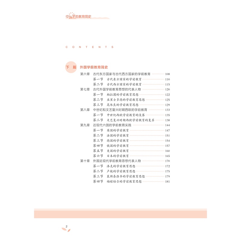 《中外学前教育筒史》是学前教育专业的主要课程之一。本教材遵循史论结合的原则以辩证唯物主义和历史唯物主义为指导,力图简要而全面地勾画出中外学前教育的历史,并在此基础上进行实事求是地分析和评论,探讨学前教育发展的一般规律。在教材内容上,本教材分为上下两篇,其中上篇为中国学前教育筒史,下篇为外国学前教育简史。全书按照时间顺序分别对中国学前教育的发展历史、教育家思想和外国学前教育的发展历史、教育家思想进行论述,能使学生全面了解中外学前散育的发展情况。