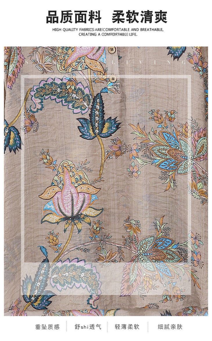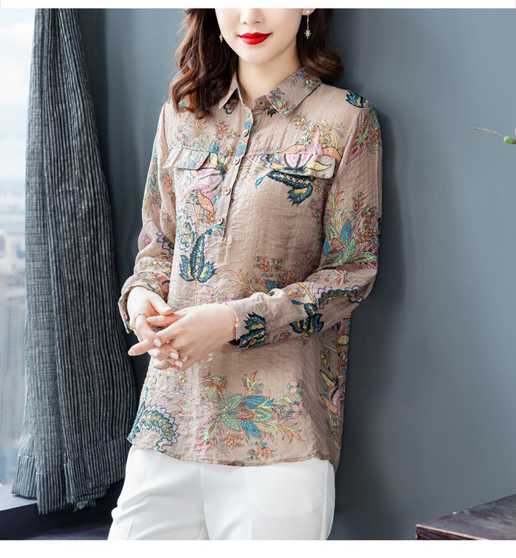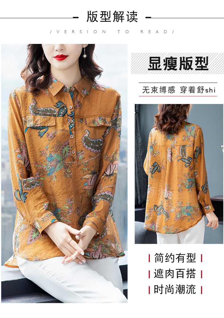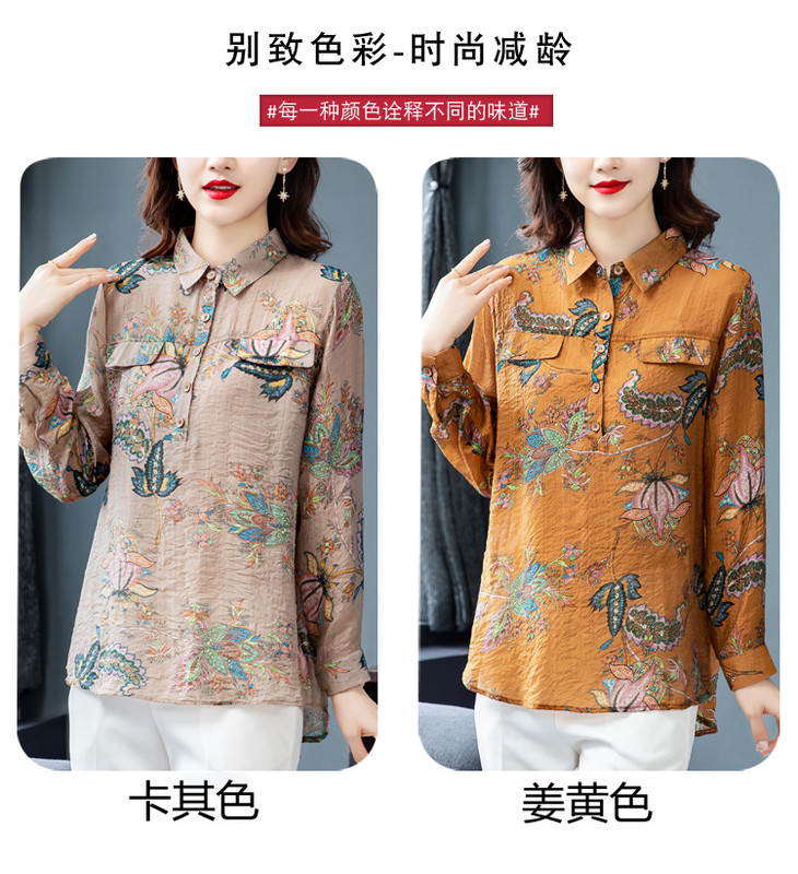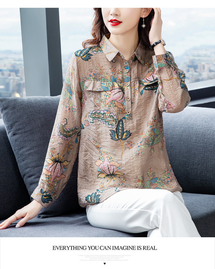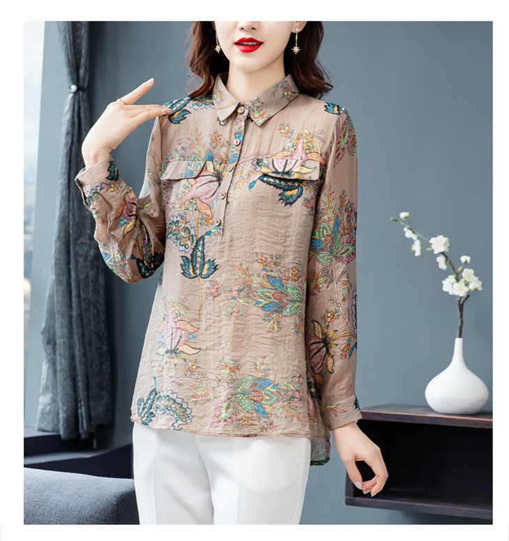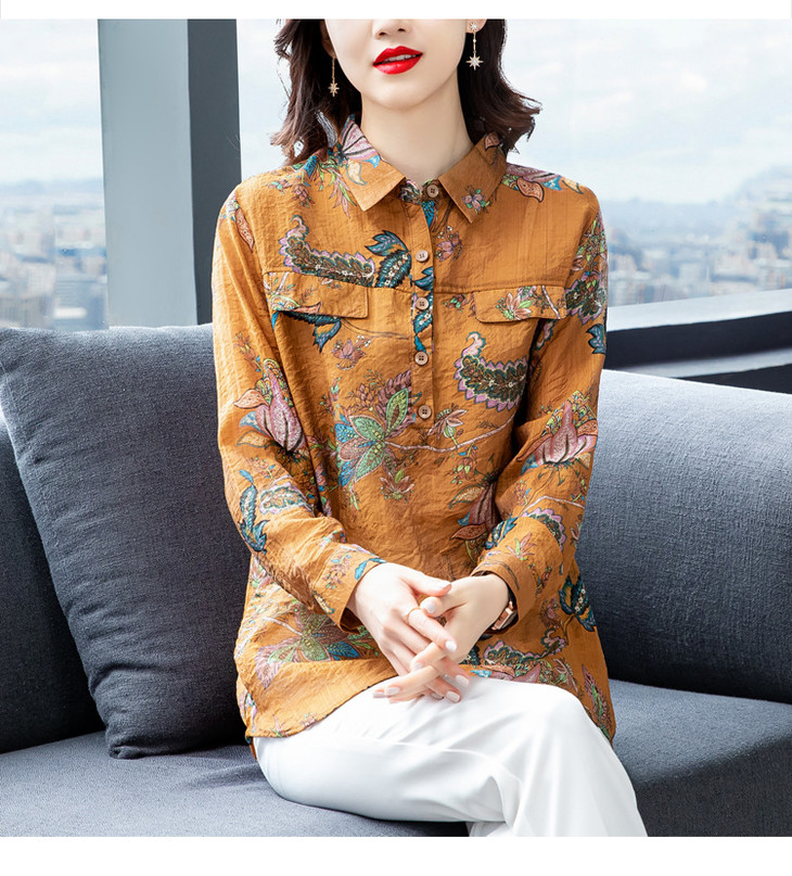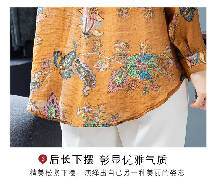 MZ115494 大码棉质长袖衬衫女士七分袖棉麻薄款2021潮款春秋装中年印花上衣