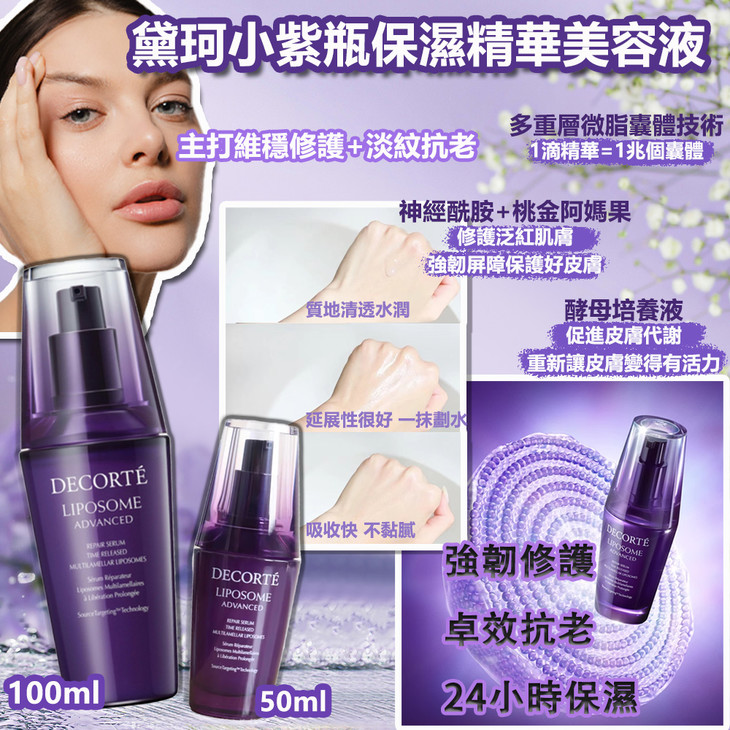 👑黛珂小紫瓶保湿精华美容液-50ml/100ml 👍主打维稳修护+淡纹抗老💯! 🙌新版添加了神经酰胺和桃金娘果提取物修护类的成分🍑, 💥添加了酵母培养液能够促进皮肤的胶原蛋白生成和新陈代谢,让皮肤变得有活力。 💎新升级多重层微脂囊体技术,真正做到让精华成分吸收到皮肤💧! 👐提拉淡纹✅,补水保湿✅,修护屏障✅。
