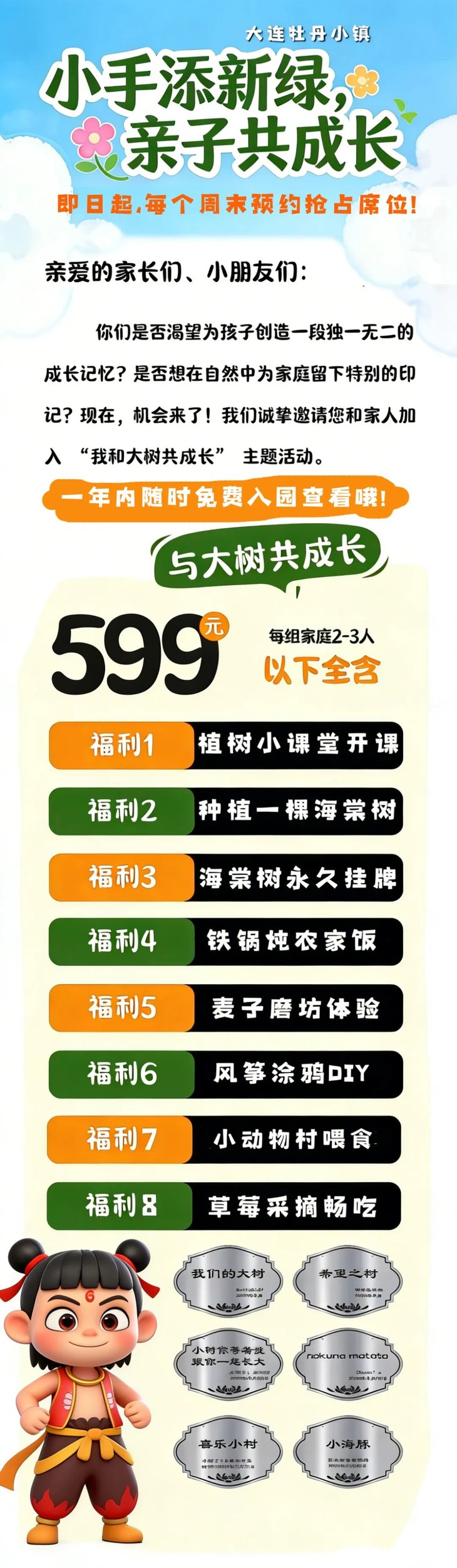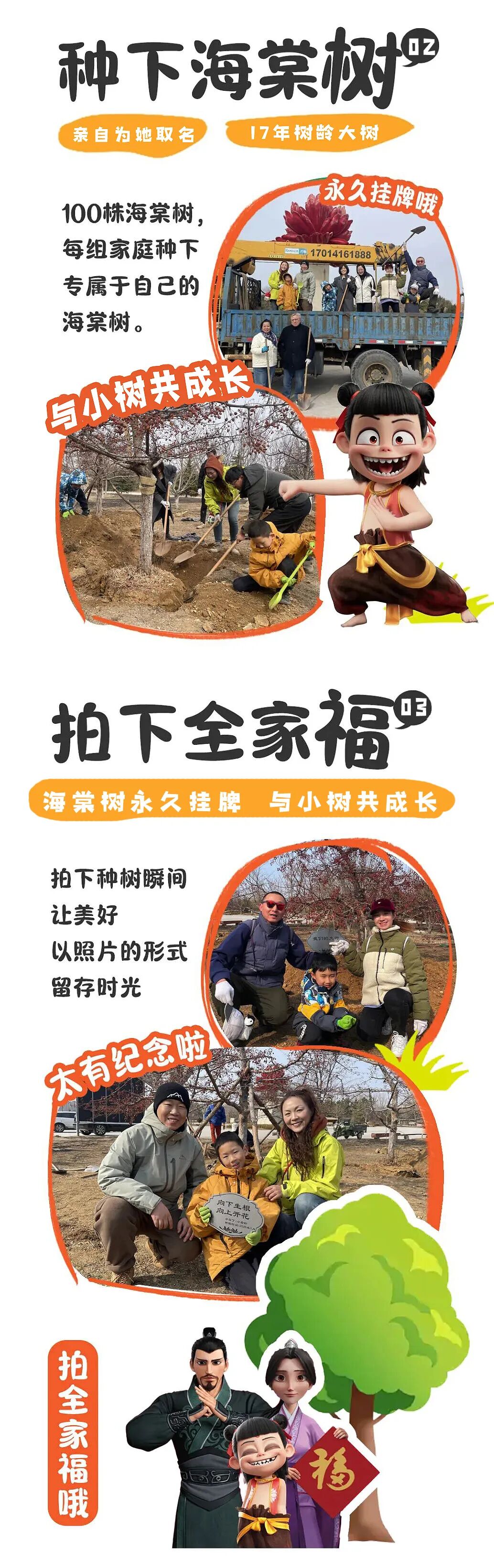 周末植树活动来啦!亲子种植海棠树、特色铁锅炖、草莓采摘、古法磨坊体验、风筝DIY等!另送年卡!植一抹新绿,守护青山绿水!