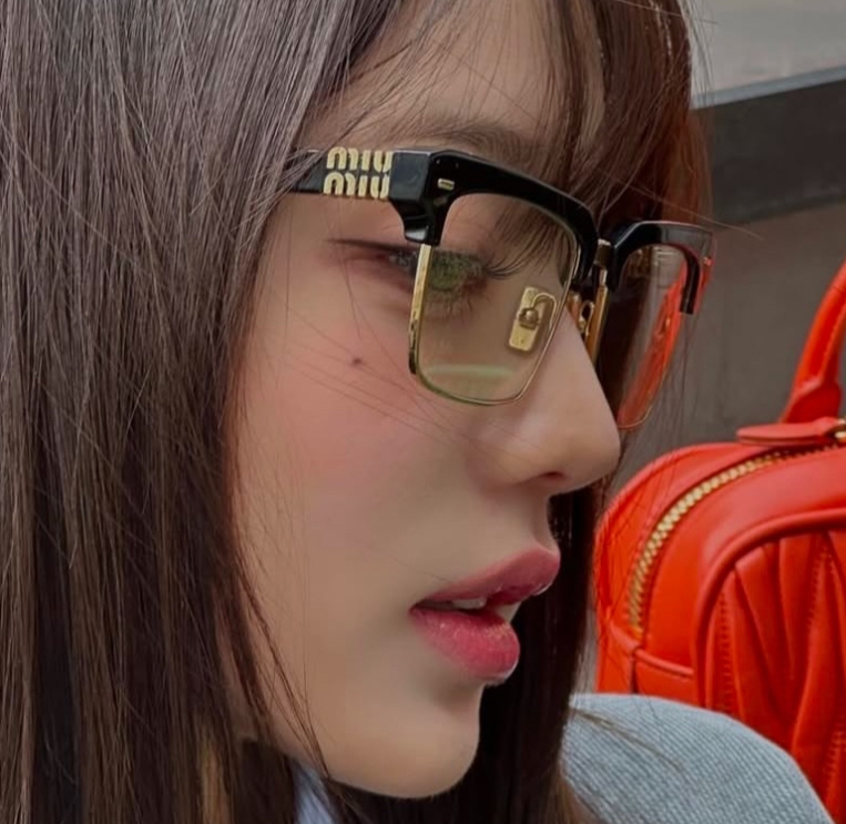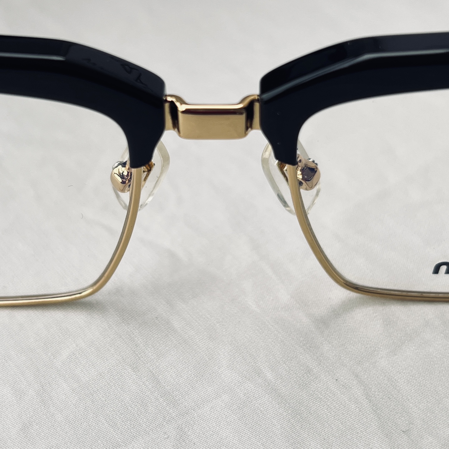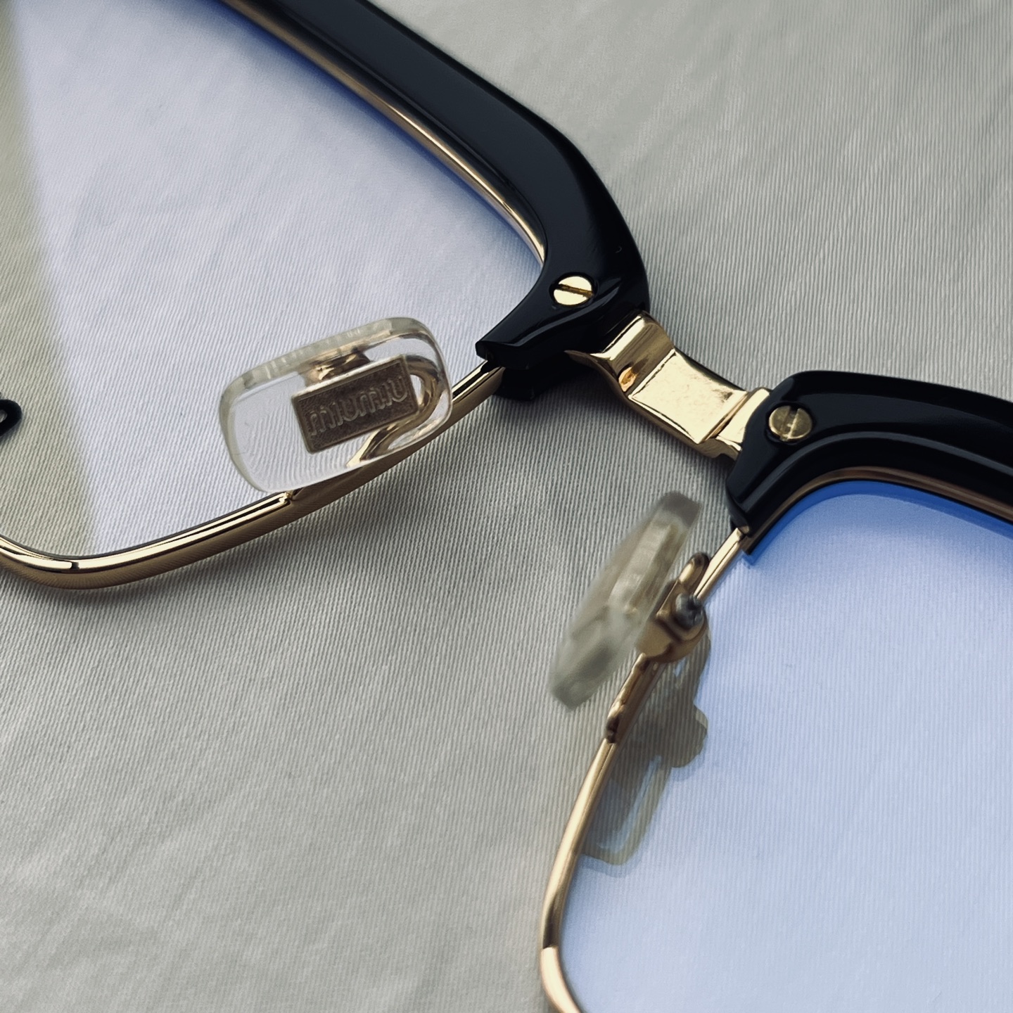 铰链处的金色金属件是点睛之笔——哑光金的镀层避开了廉价的浮夸感,与镜腿末端的立体“MIU MIU”标识形成呼应,连鼻托上都压印着品牌小字,每一处微小的标识都在不动声色地强化轻奢调性。