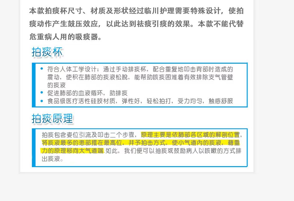 拍痰主要针对无力咳痰、长期卧床、痰液过多者是一项基本的护理工作,目的是清除气道痰液以促进气道的通畅。拍痰杯代替手掌叩击拍痰的方法,使拍痰工作更有效率,更安全。