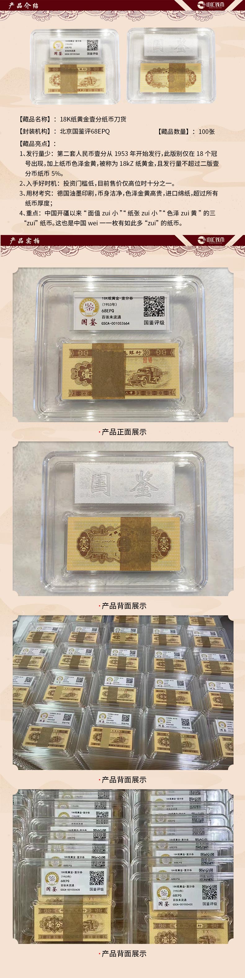 1953年版壹分百张评级纸钞 北京国鉴评级18K纸黄金 单套