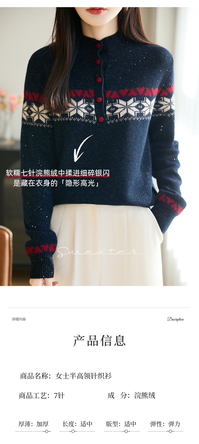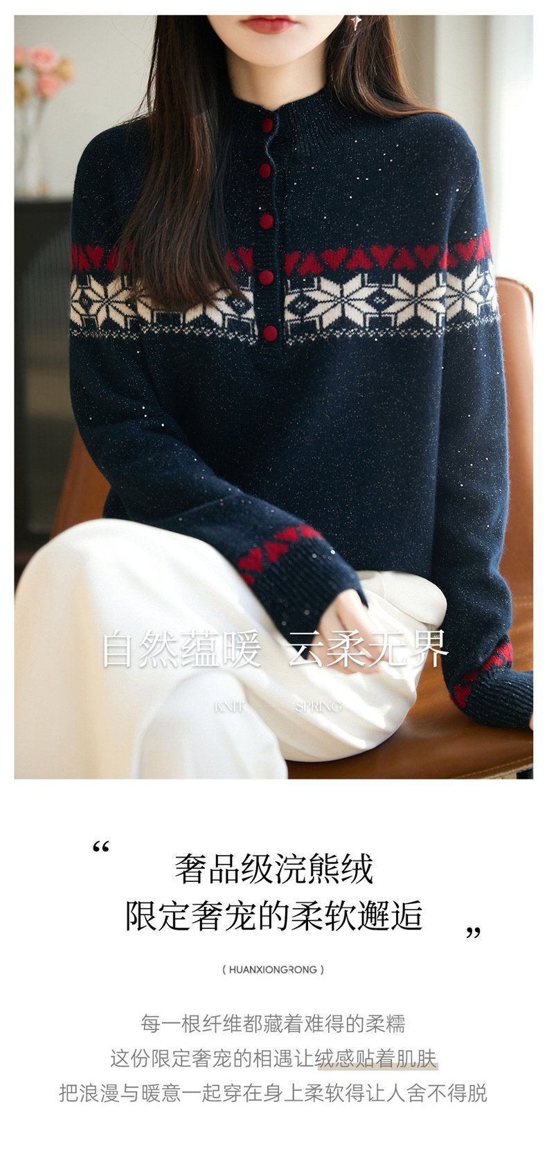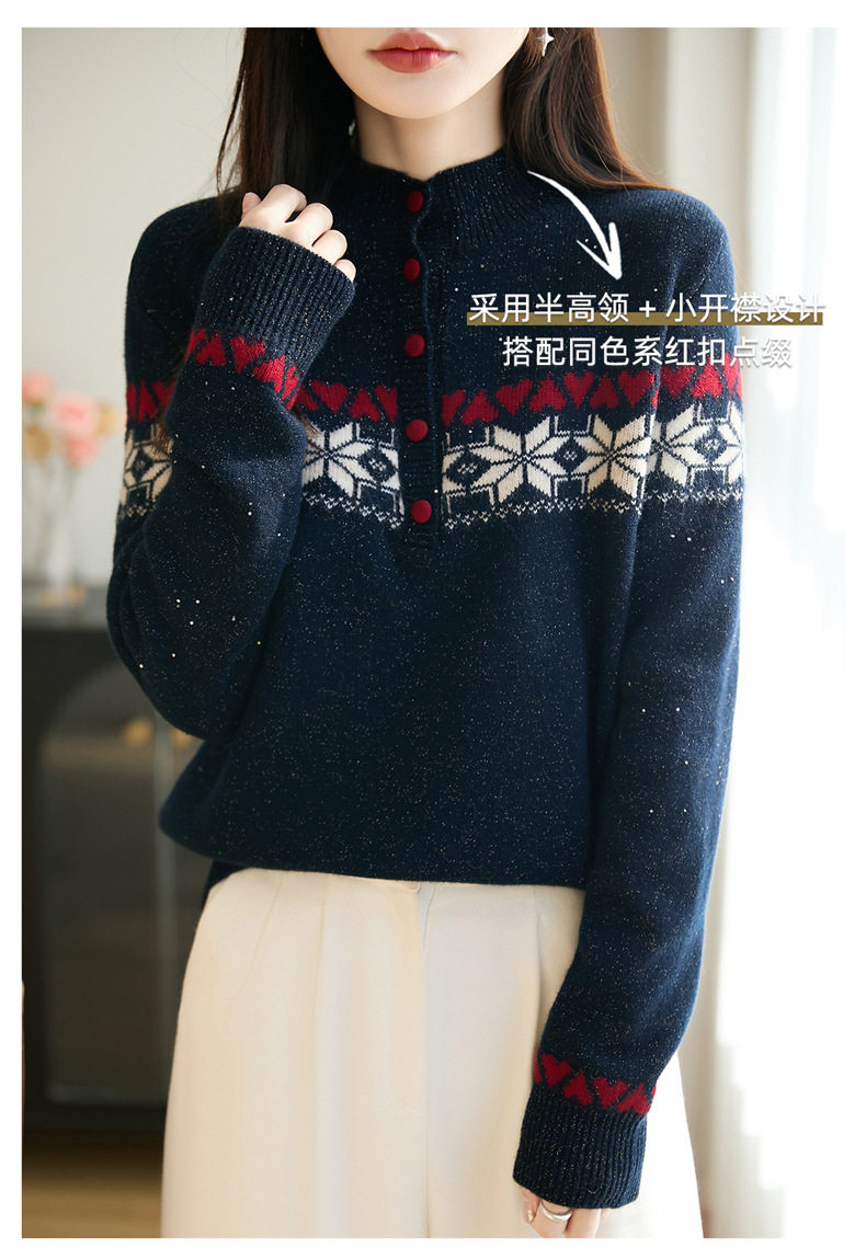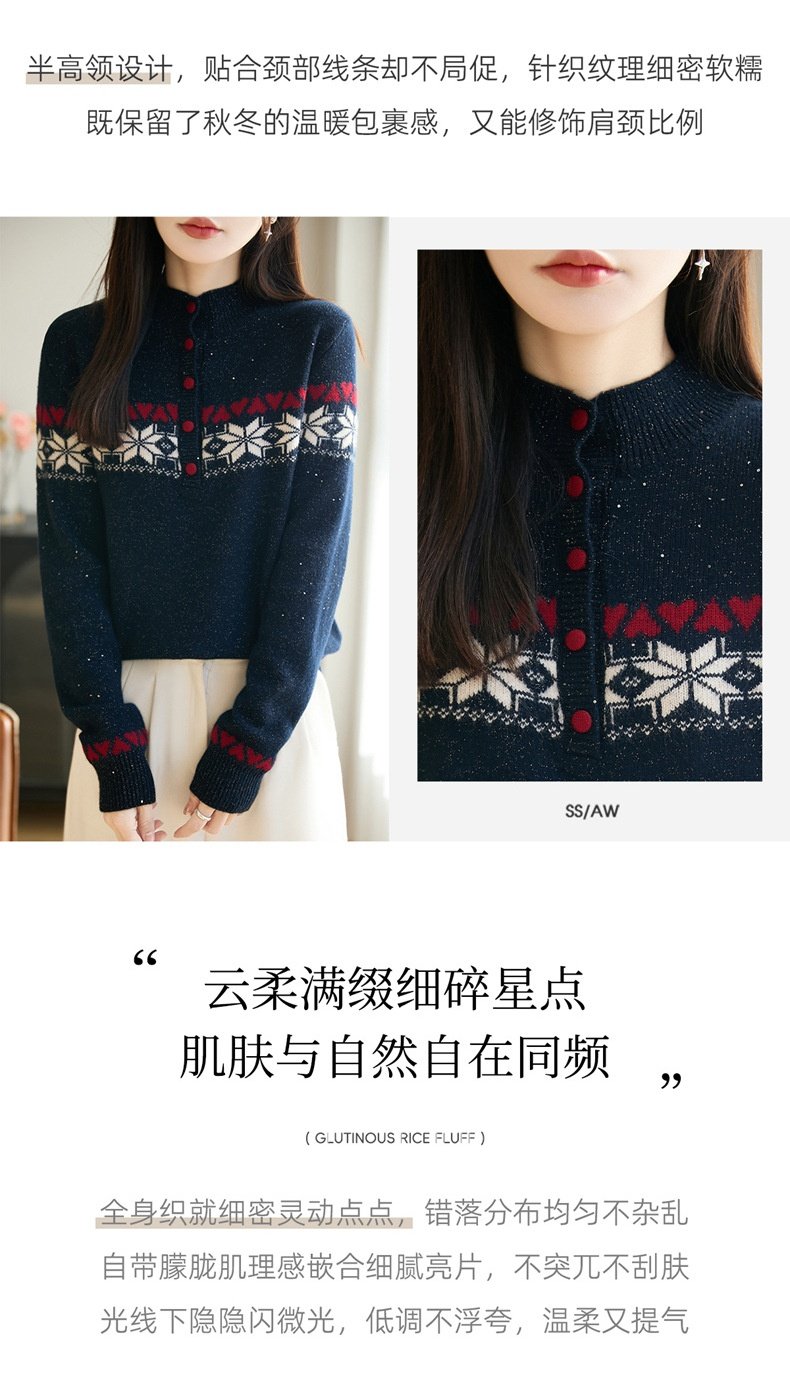 「自」全新升级【铂金会员146/天猫199/差价53】(00728)洛诗琳费尔岛提花立领毛衣2025冬季小众撞色亮片加厚上衣