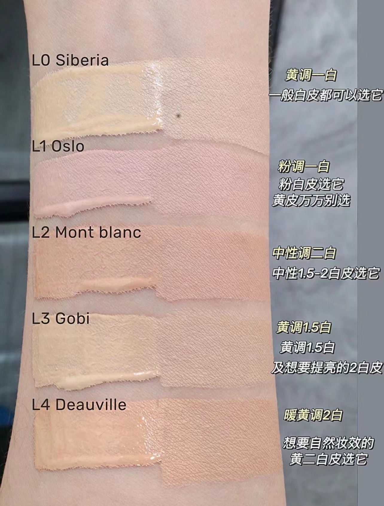 L0 Siberia:黄调一白,适合黄一白肤色! L1 OSLO:适合冷调、中性色调的白皙肤色! L2 MONT BLANC:适合大多数白皙肤色