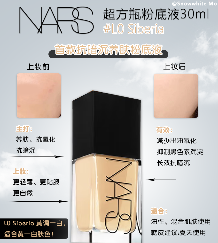 👑NARS 超方瓶粉底液30ml #L0 Siberia 👍首款抗暗沉养肤粉底液 ✅主打:养肤、抗氧化、抗暗沉 ✨有效:减少出油氧化、抑制黑色素沉淀、长效抗暗沉 🙌上妆:更轻薄、更服帖,更自然,“微雾面”感妆效 💯遮瑕很在线,黑眼圈、痘痘、瑕疵都能遮 💋适合:油性、混合肌肤使用,干皮建议:夏天使用
