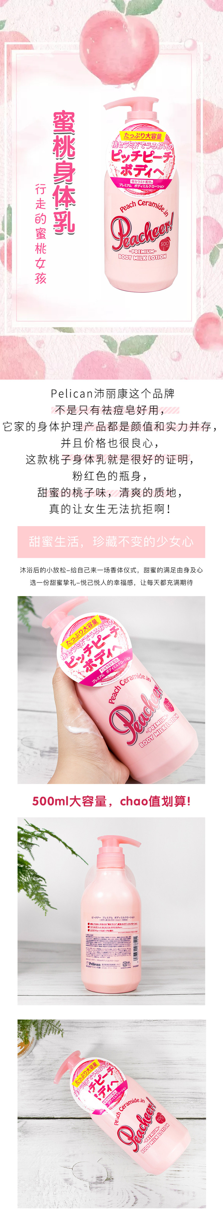 日本pelican身体乳500ml 水蜜桃子味保湿滋润补水