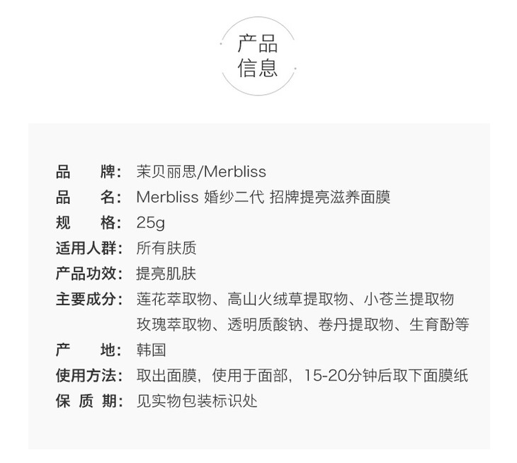 ❄️BX👑最新款‼️韩国Merbliss第二代婚纱面膜5片装美白滋养強烈推薦📢保濕護膚美白,皮膚的救星💁🏻 Merbliss 婚紗面膜,💦以七種鮮花提煉物組成,🌷猶如沐浴於花的海洋😘,面膜紙純天然材料,0.06超薄質感‼️你不敢想象的薄🔥,真正營養的面霜質地面膜🌸,更貼服,更易吸收。最適合約會活動前敷一敷,保濕亮白看個見👏🏻