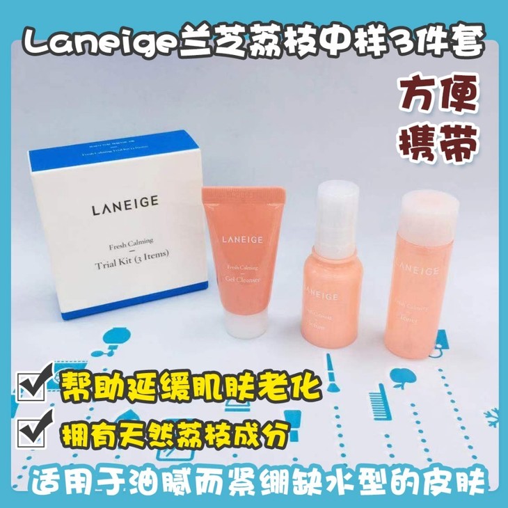 Laneige兰芝荔枝中样3件套👍方便携带,中样还可以当旅行装哦🎒。爽肤水富含矿物质的海洋深层水🌊,缔造滋润光滑的肌肤💦。精华还拥有天然荔枝成分,帮助延缓肌肤老化💆,强化肌肤自身的防护屏障,适用于油腻而紧绷缺水型的皮肤哦🍂~洁面啫喱去除肌肤多余油分的同时👊,为肌肤补水锁水,保持肌肤表面的水油平衡〽,温和呵护肌肤。套装包括:洁面啫喱15ML➕水25ML➕精华10ML