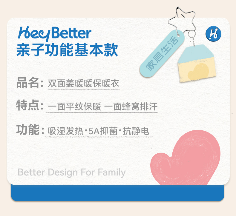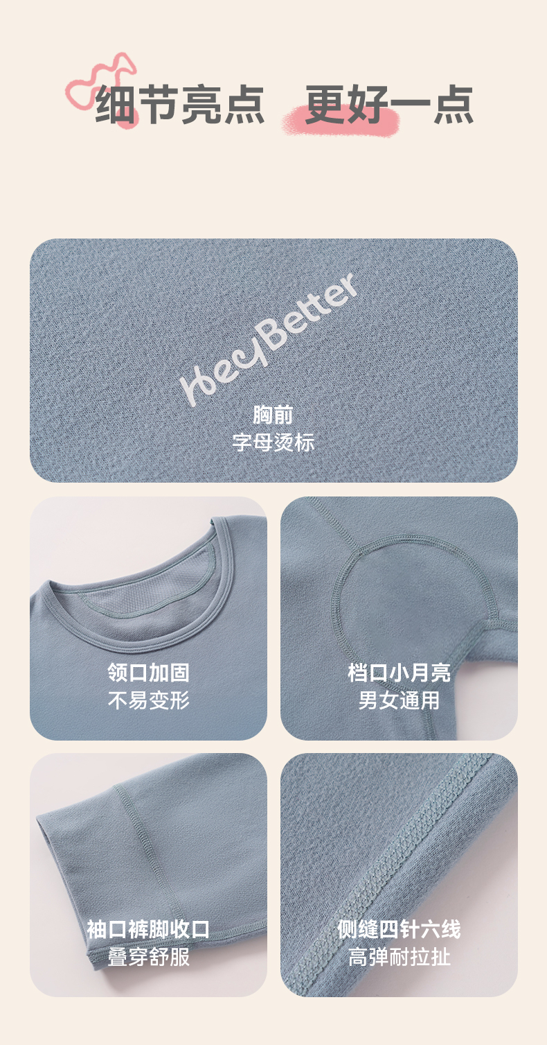 【HeyBetter】双面姜暖暖保暖内衣 采用双面设计,一面平纹保暖,一面蜂窝排汗,适合秋冬穿着。具备吸湿发热功能,5A级抑菌标准,有效减少异味。