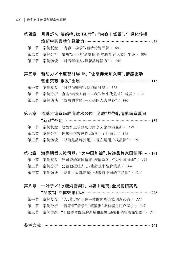 本书以案例复盘、案例分析和案例访谈的框架结构,立体呈现了近年来数字商业传播的八大经典案例,既不同于业界案例图书单纯汇编+简单点评的轻操作模式,也不同于学界强调理论解读,而忽略案例丰富性的学院做法。案例复盘以对操盘团队的深度访谈为基础,全面、完整地再现了品牌数字营销的前线场景,为课程教学提供了最具真实感和现场感的鲜活案例。案例分析中的理论选择并非以商业传播思想史中的经典与否为标准,而是从对数字商业传播的解释力出发,适配性地保证了理论解析的时、度、效。案例访谈揭示了品牌数字商业传播台前幕后的精彩故事。这是一本集实践性、知识性和可读性于一体的案例教程,希望可以为高校数字商业传播的案例教学提供一种新范式。