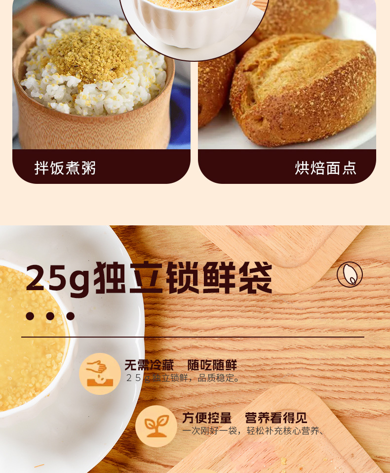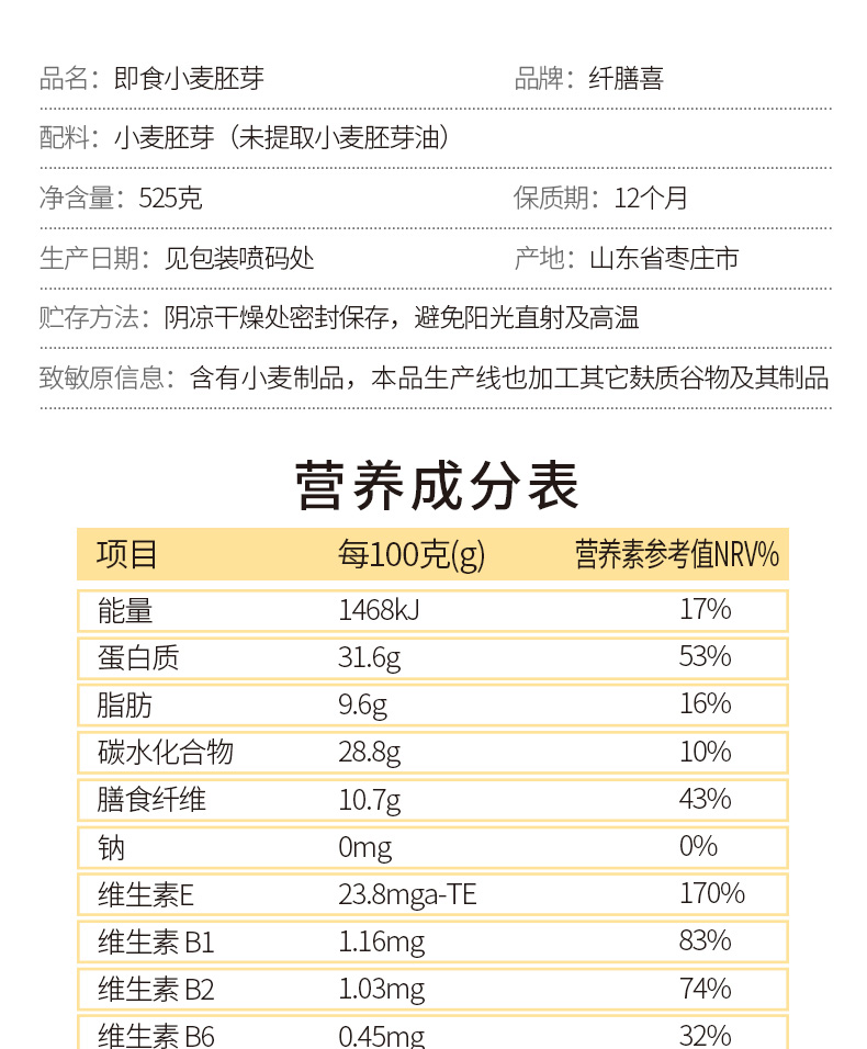 品名:纤膳喜小麦胚芽 规格1:525g/袋*1袋(21独立小袋/袋) 规格2:525g/袋*3袋(21独立小袋/袋);拍几份发几个包裹,不一定能同时到达,请耐心等待; 发货地/产地:山东枣庄 保质期:12个月 包装方式:袋装+独立小袋 物流信息:默认圆通/邮政/中通发货,不支持指定快递 发货区域:新疆、西藏、青海、宁夏、内蒙、甘肃、海南不发; 物流详情:周六、周日及节假日除外,正常48小时内发货,到货时间约为2~5天,请耐心等待 售后说明:收到货后有质量问题,在24小时内都可以拍照(坏品+快递单面箱子一起拍)上传,申请按坏品比例理赔或联系客服;生鲜食品性质特殊,不支持7天无理由退换货;因地址错误,手机号联系不上,拒收等造成的损失无法售后,请理解;新老包装随机发货,介意者慎拍; |