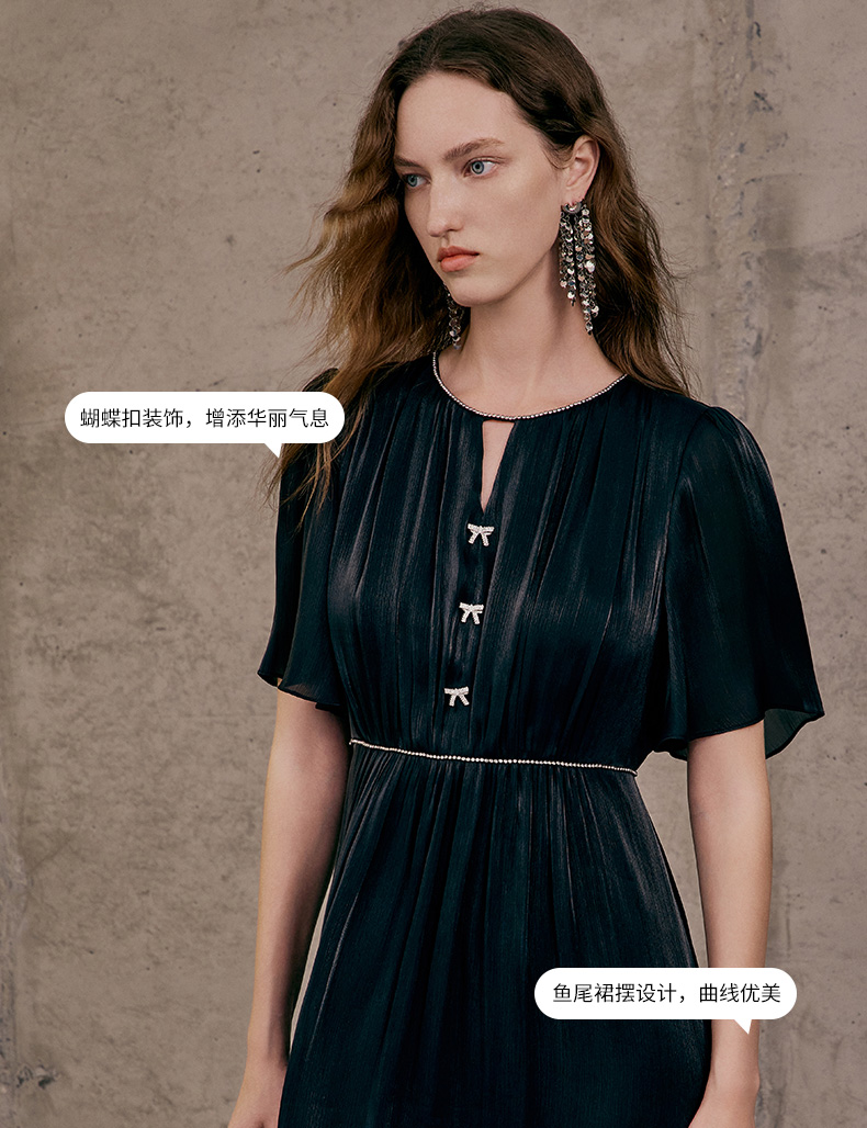 EITIE爱特爱夏季新品高腰修身优雅荷叶袖连衣裙7407115