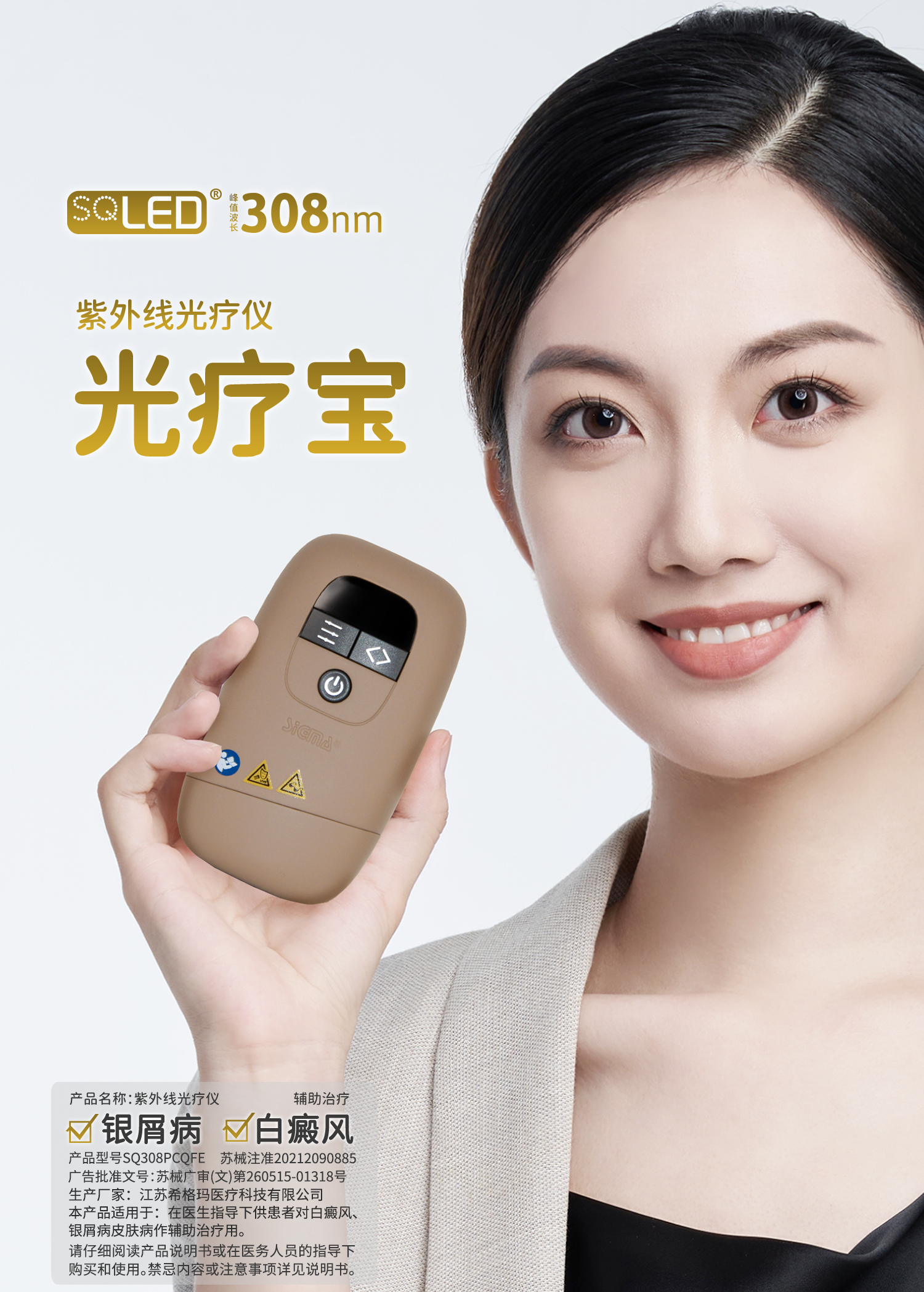 【插电款】希格玛家用33mW/cm²小面积308白癜风光疗宝高强度银屑病牛皮藓紫外线SQ308PCQFE【适应症:白癜风、银屑病】