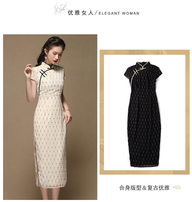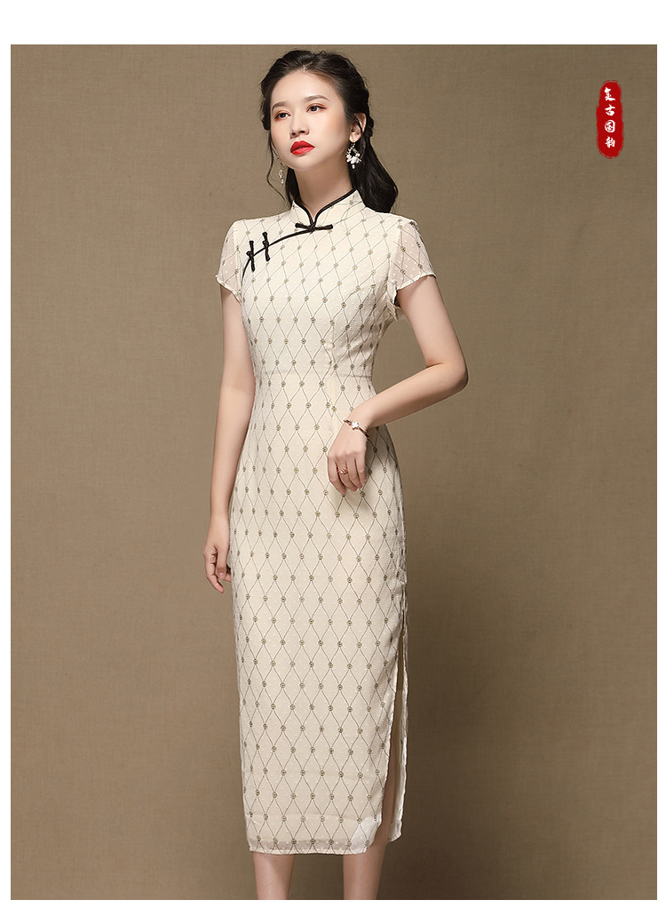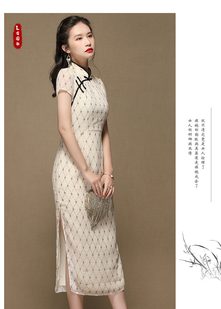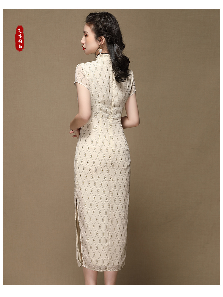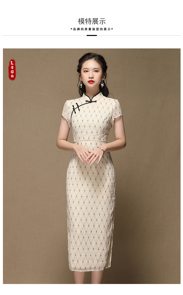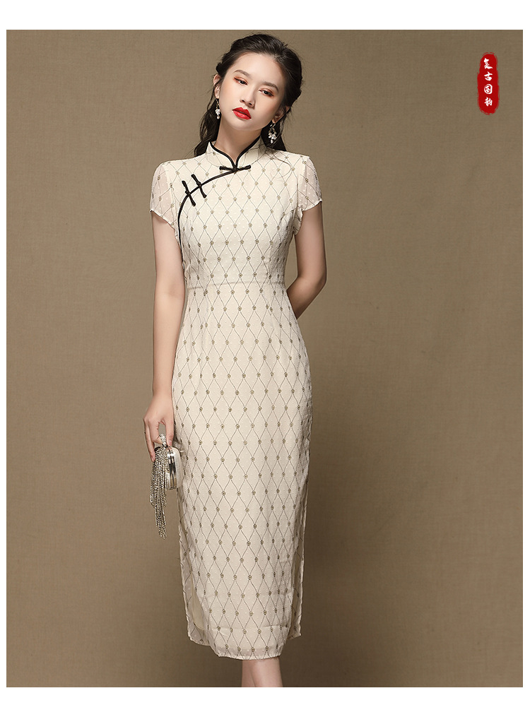 上海旗袍厂AYK-QF-200413雪纺菱格长款旗袍连衣裙传统立领短袖旗袍白女2021夏国潮复古女装