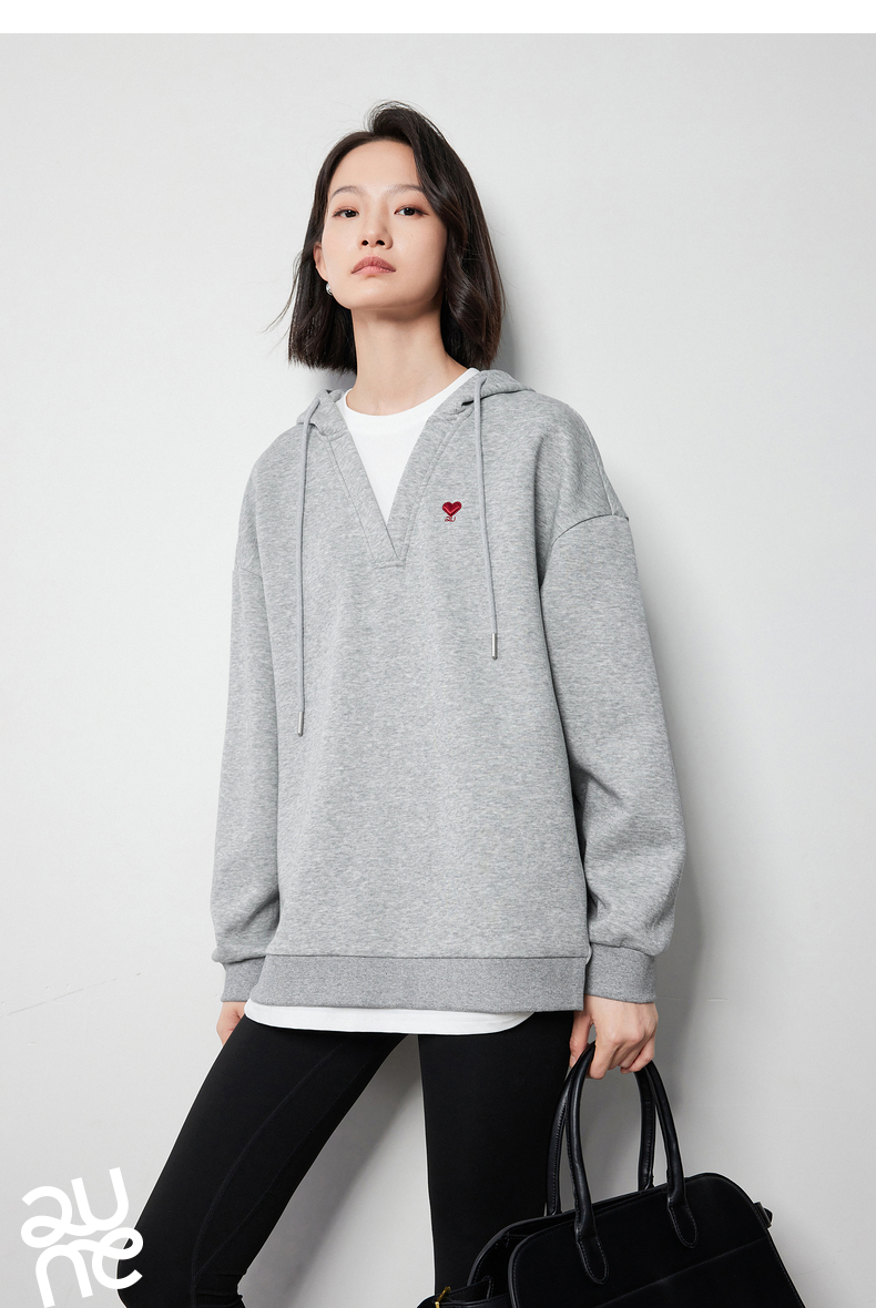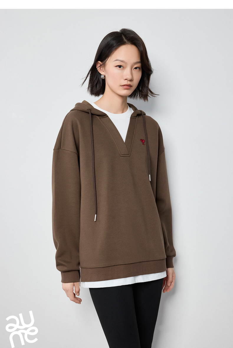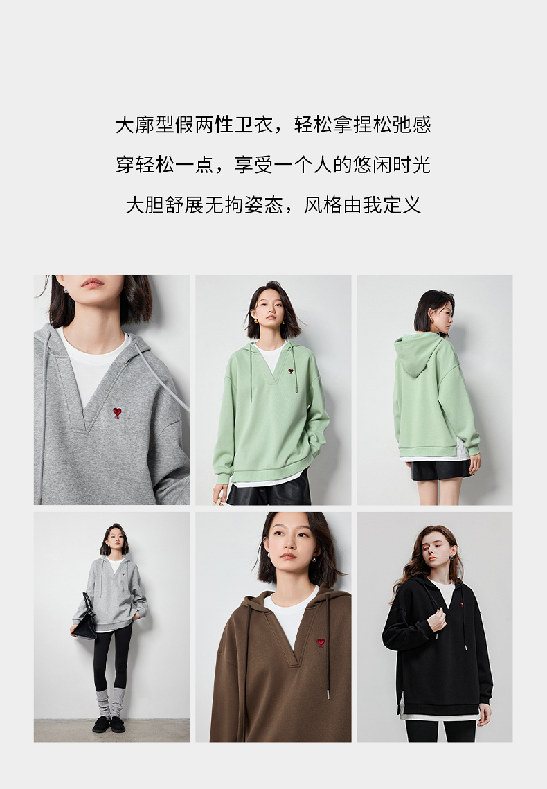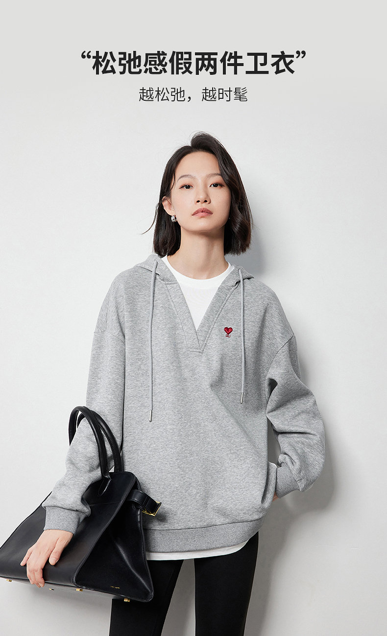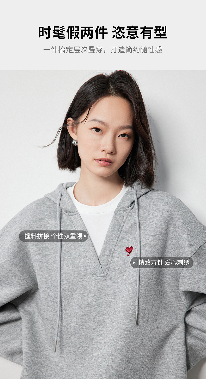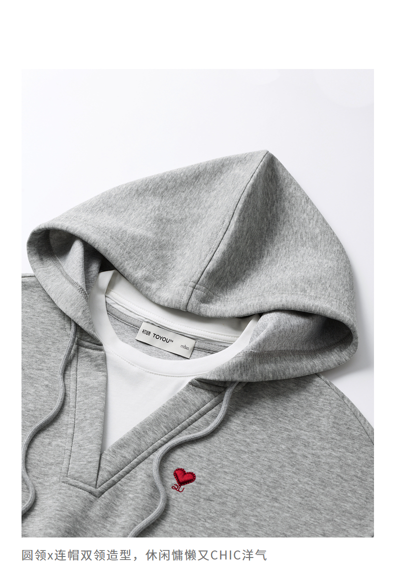 TOYOUTH初语假两件连帽卫衣女爱心刺绣宽松减龄上衣