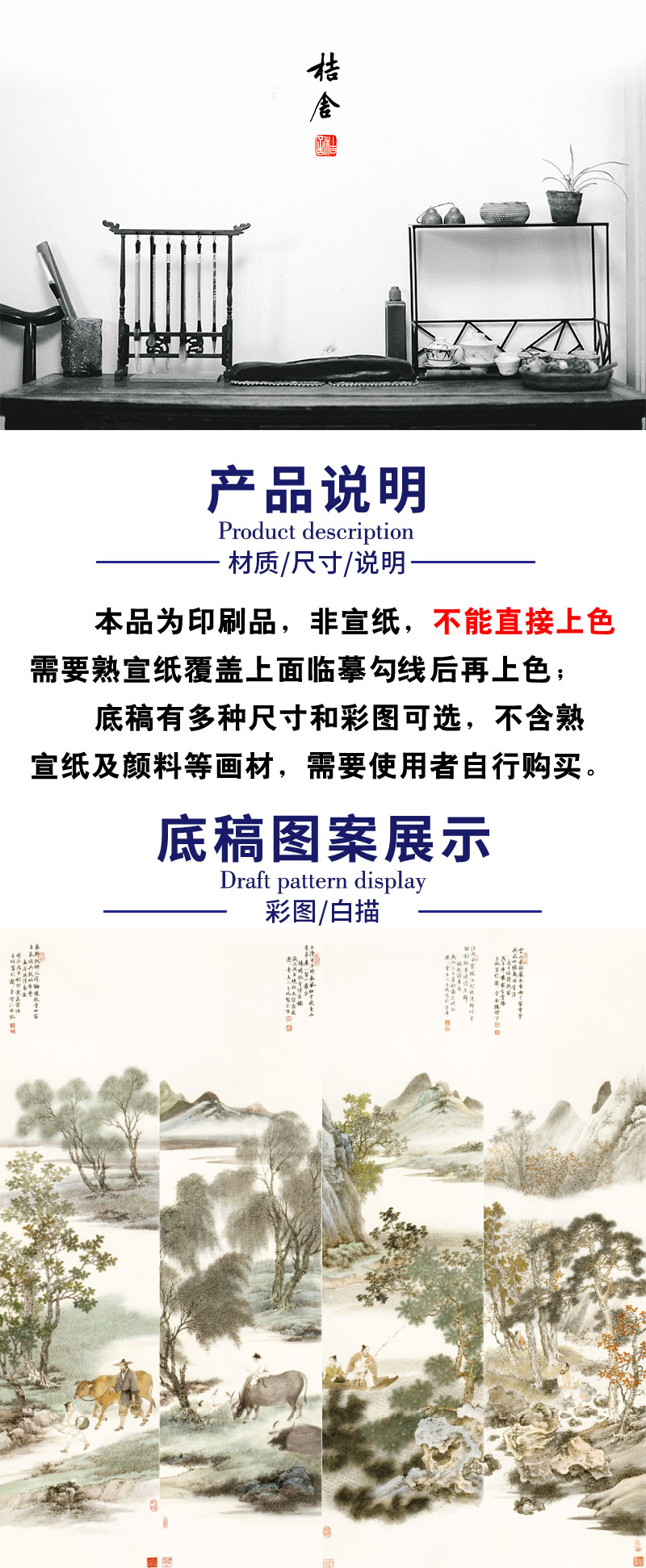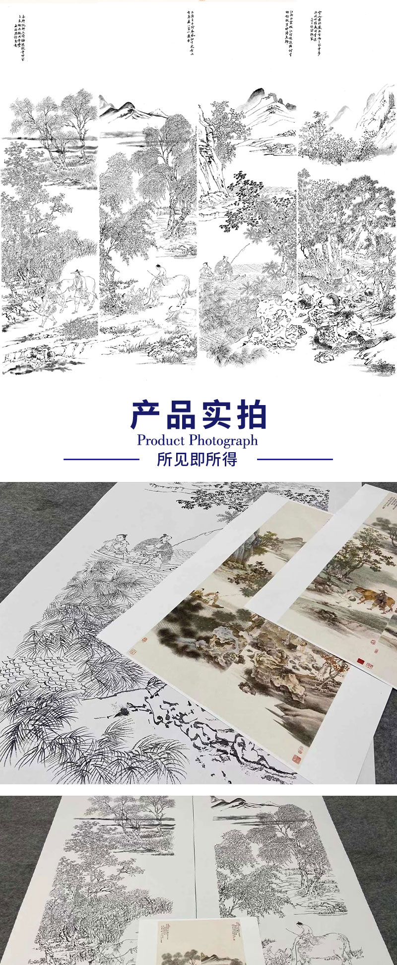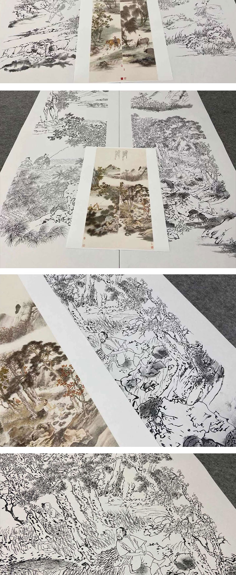 【四条屏】李子牧工笔画白描底稿山水人物图《农牧渔樵》临摹勾线高清打印稿TP40