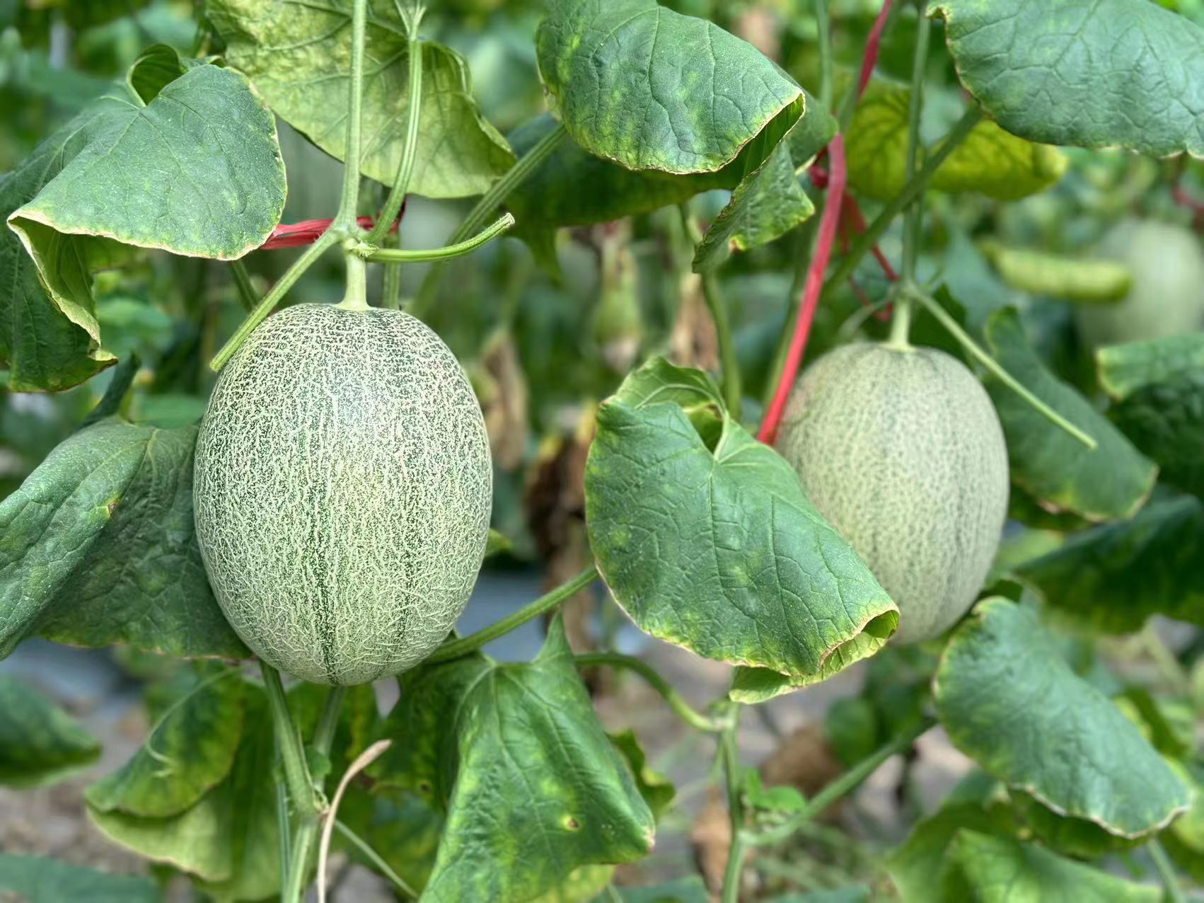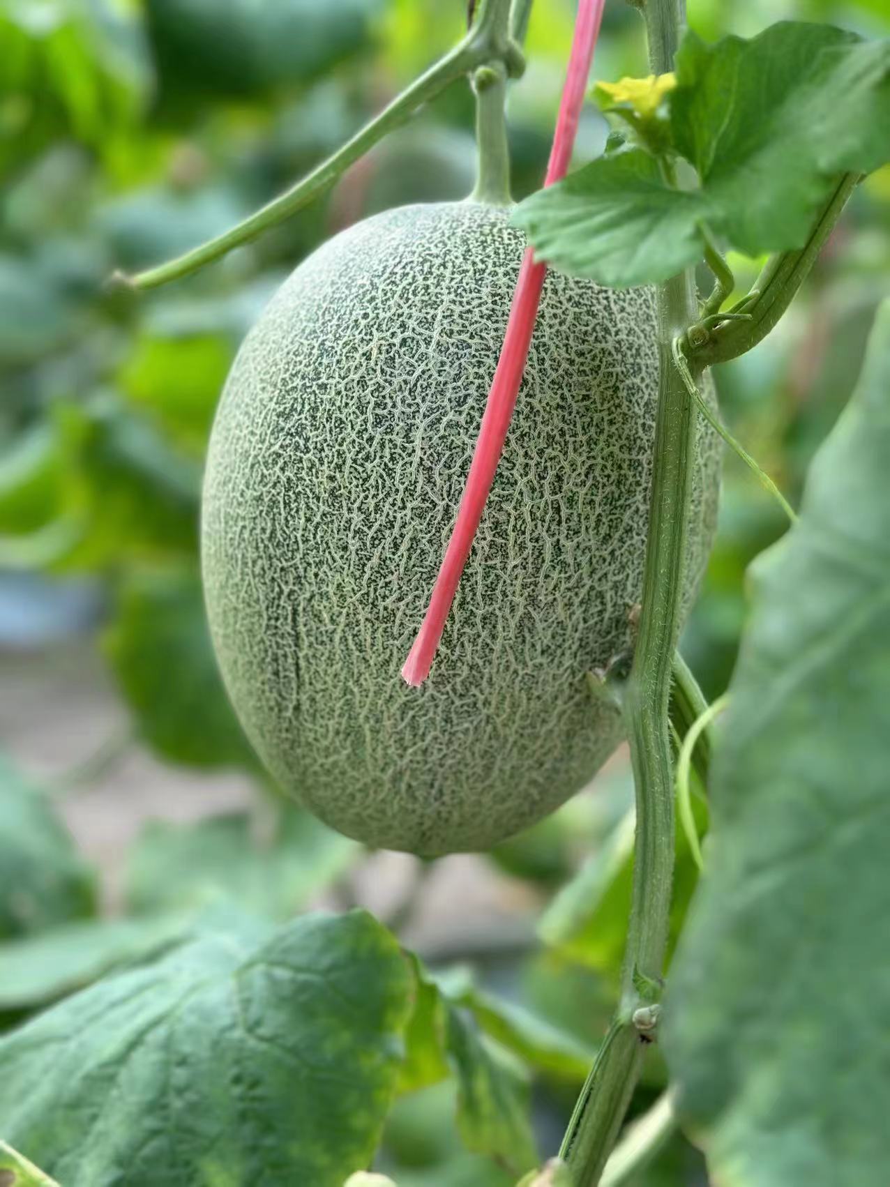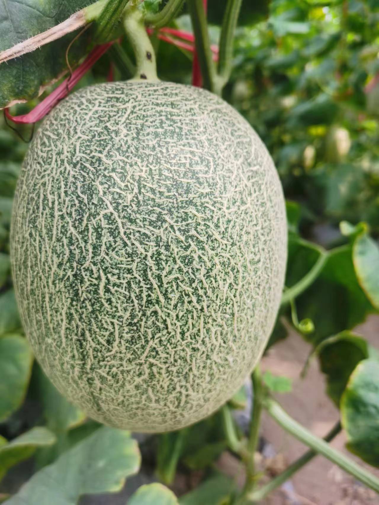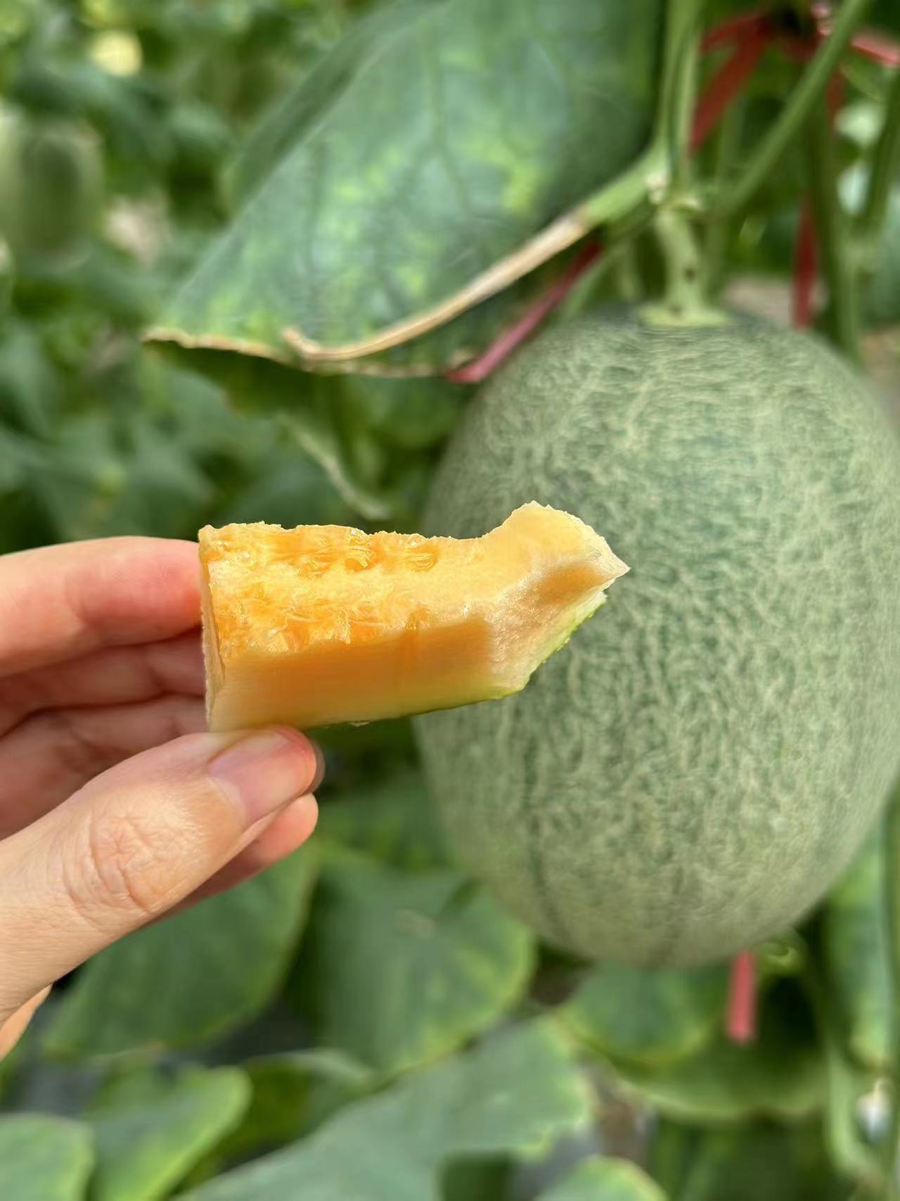 海沙蜜瓜浅麻绿、绿道,网纹细密全,果肉橘红,肉质细、松脆,风味好,含糖量20%。