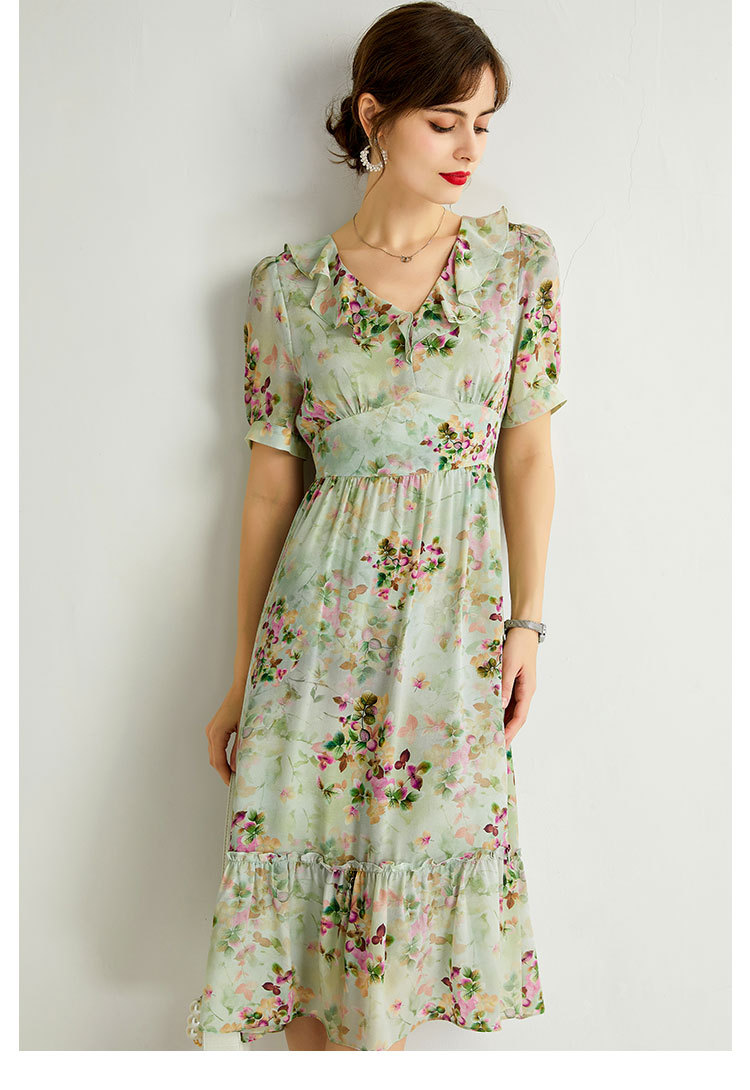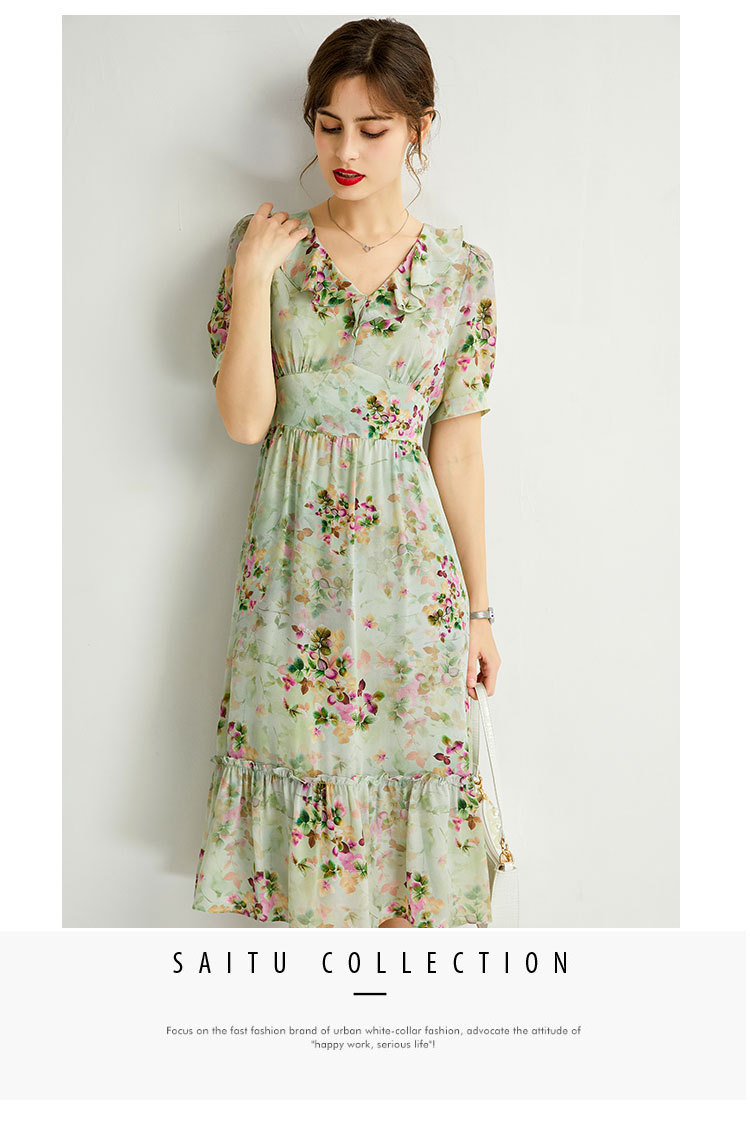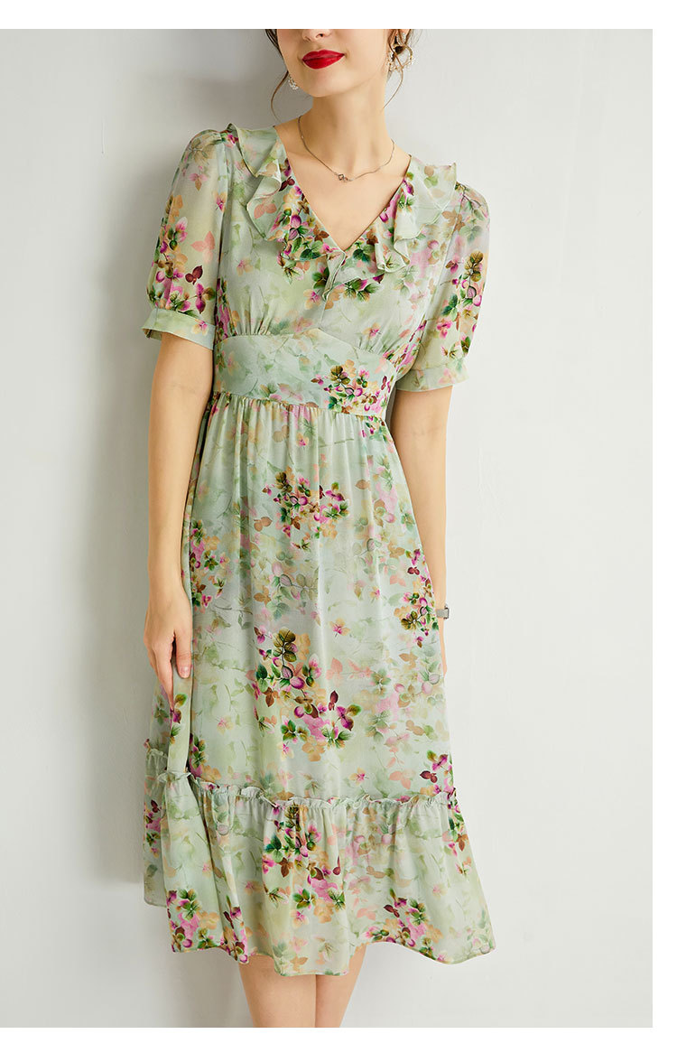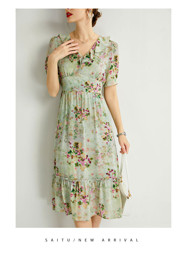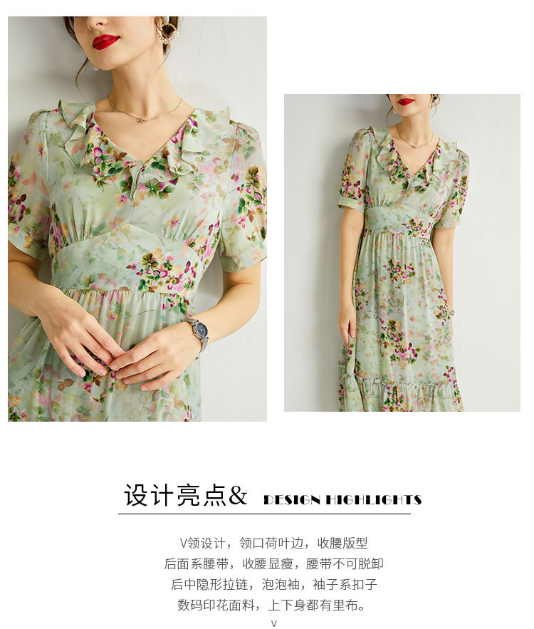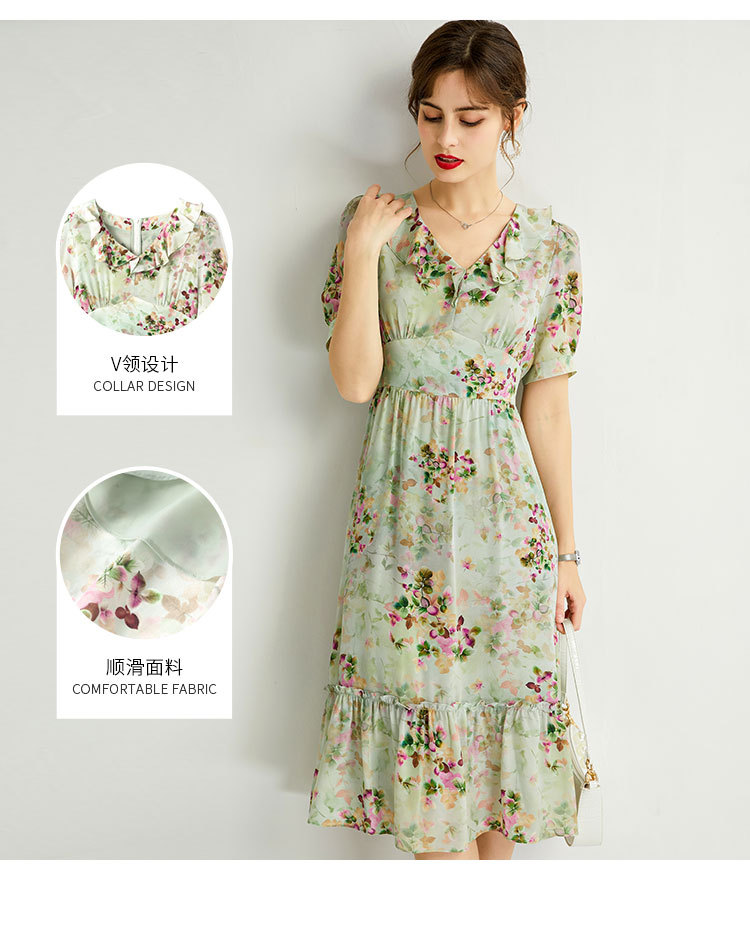 V字领时尚显瘦荷叶边,真丝桑蚕丝连衣裙KBN-230129