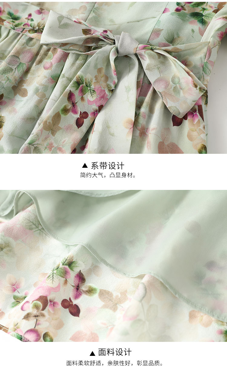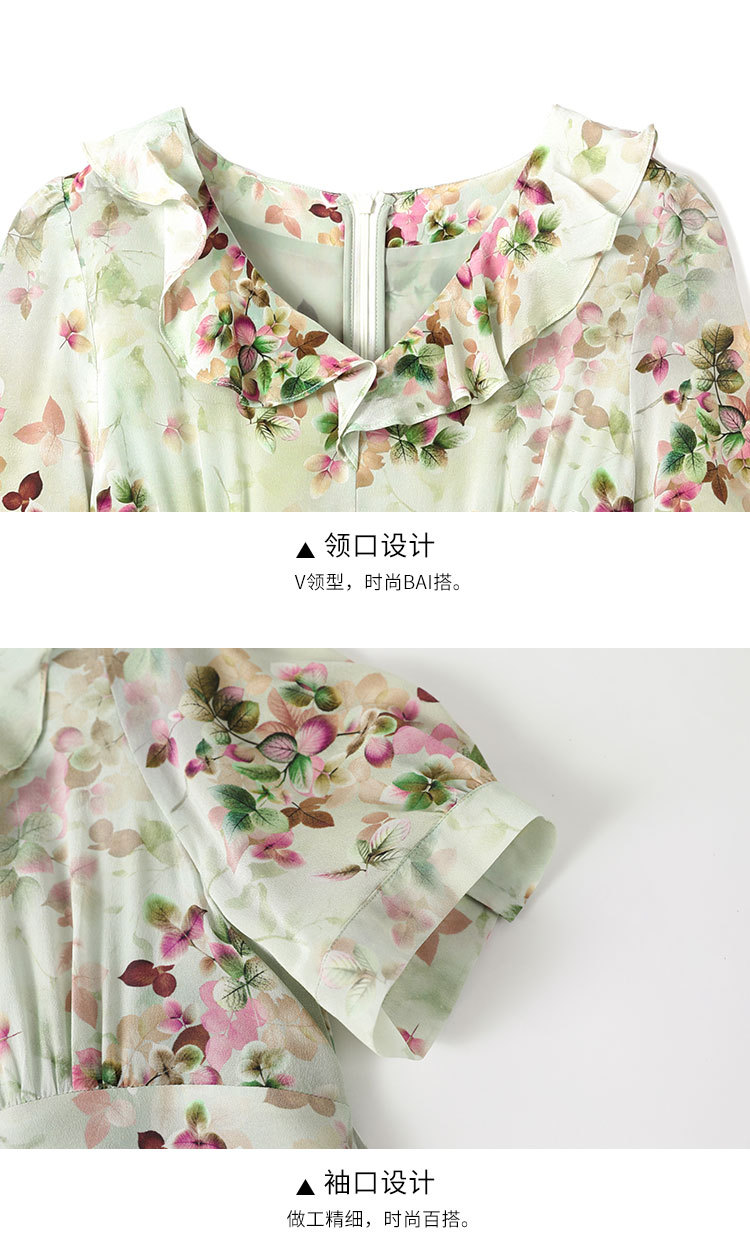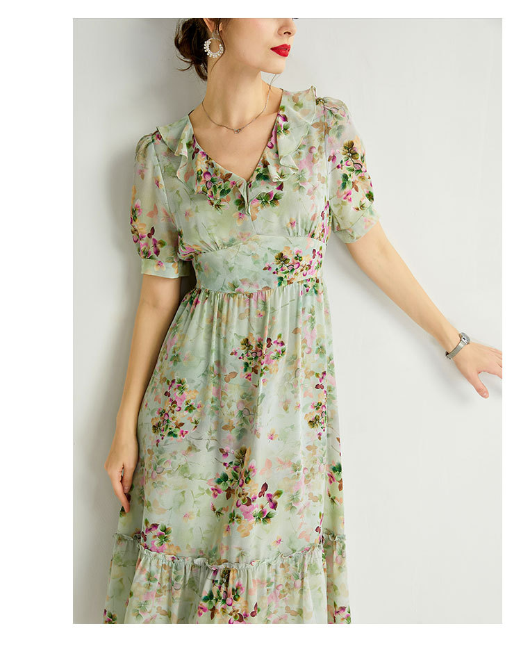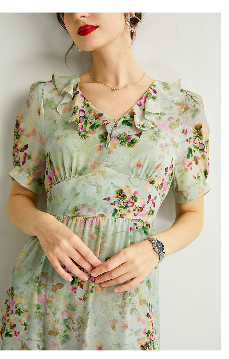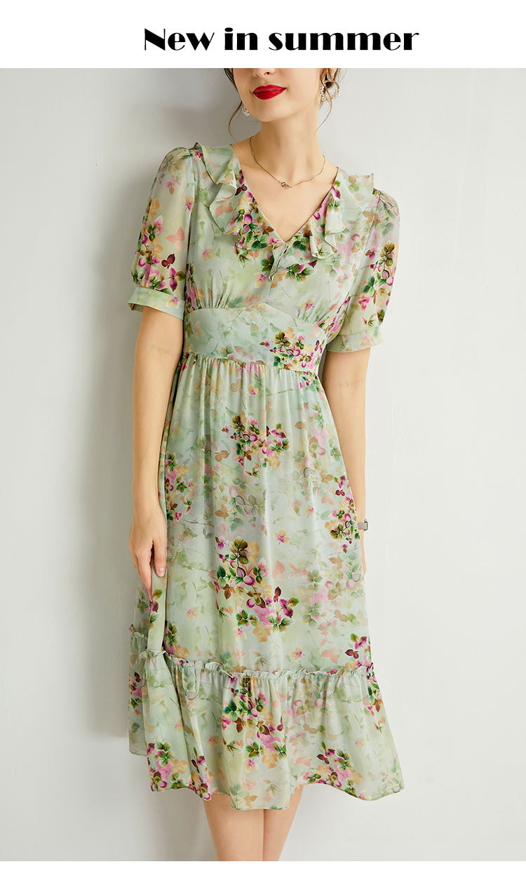 V字领时尚显瘦荷叶边,真丝桑蚕丝连衣裙KBN-230129