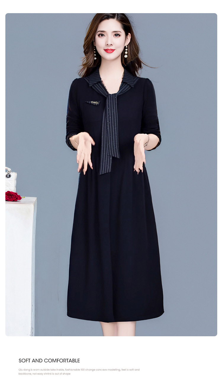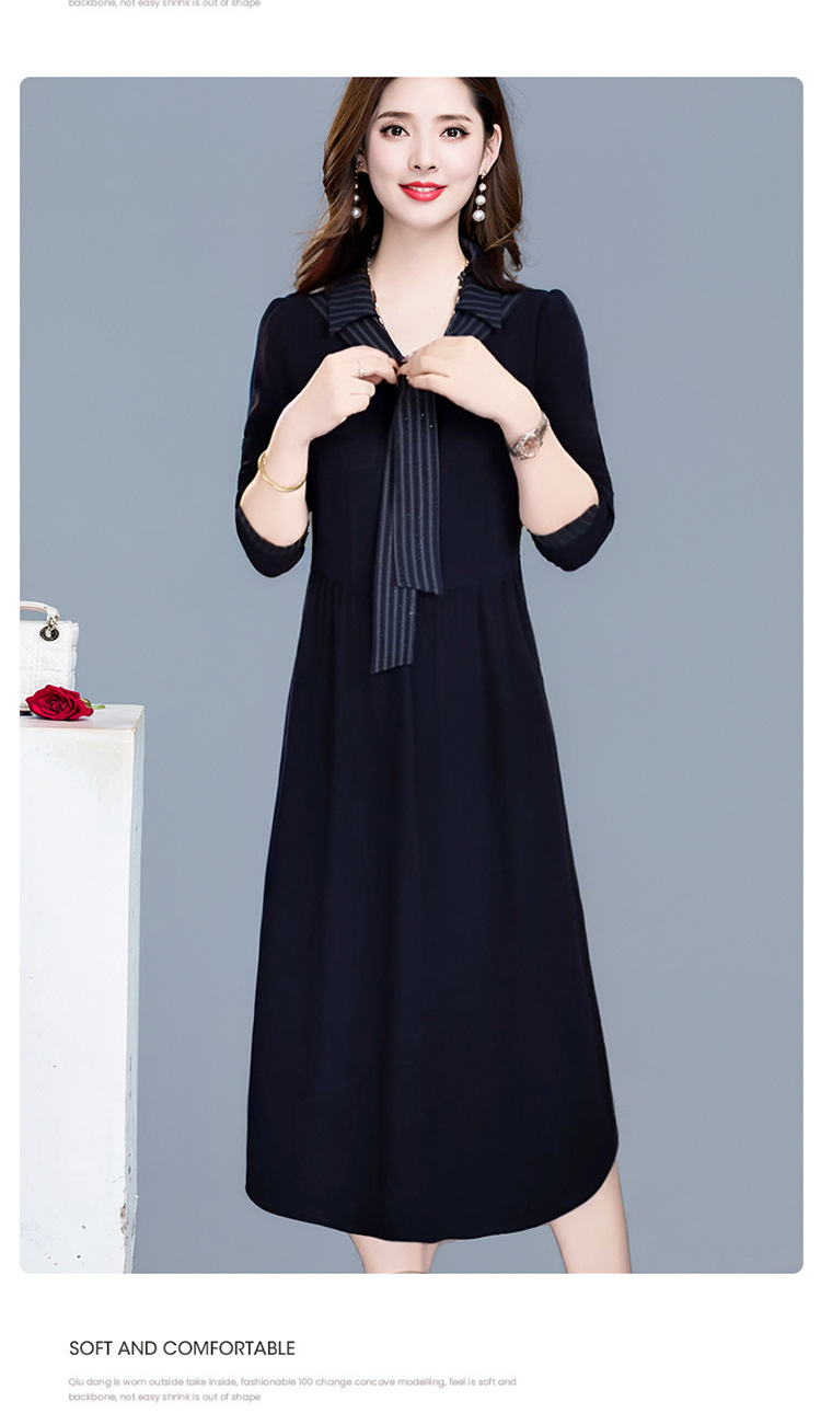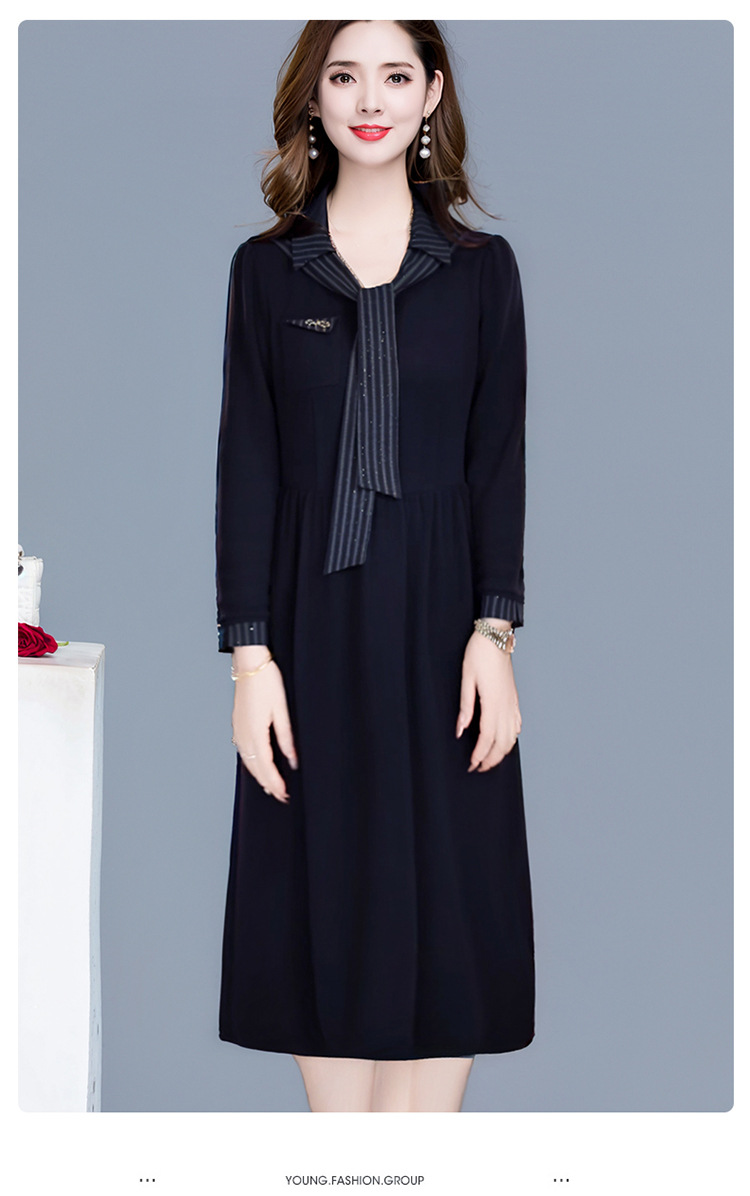 QYM 99H249-Y气质拼结条纹围巾领收腰连衣裙百褶裙A字裙