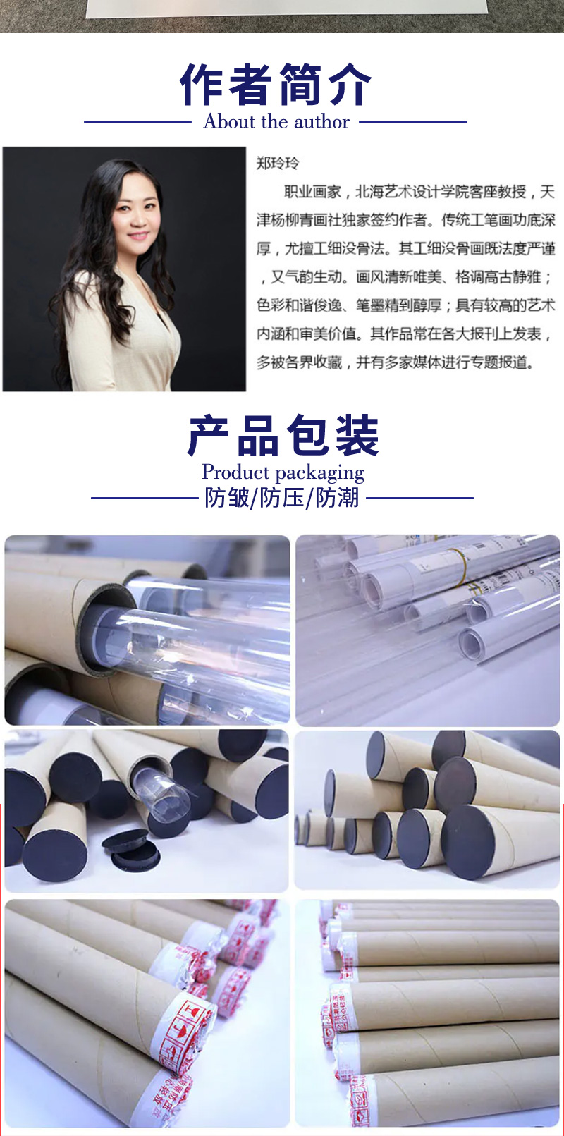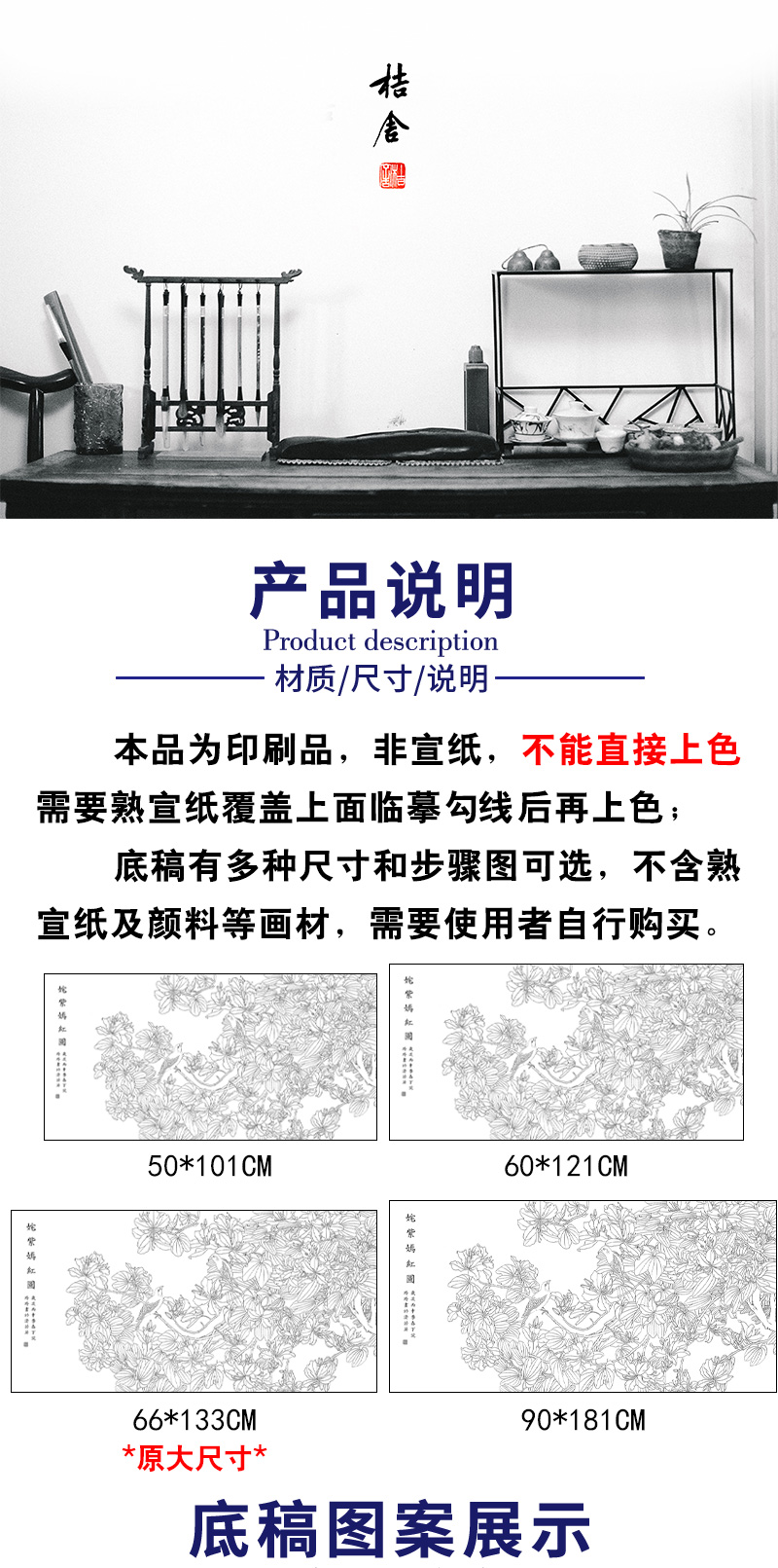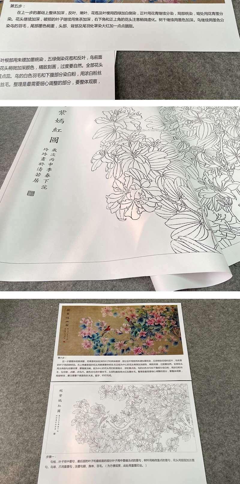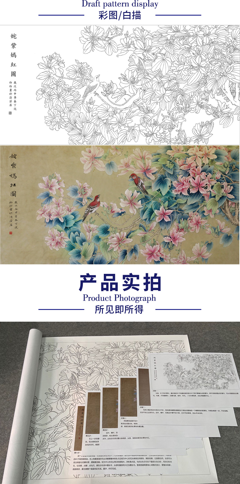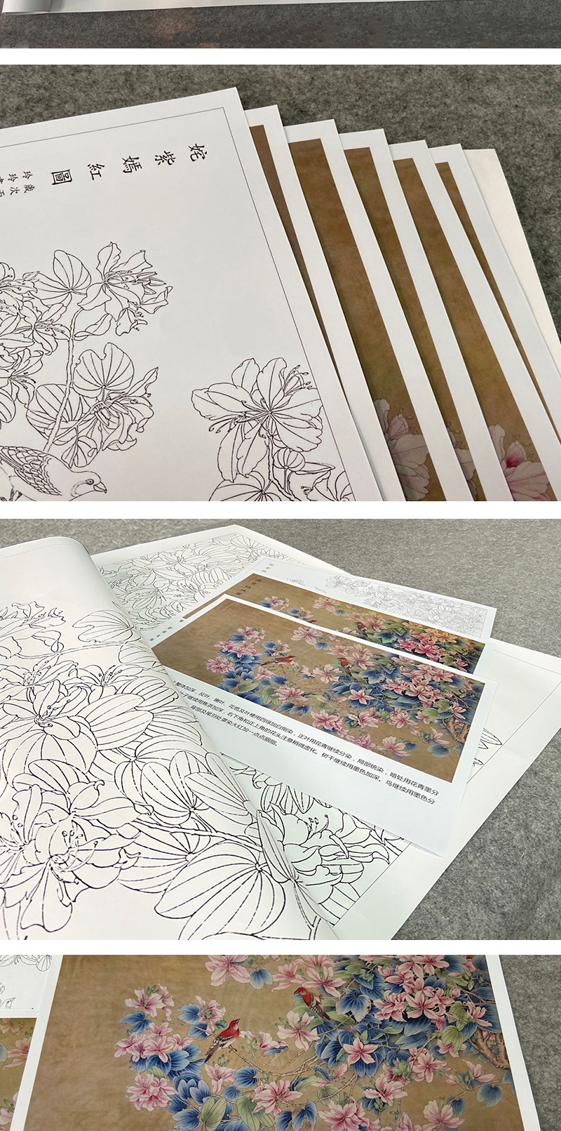 【有步骤、大彩图】郑玲玲横幅工笔画白描底稿《姹紫嫣红图》紫荆花初学者临摹花鸟线稿ZL94