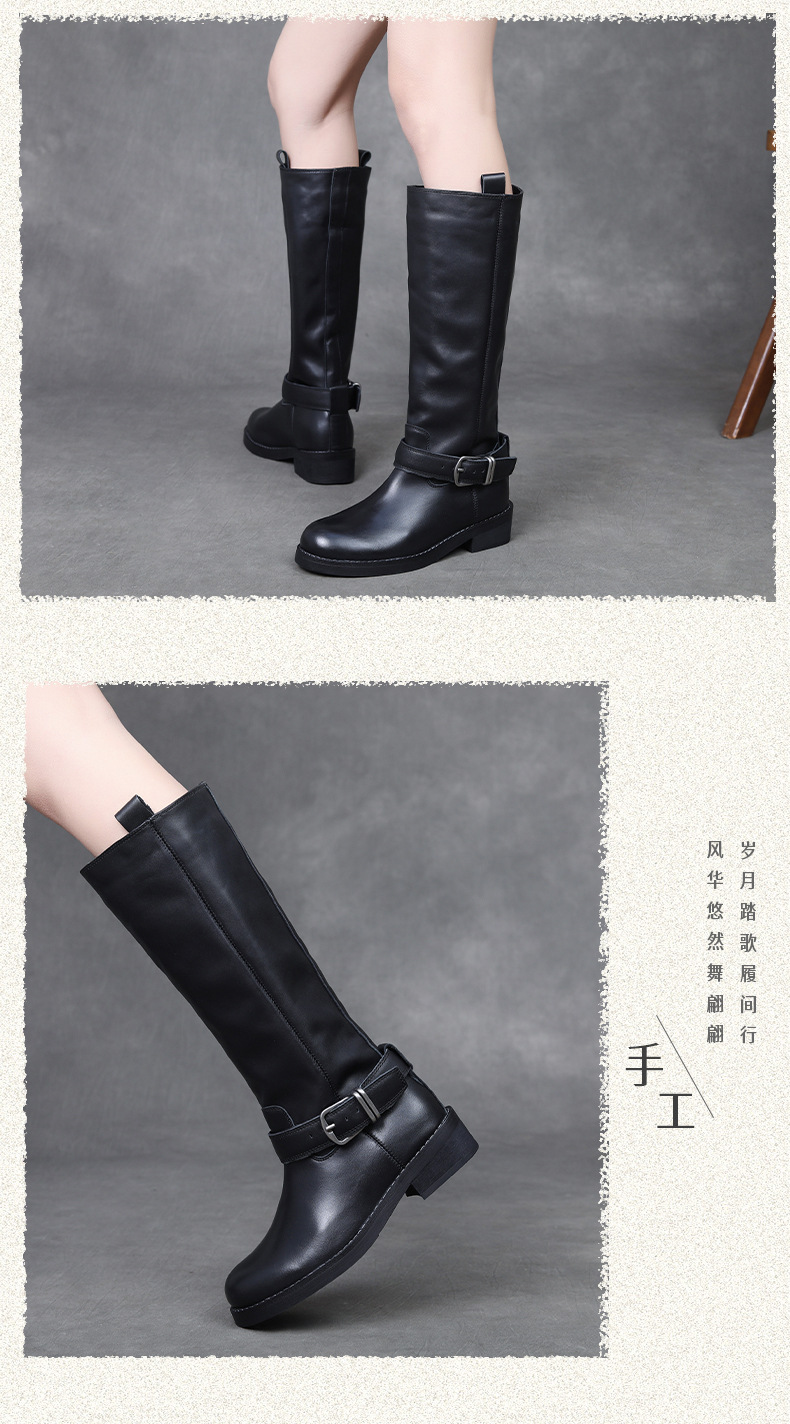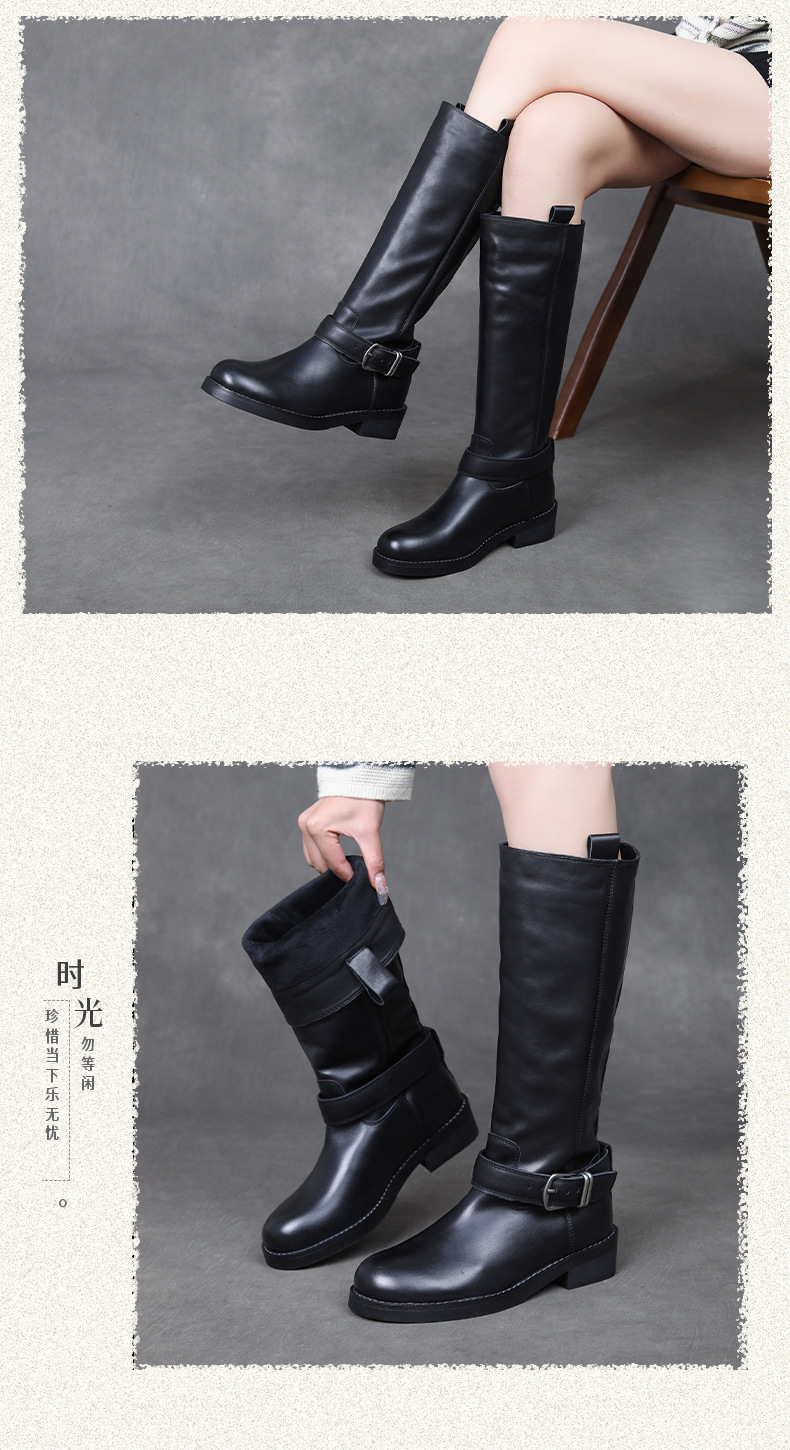 FR 85895骑士靴复古粗跟皮带扣百搭长筒靴马丁靴