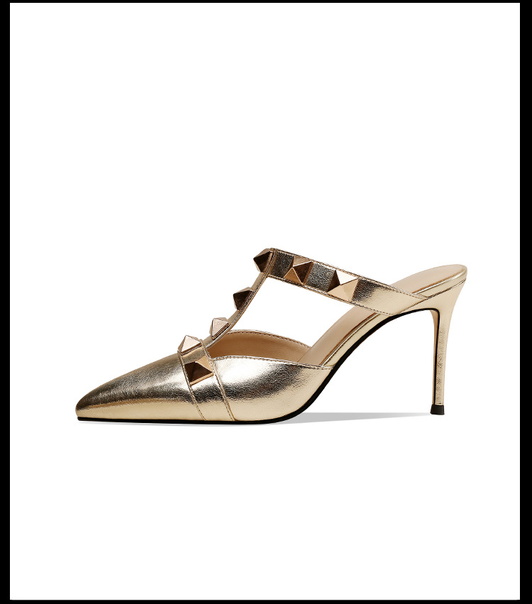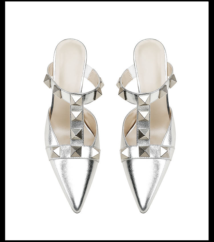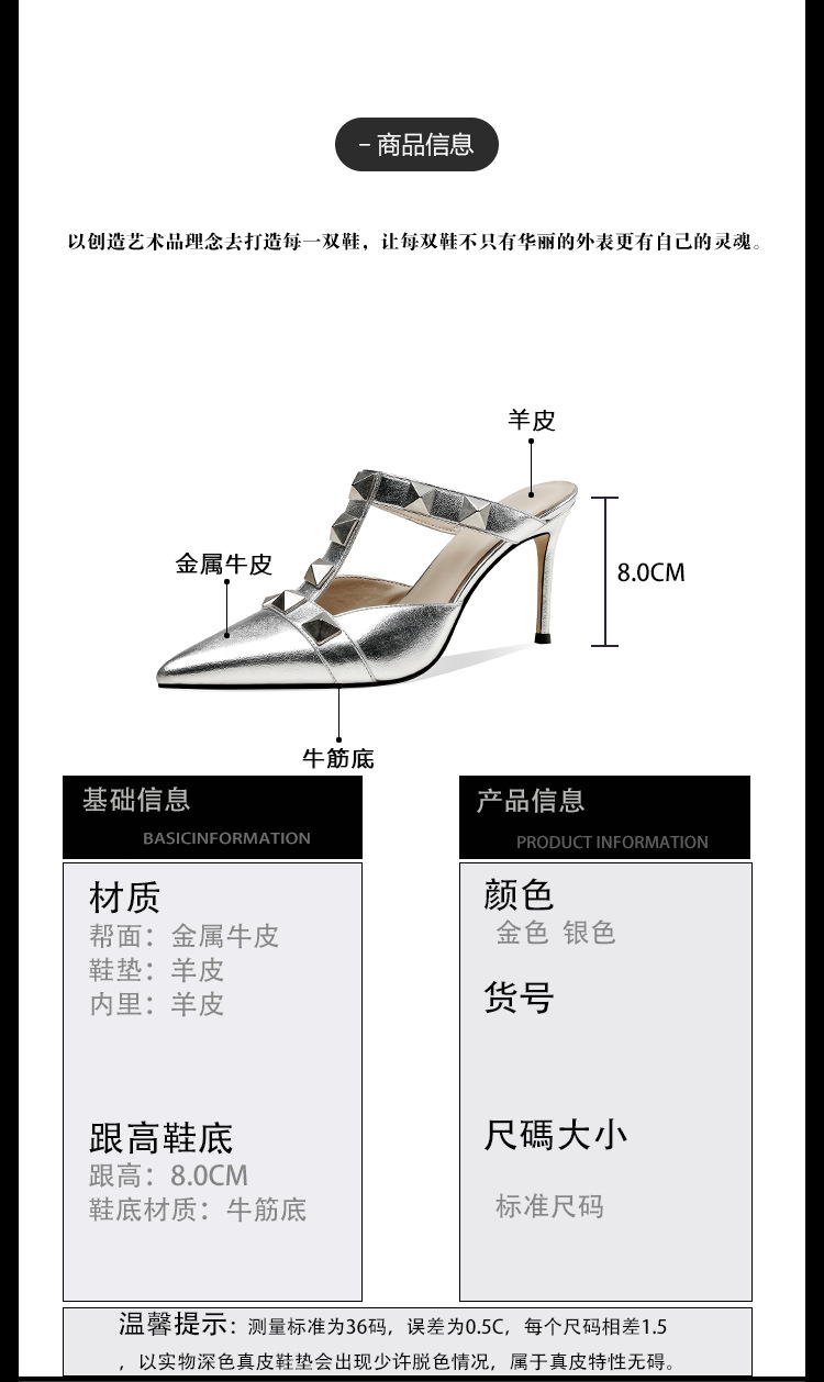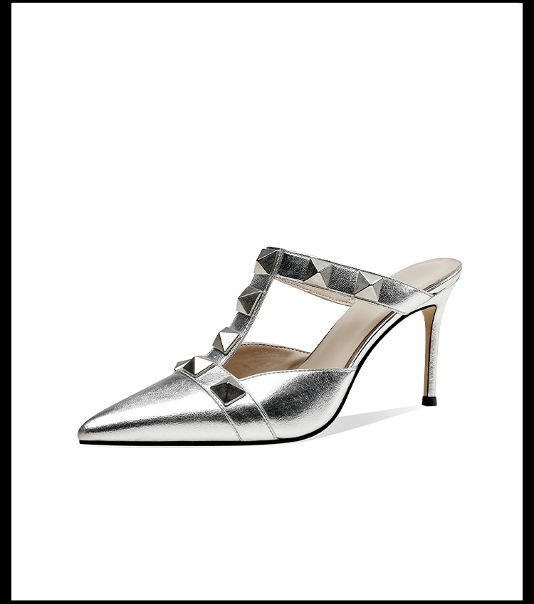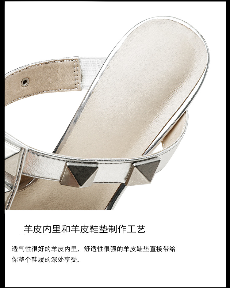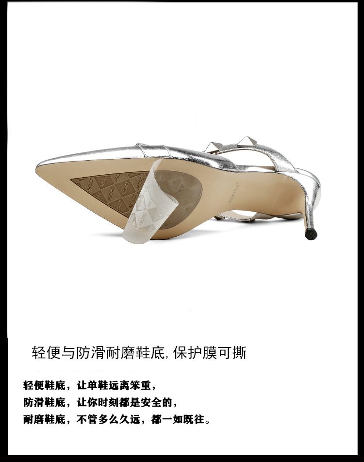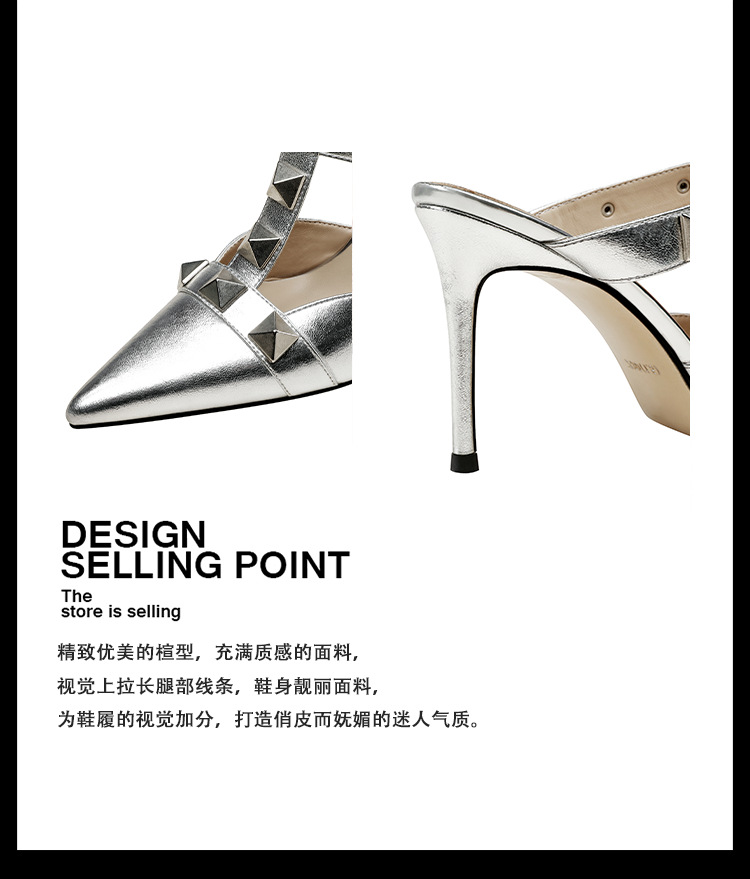 铆钉尖头高跟鞋,欧美柳丁细跟一字丁字带凉鞋女柳钉包头拖鞋女CX-51-7-1