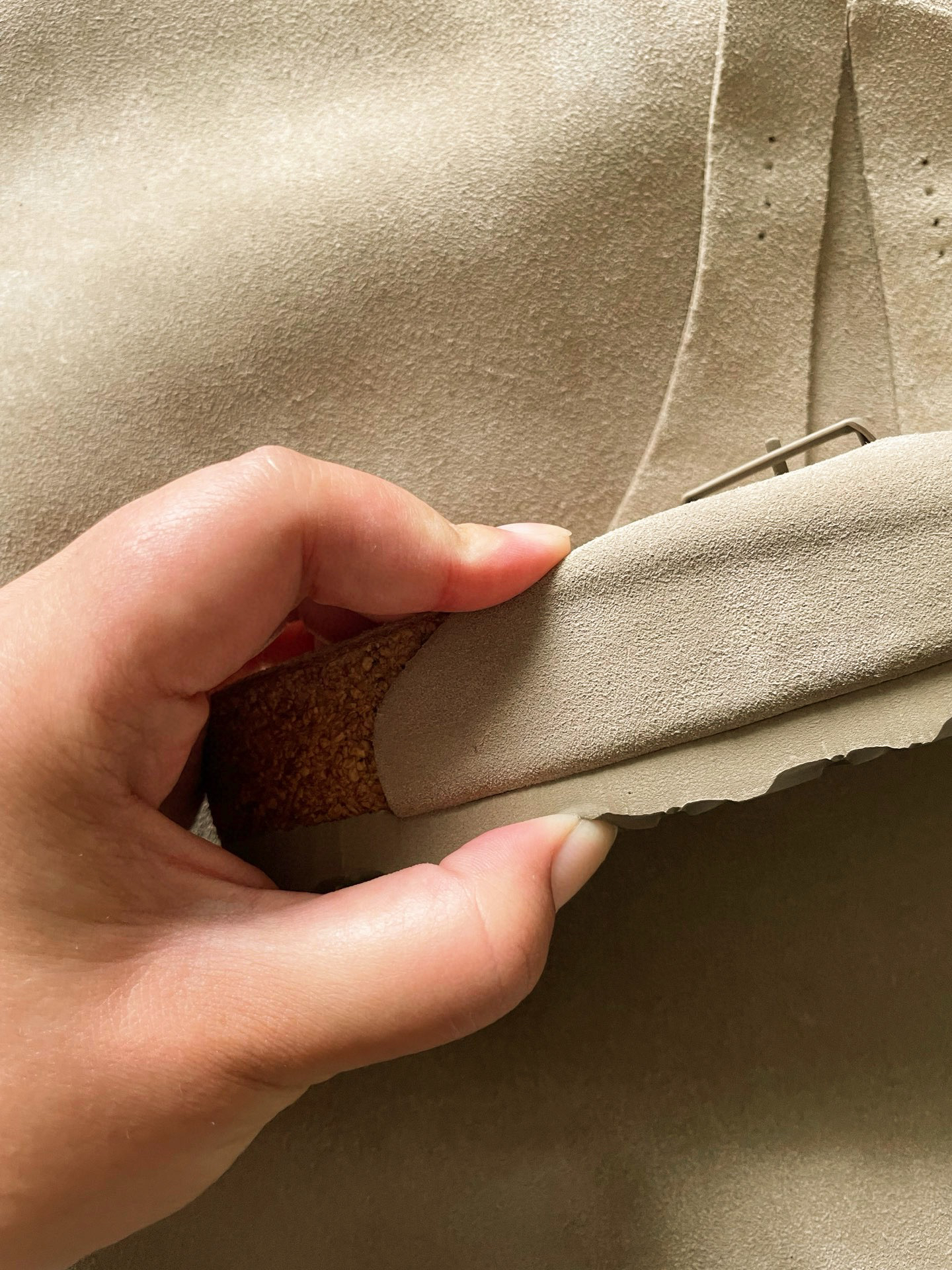 上下两层为黄麻,需要热压而一次成型,包括垫脚位置的牛皮也是高丝光的,在热压过程中直接复合。而不是手工贴皮,所以我们的勃肯会越穿越随脚🦶鞋型🔺🔺真正的灵魂所在
