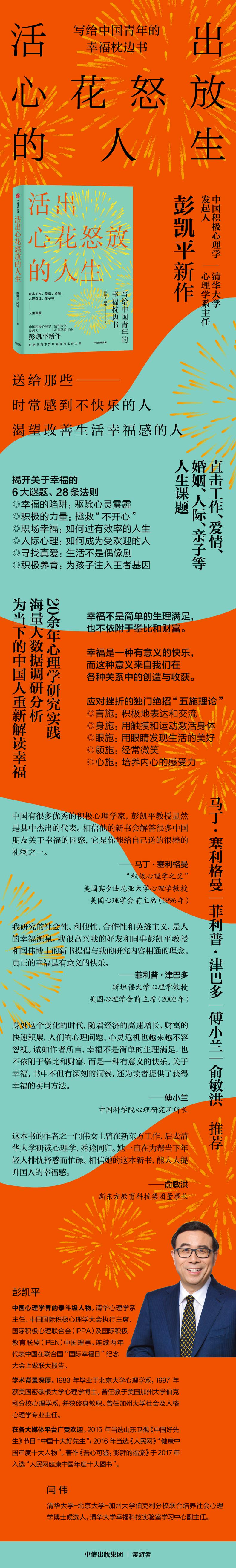 生活在这个时代的我们,本该是幸福的,物质充盈、信息发达……然而,我们中的大多数人时常感到焦虑、烦躁、沮丧、难以专注,也因此丧失了对幸福的感知。 清华大学心理学系主任彭凯平教授结合20余年的心理学研究实践,对比了中西方文化看待幸福的差异性,为当下的中国人重新解读幸福。幸福不是简单的生理满足,也不依附于攀比和财富。幸福是一种有意义的快乐,而这种意义来自我们在工作、爱情、婚姻、人际交往、亲子等人生课题中的创造与收获。 在这本书中,作者用理性思辨的语言、丰富接地气的实验案例,揭开关于幸福的六大谜题、28条法则: 幸福的陷阱:驱除心灵雾霾 积极的力量:拯救“不开心” 职场幸福:如何过有效率的人生 人际心理:如何成为受欢迎的人 寻找真爱:生活不是偶像剧 积极养育:为孩子注入王者基因 书中还提到了应对挫折的独门绝招“五施理论”。彭凯平教授认为,刻意练习这五个简单的行为,你就能从日常小事中持续获得幸福。 言施:积极地表达和交流 身施:用触摸和运动激活身体 眼施:用眼睛发现生活的美好 颜施:经常微笑 心施:培养内心的感受力 相信读完这本书,你会重新审视自我,过一个有意义的幸福人生。