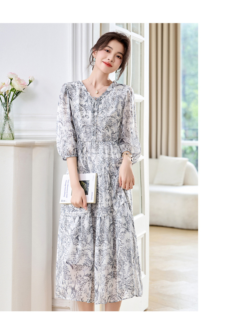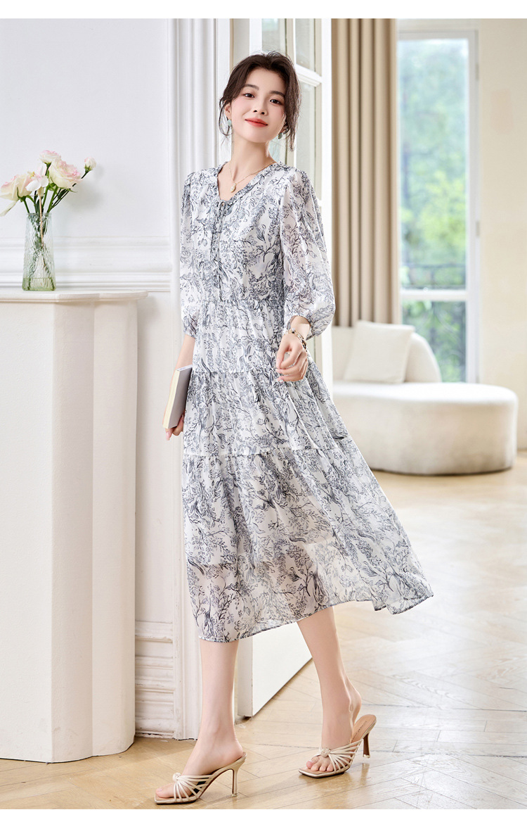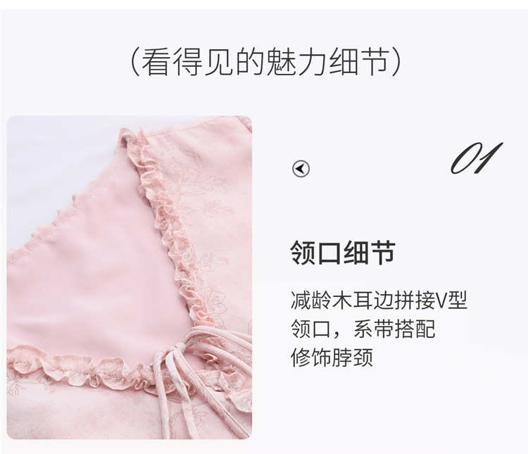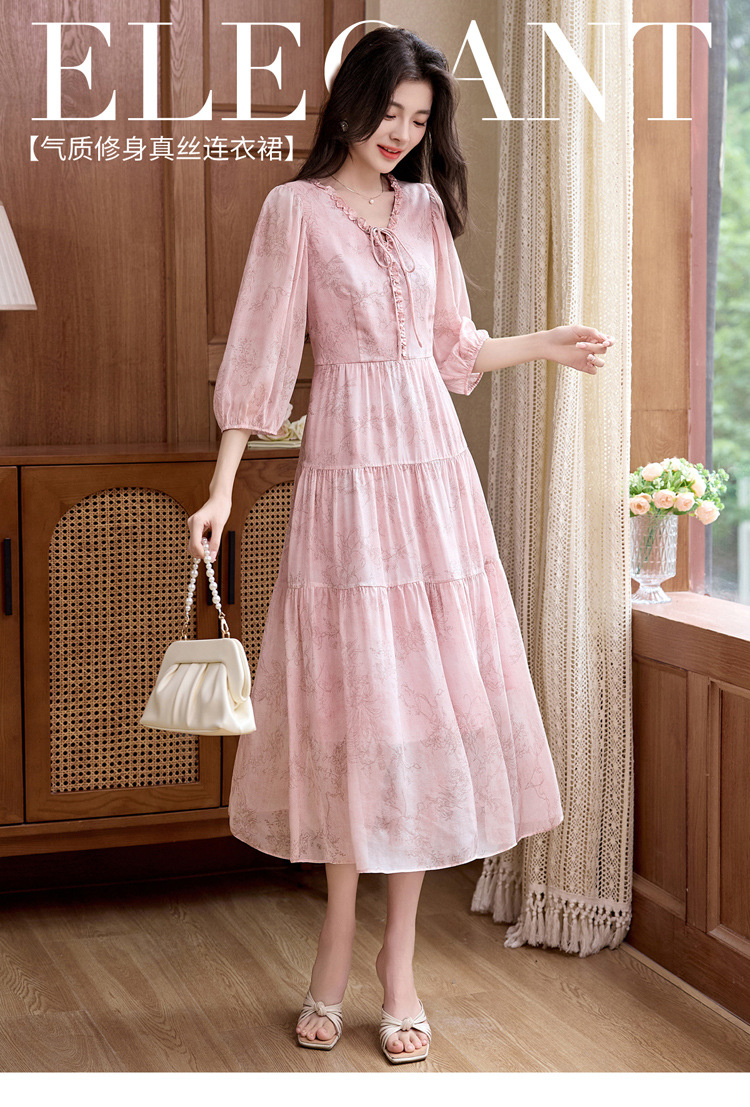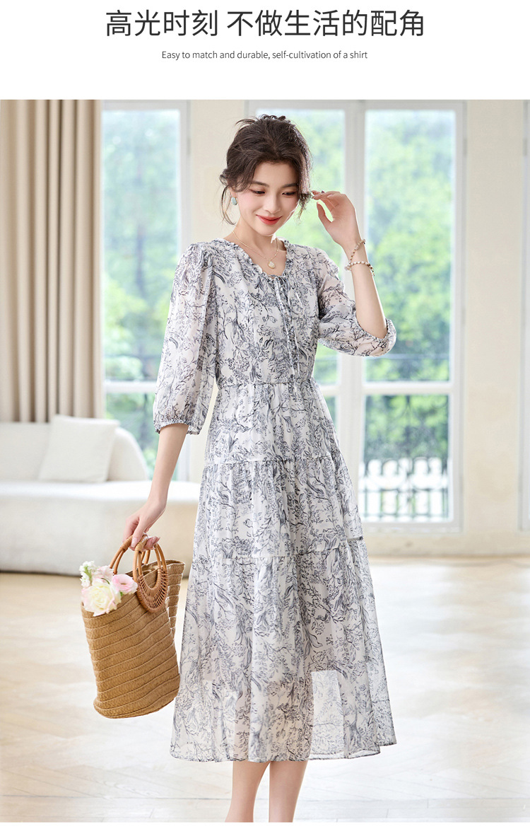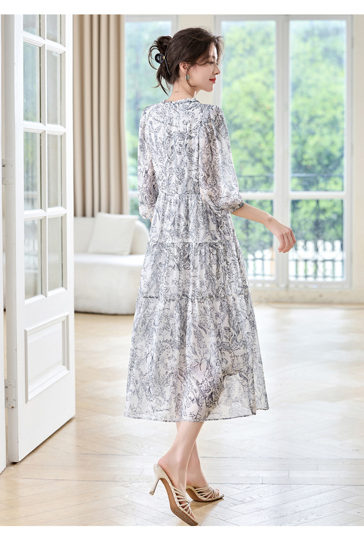 丁摩 印花木耳边时尚V领真丝连衣裙25029