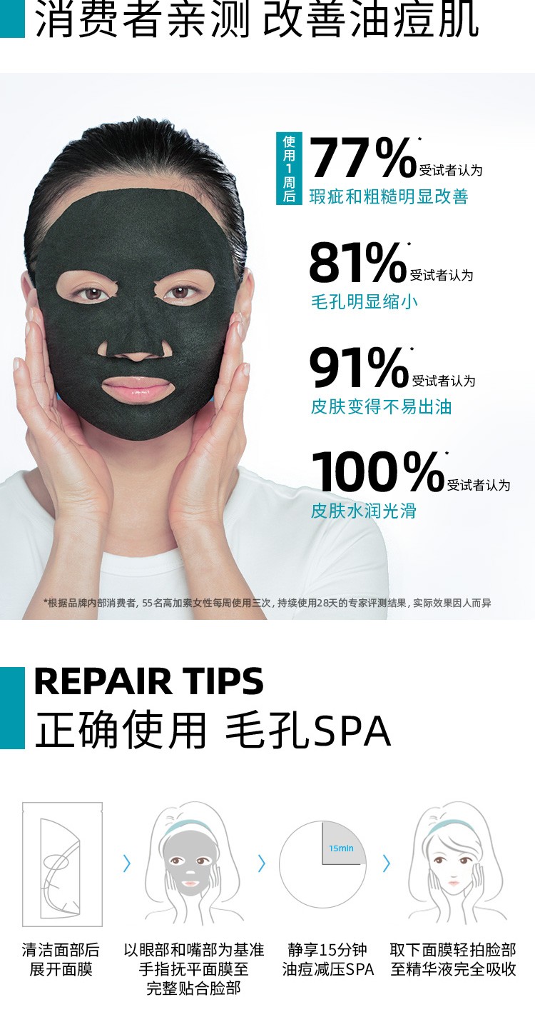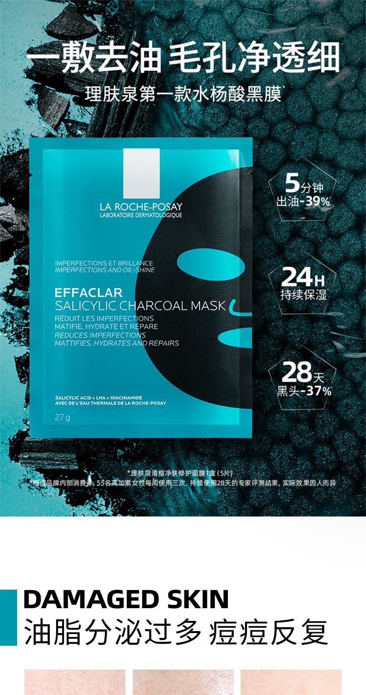 理肤泉清痘净肤修护面膜27g*5片 水杨酸黑膜控油细毛孔祛痘去角质