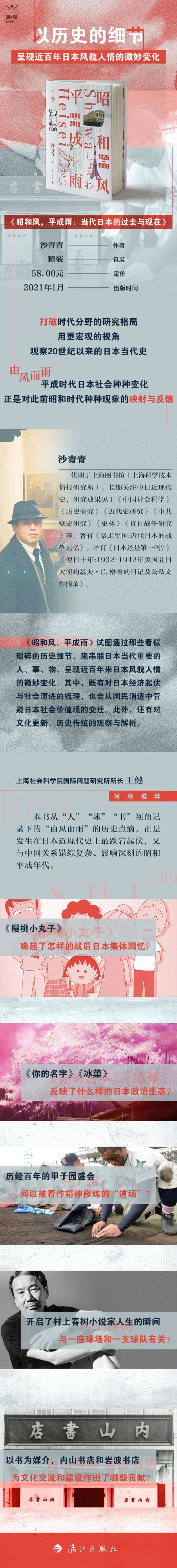 《昭和风,平成雨》试图通过那些看似琐碎的历史细节,来串联日本当代重要的人、事、物,呈现近百年来日本风貌人情的微妙变化。其中,既有对日本经济起伏与社会演进的梳理,也会从国民消遣中管窥日本社会价值观的变迁。此外,还有对文化更新、历史传统的观察与解析。